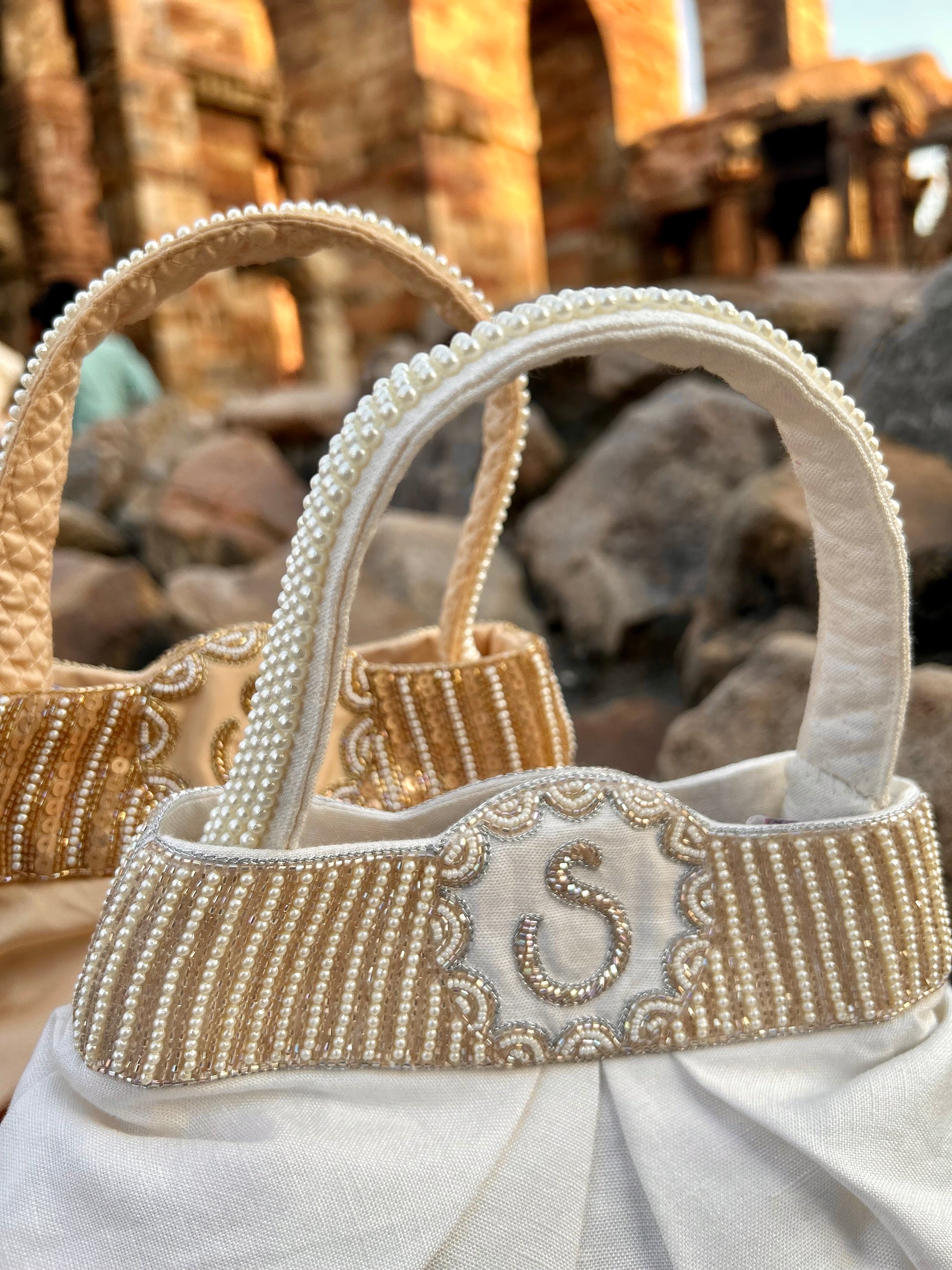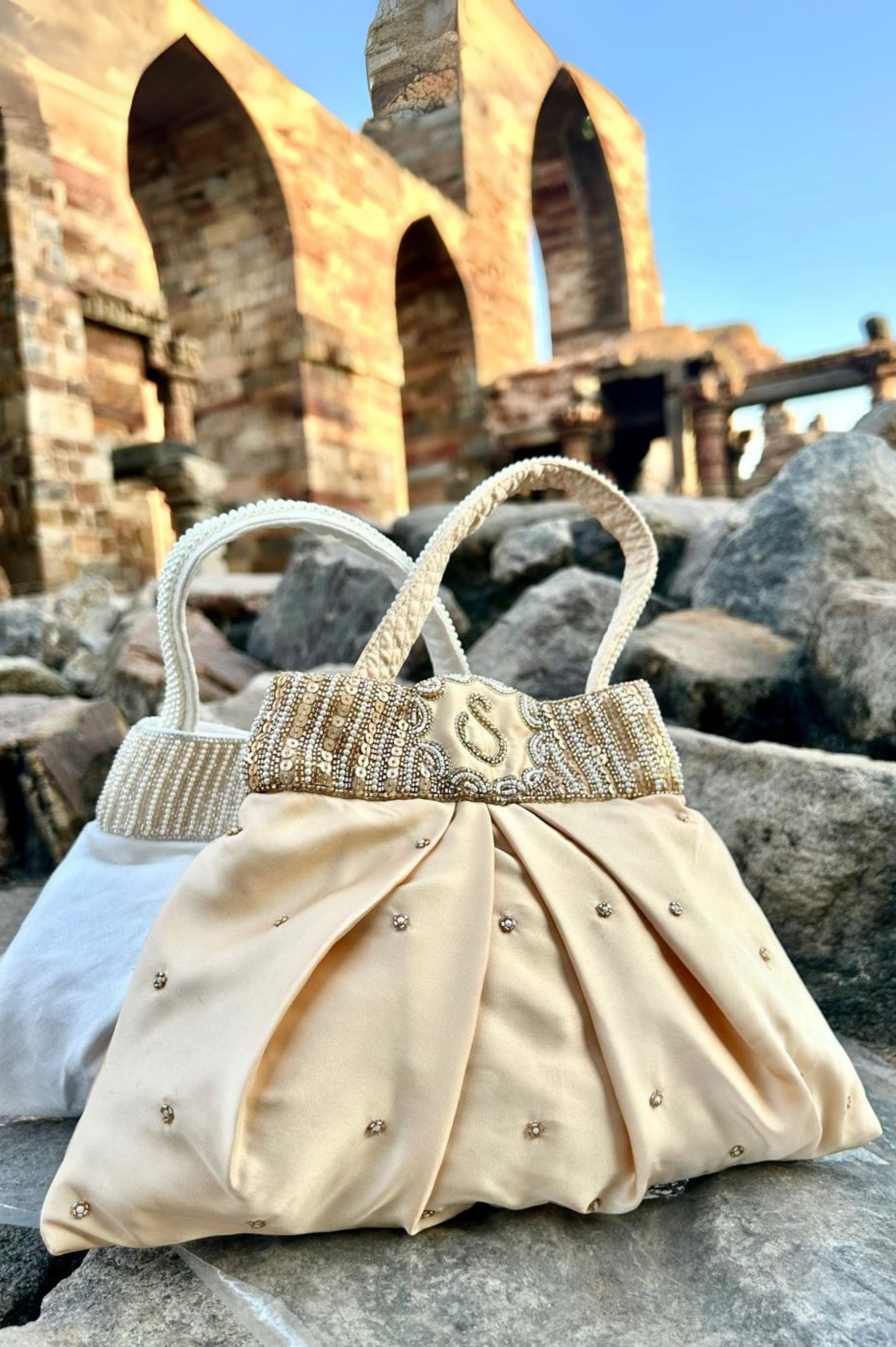 This elegant hand- embroidered golden satin clutch bag with handle features intricate & ornate details. Luxurious satin fabric & gold embroidery creates a stunning combination for formal occasions.
