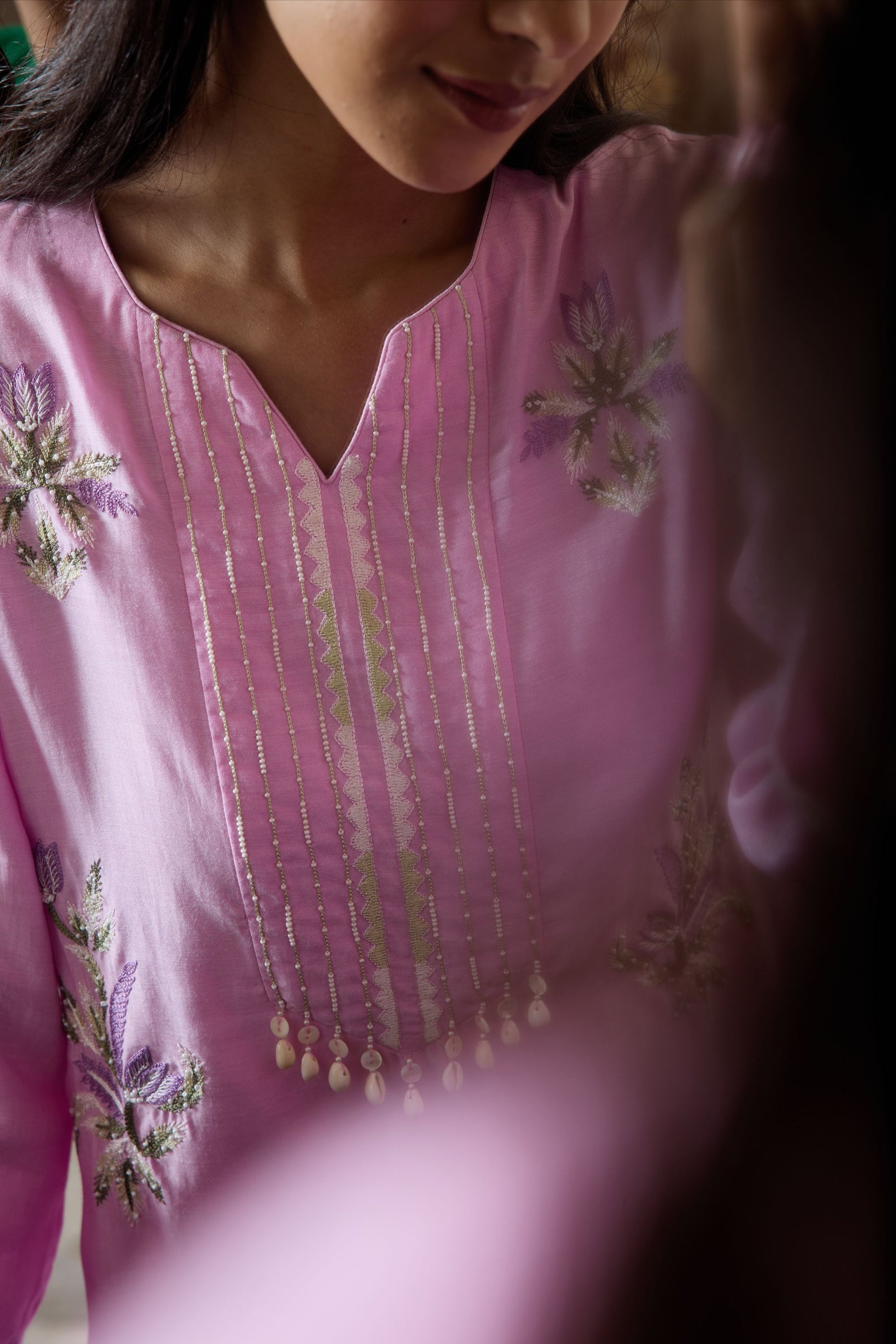 A beautifully crafted taffy pink two-piece ensemble featuring a hand-embroidered cotton silk kurta paired with relaxed-fit pants. The kurta is designed with a notched neckline, full-length sleeves, and a delicate back keyhole opening. Intricate Resham embroidery, bead embellishments, and decorative cowrie shell accents add artisanal charm. Finished with a soft mulmul lining, this set offers breathable comfort with an elegant festive appeal.