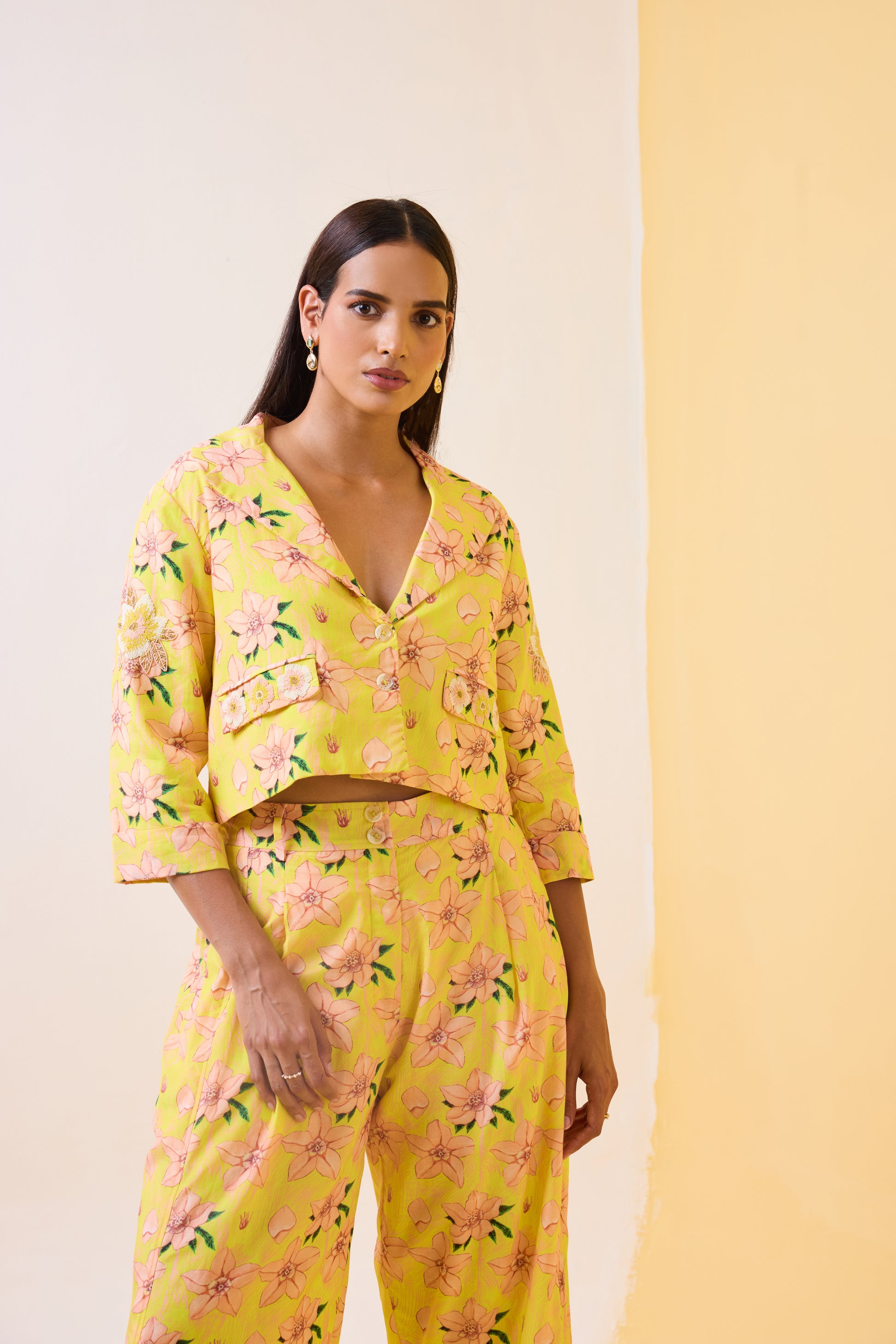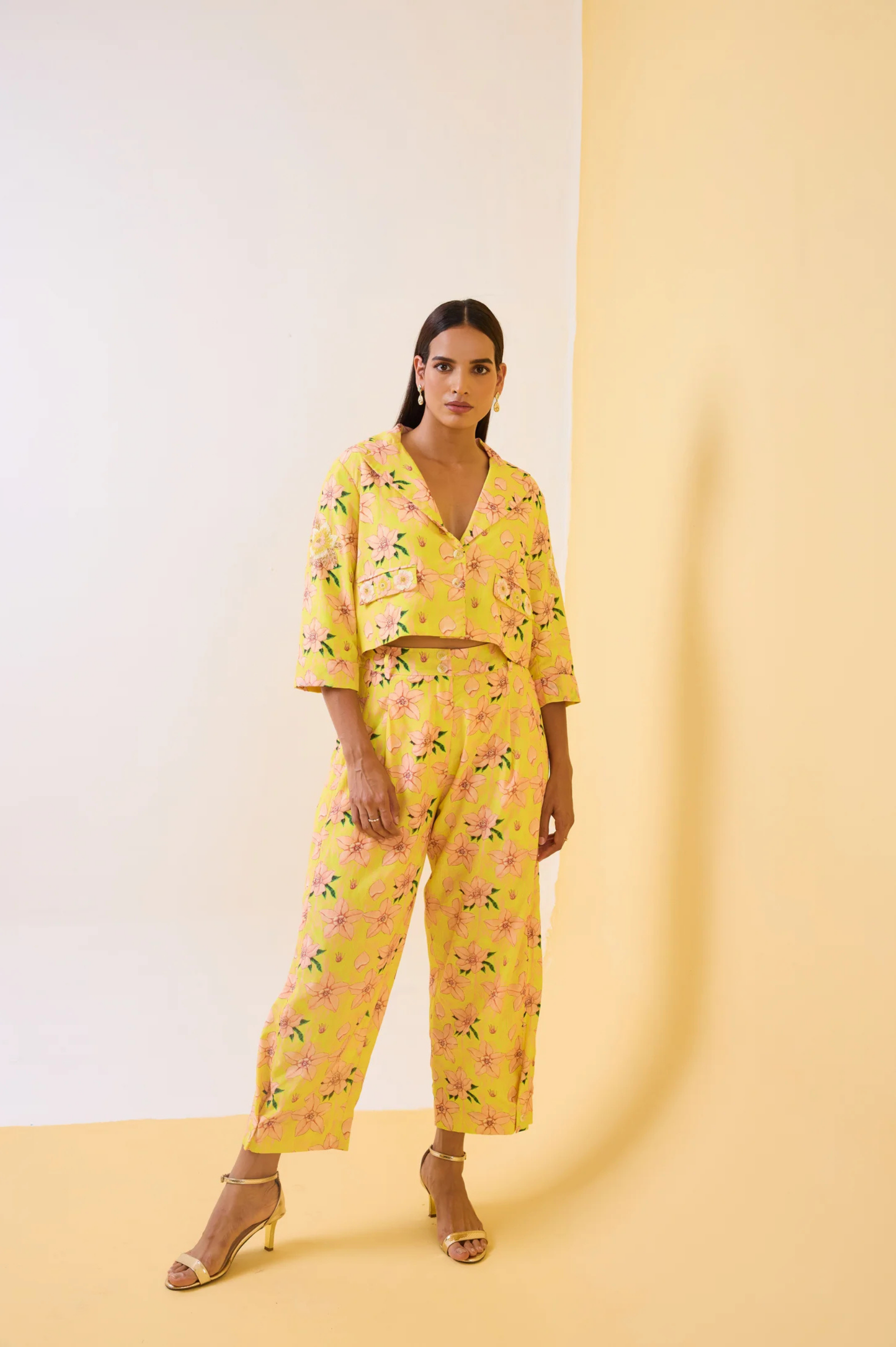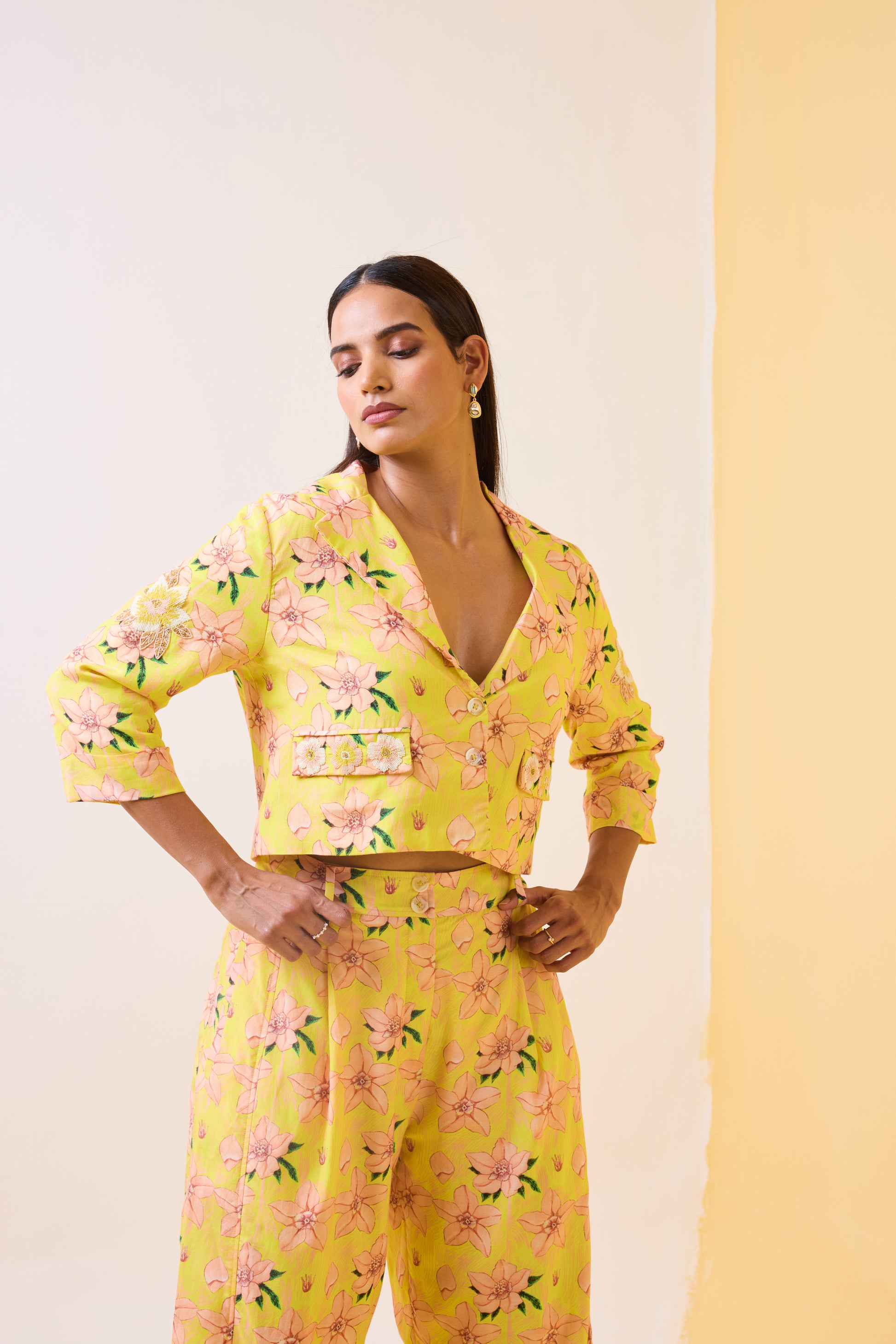 Our butter yellow forest co-ord set, crafted from luxurious cotton silk, blends timeless elegance with modern style. The cropped blazer features intricate hand embroidery details, flap pockets in the front, and ¾ sleeves, making it a standout piece. The pleated pants, designed with a front zipper and hook openings, include button details at the hem for added flair. This set is lined with cotton silk and mulmul for comfort and a polished finish.