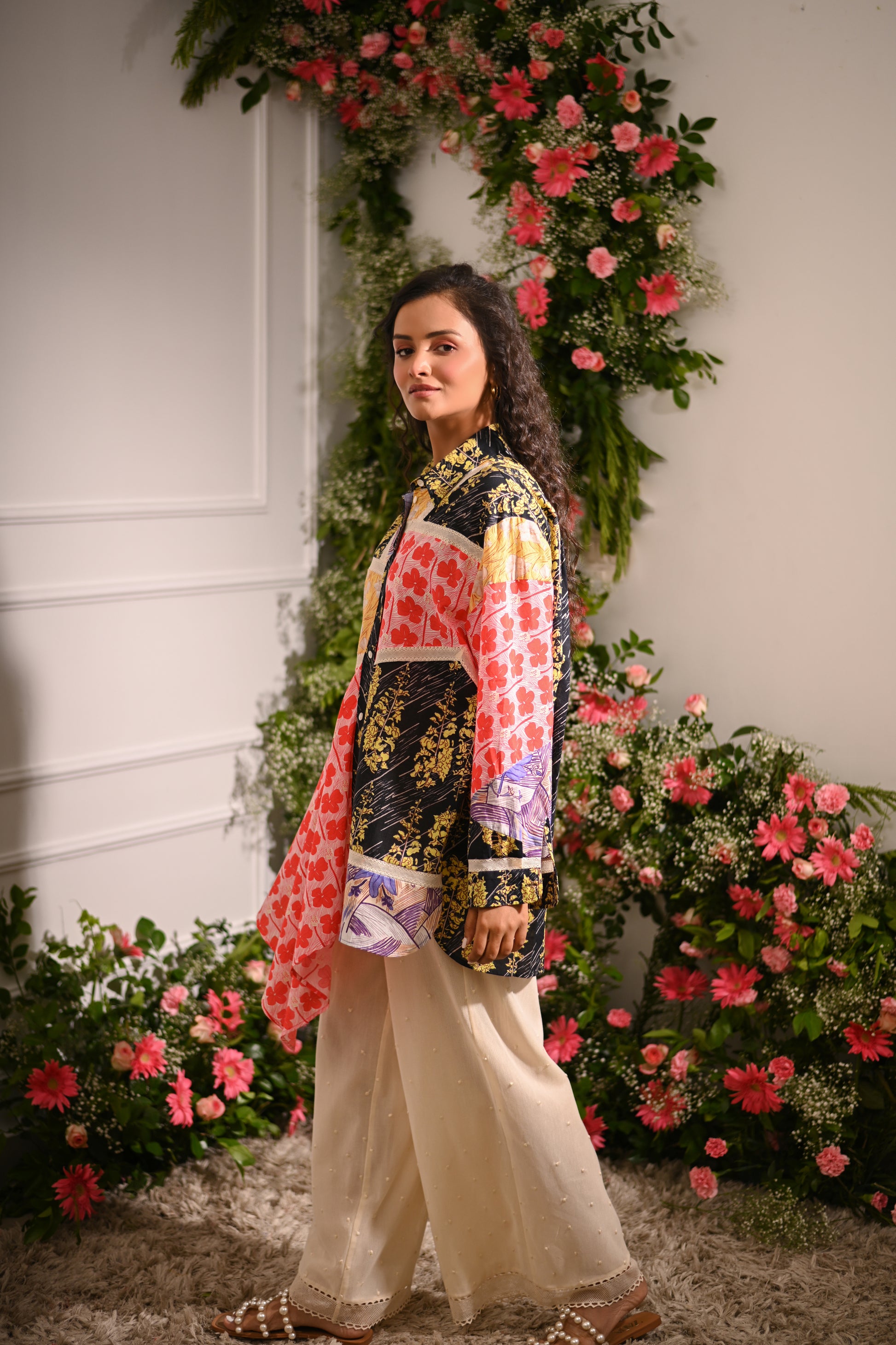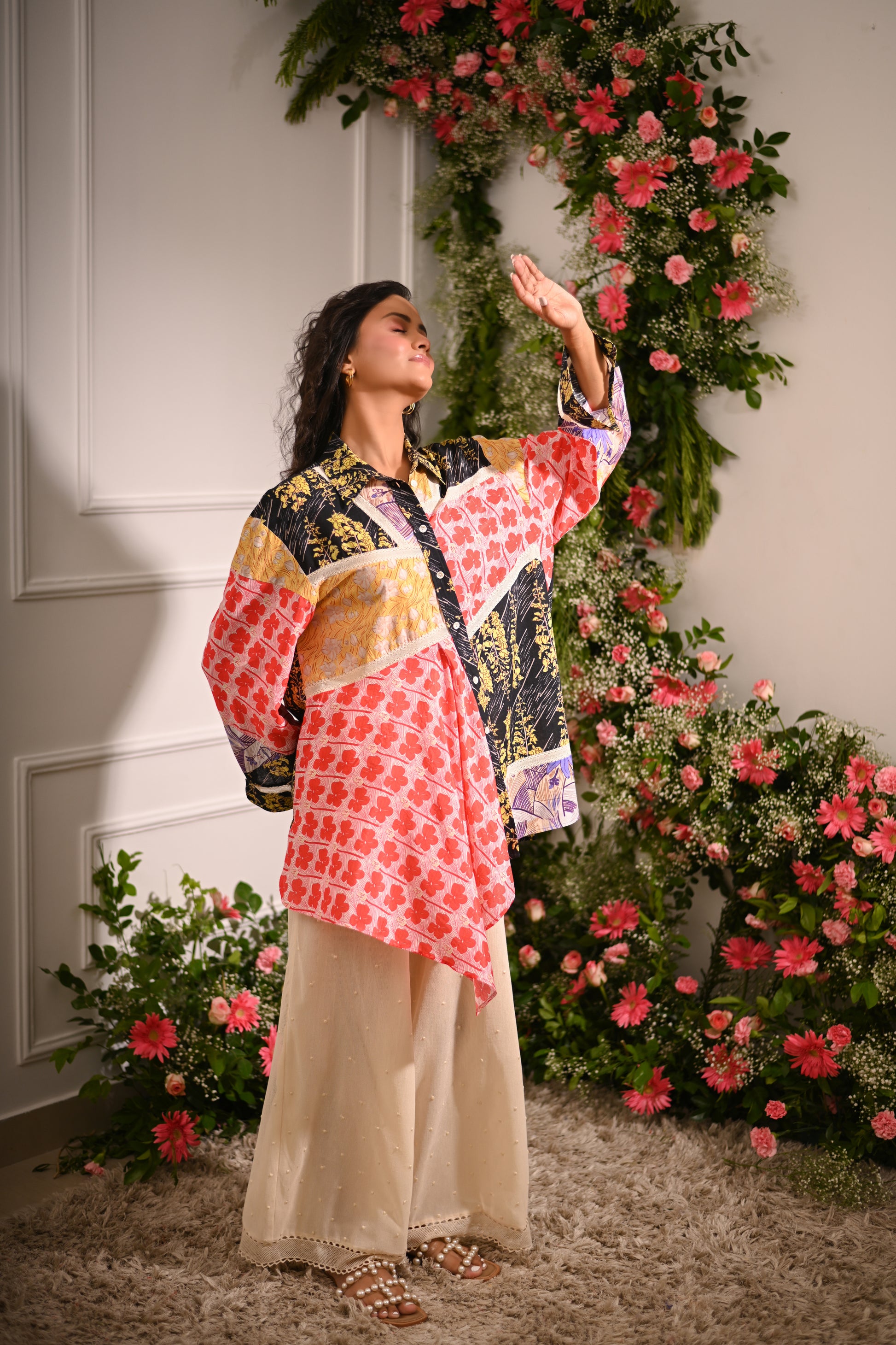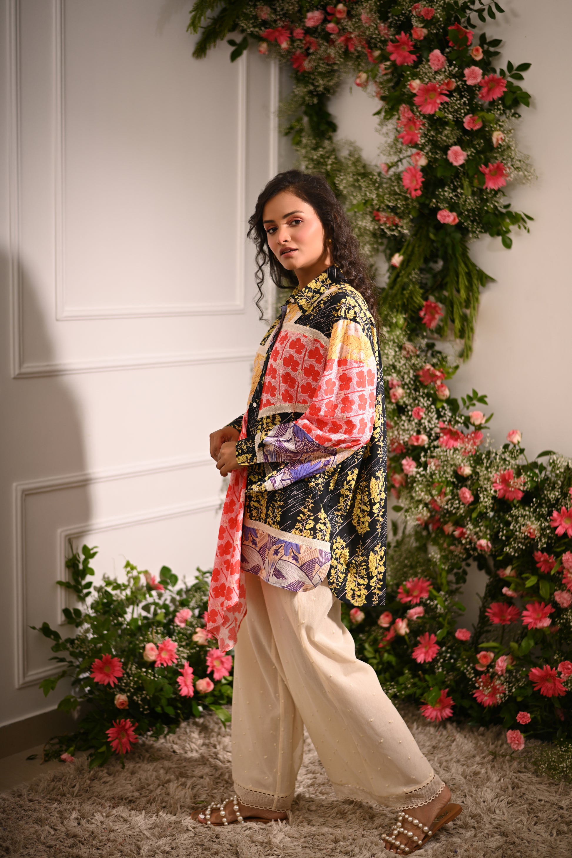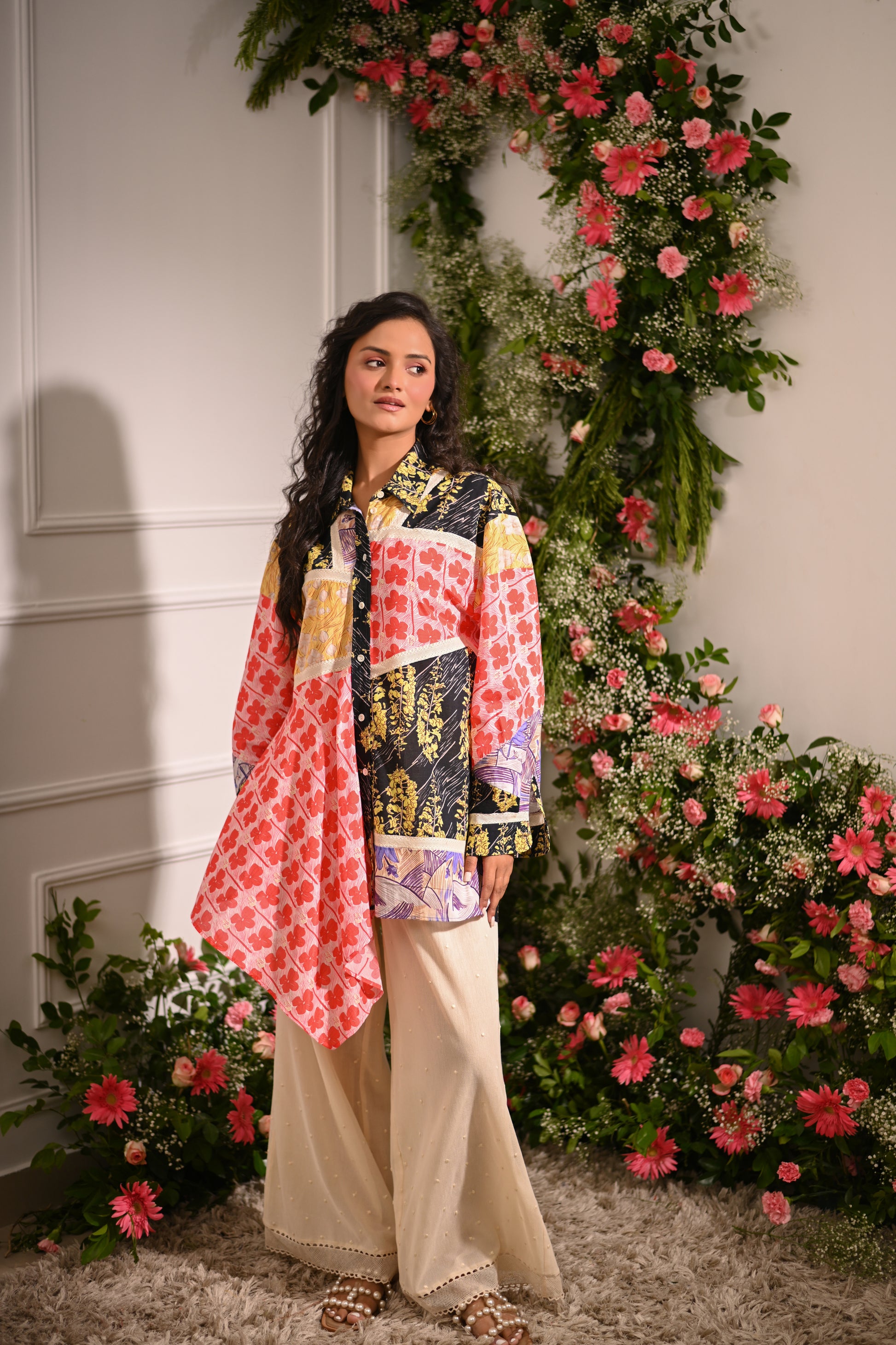 Our multicoloured oversized patchwork asymmetric button-up collared shirt, crafted from a mix of cotton silk, and cotton cambric, and adorned with mulmul lining and lace details, offers a statement-making look. Paired with off-white embroidered pyjama-style trousers in cotton net (tulle) with a full elastic waistband, this set blends eclectic style with comfort.