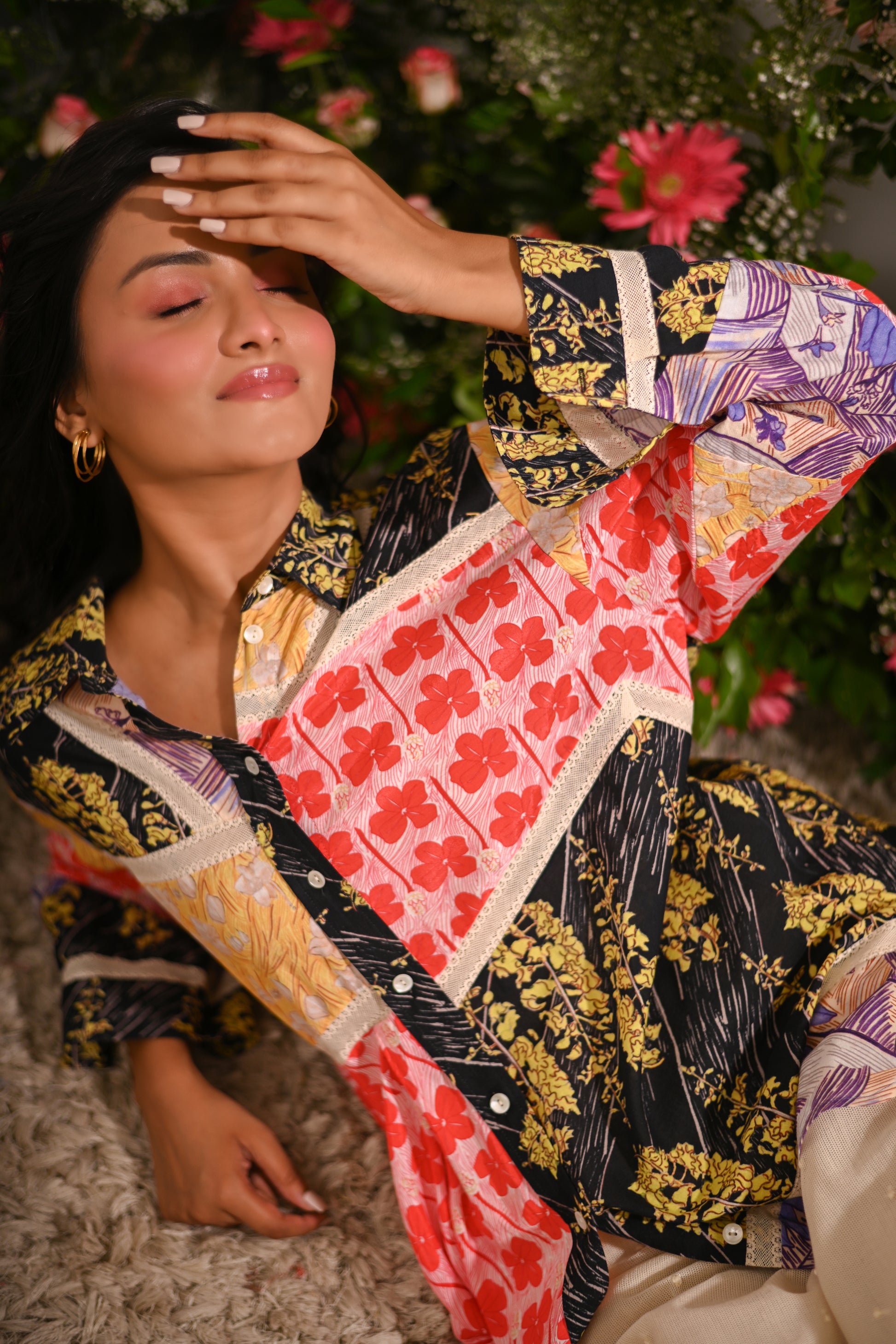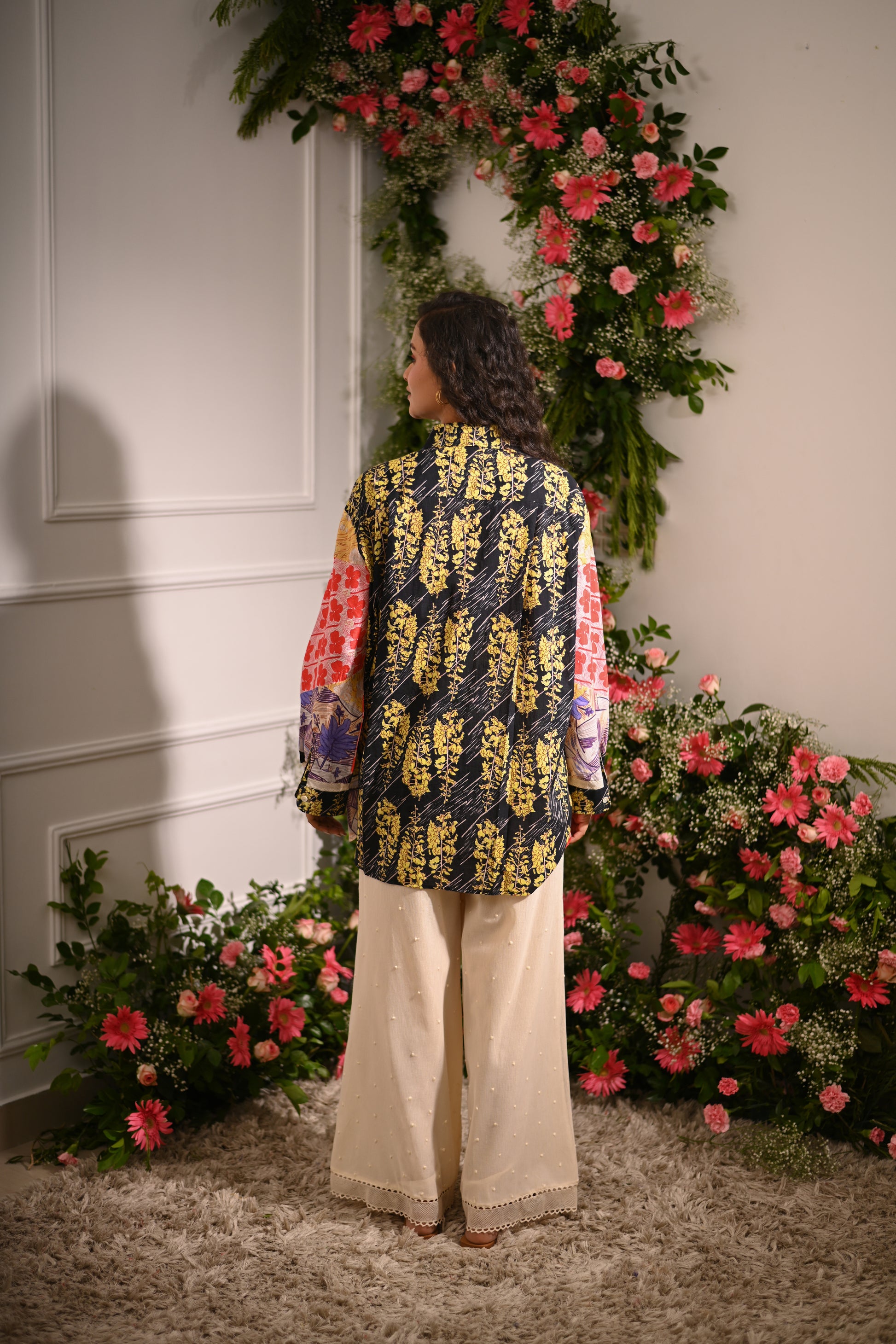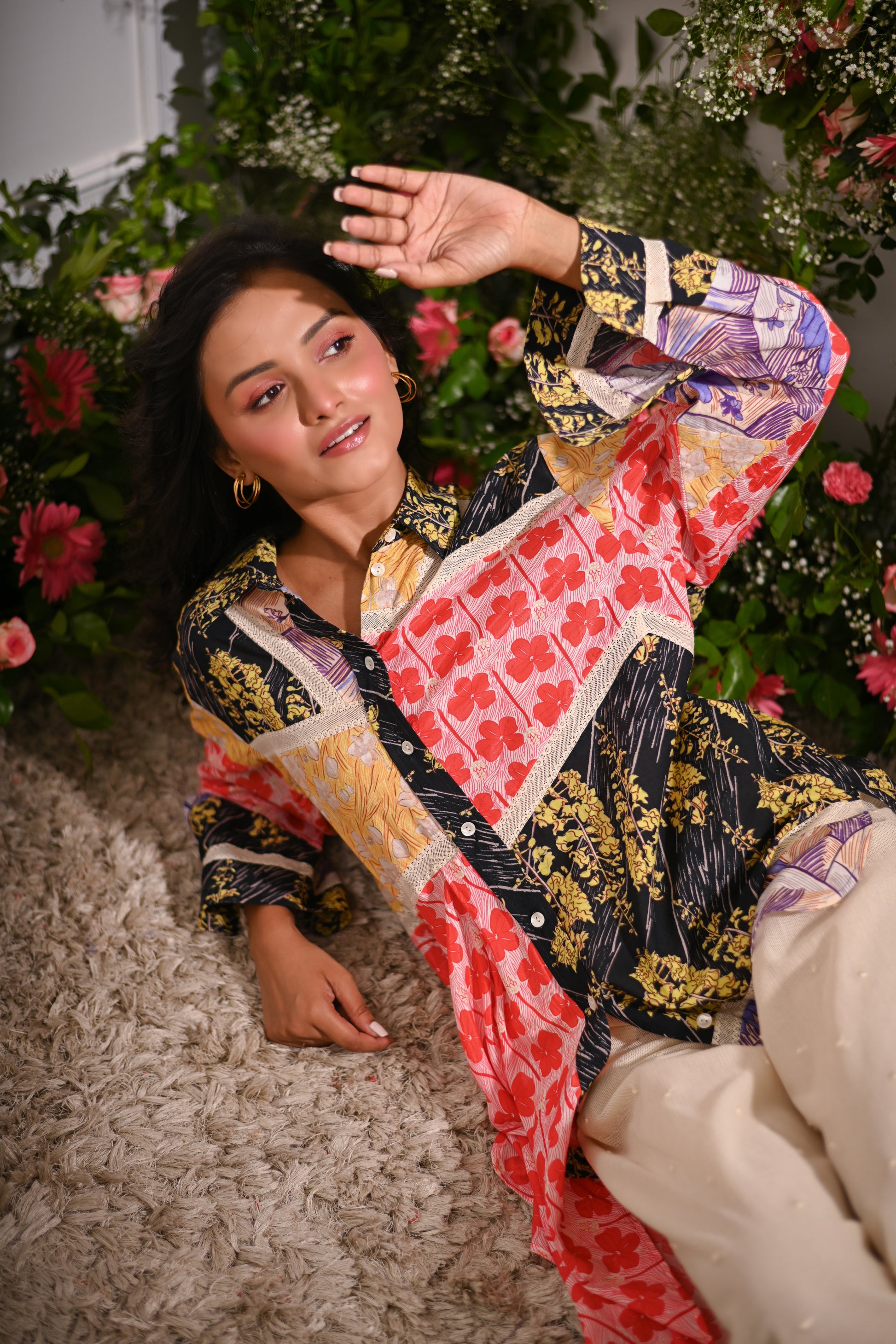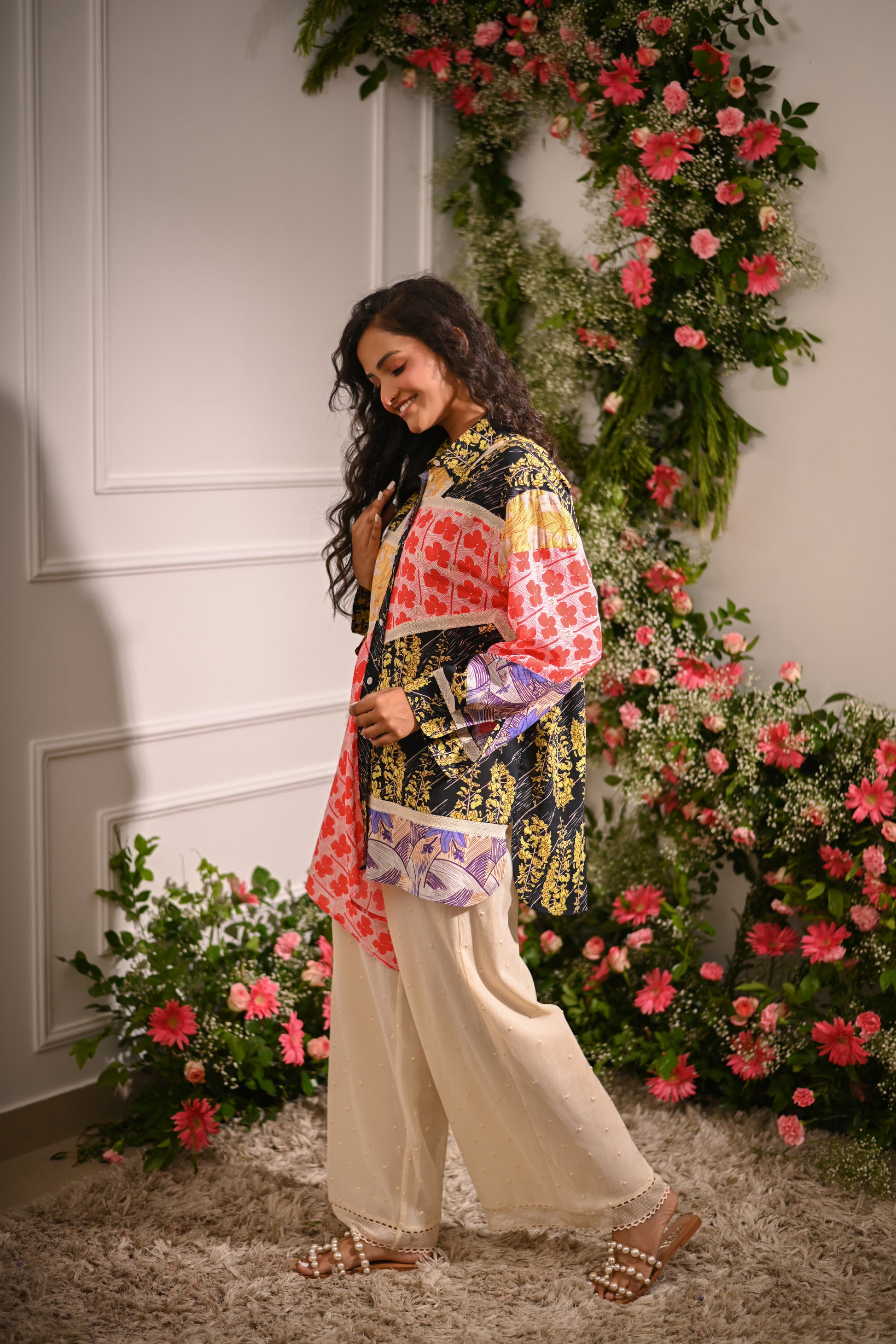 Our multicoloured oversized patchwork asymmetric button-up collared shirt, crafted from a mix of cotton silk, and cotton cambric, and adorned with mulmul lining and lace details, offers a statement-making look. Paired with off-white embroidered pyjama-style trousers in cotton net (tulle) with a full elastic waistband, this set blends eclectic style with comfort.