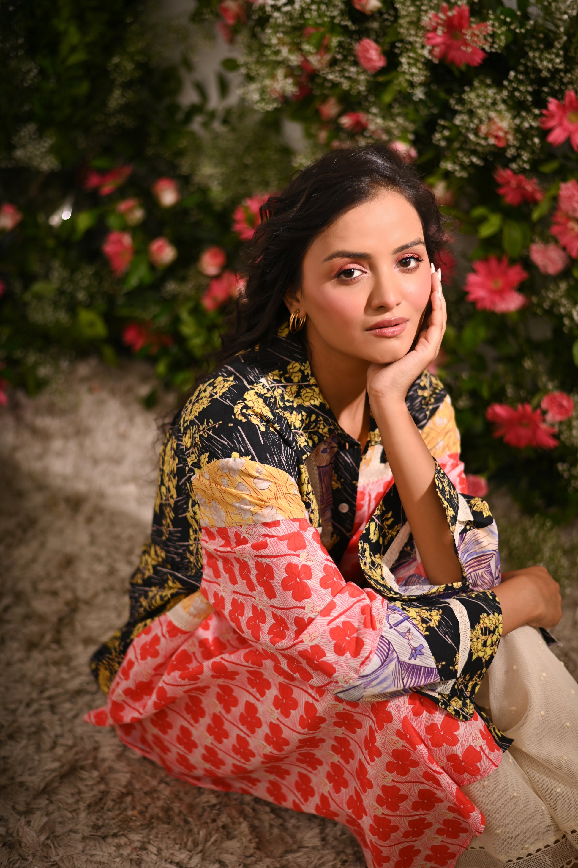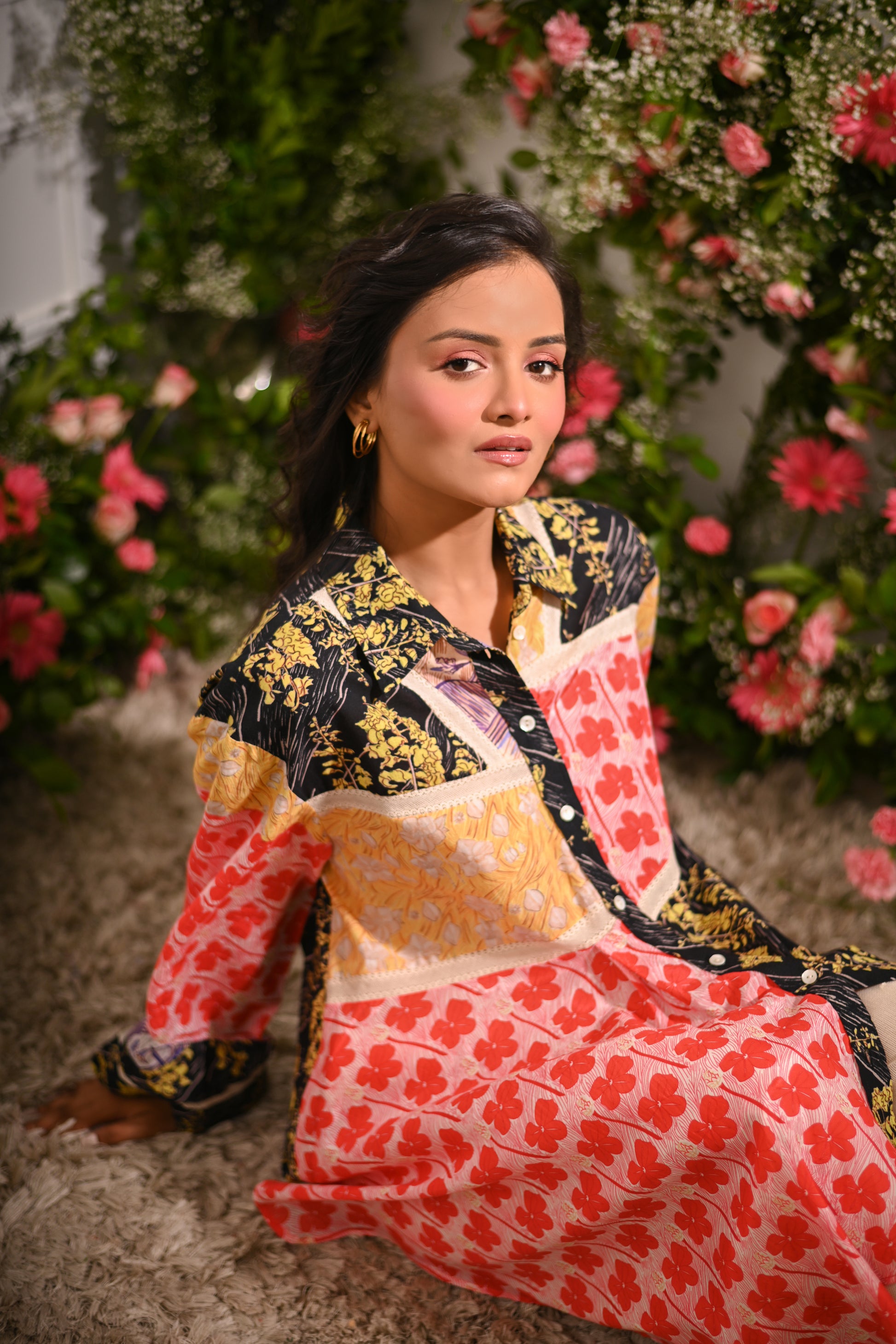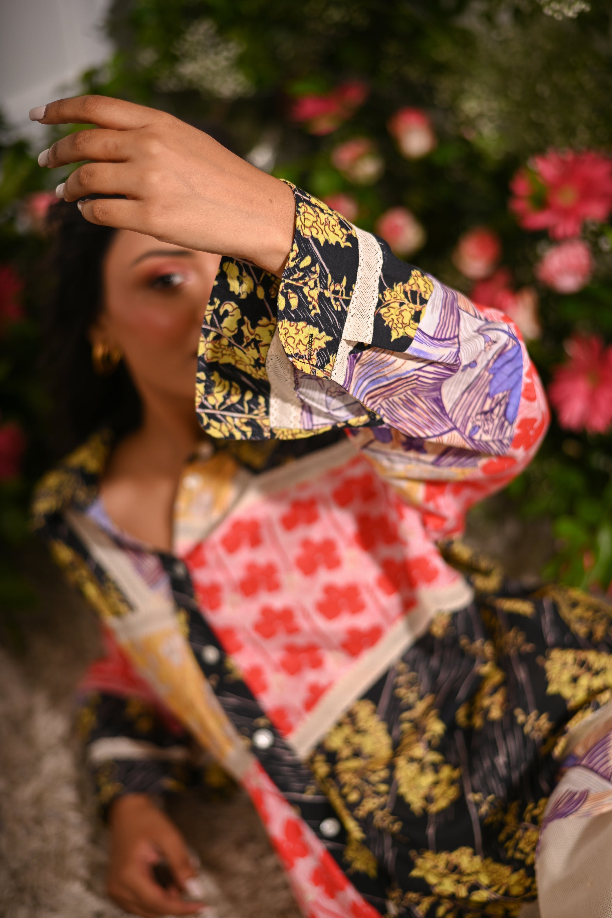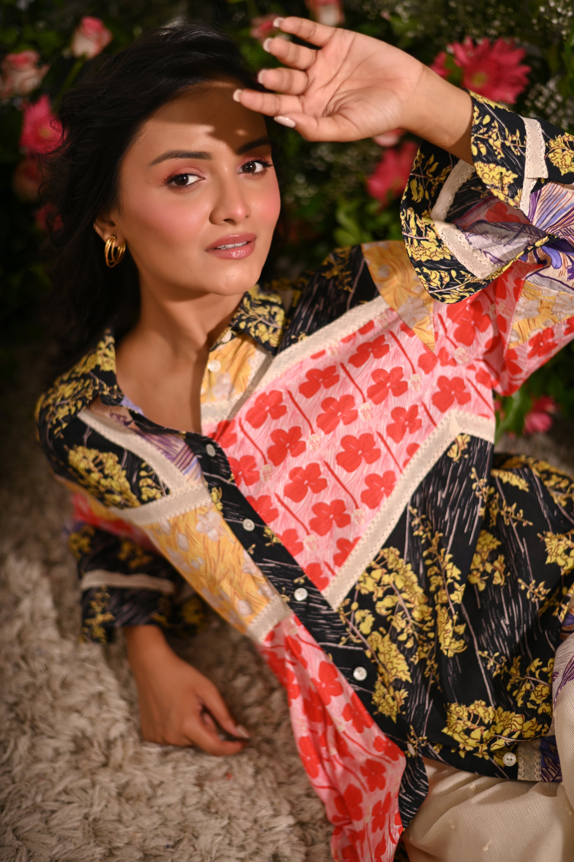 Our multicoloured oversized patchwork asymmetric button-up collared shirt, crafted from a mix of cotton silk, and cotton cambric, and adorned with mulmul lining and lace details, offers a statement-making look. Paired with off-white embroidered pyjama-style trousers in cotton net (tulle) with a full elastic waistband, this set blends eclectic style with comfort.