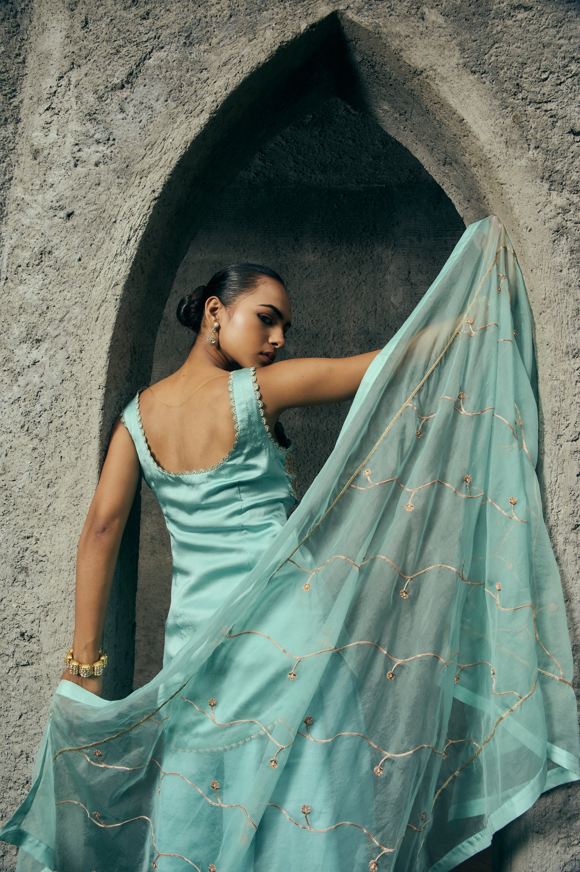 A sleeveless aqua-blue satin silk kurta-top with a delicately edged round neck and curved hemline. Paired with an embroidered raw silk sharara and airy organza dupatta, the set is adorned with resham, pearls, and zardozi hand embroidery, perfect for festive occasions.