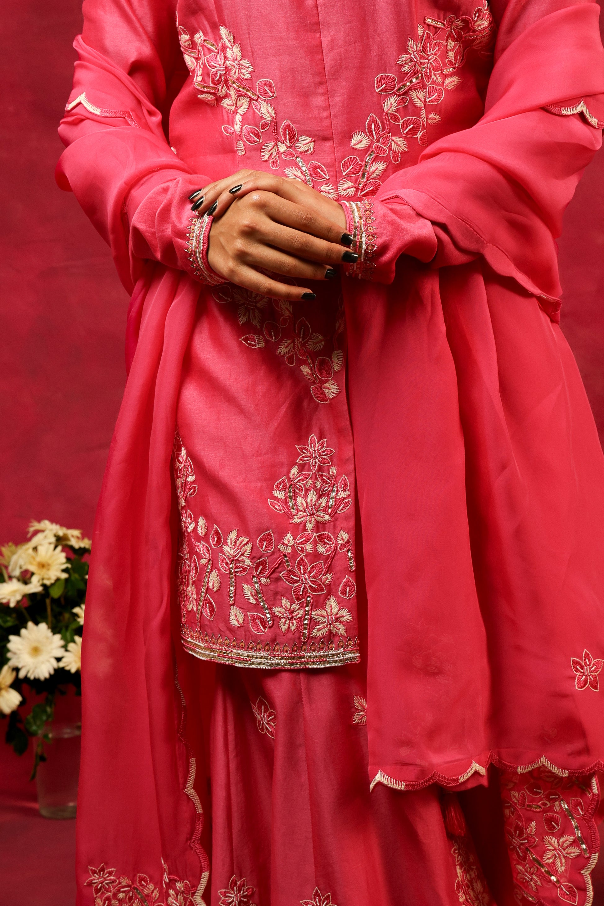 The Eternal Deep Pink Kurta and Sharara Set is a three-piece ensemble that includes a kurta, pants, and a dupatta. The kurta features a hand-embroidered round neckline with a front slit and chudidaar full sleeves. The kalidaar sharara is designed with a side zip and a half-elastic waistband for easy of wear. The set is completed with a delicate organza dupatta and attached Mulmul lining.