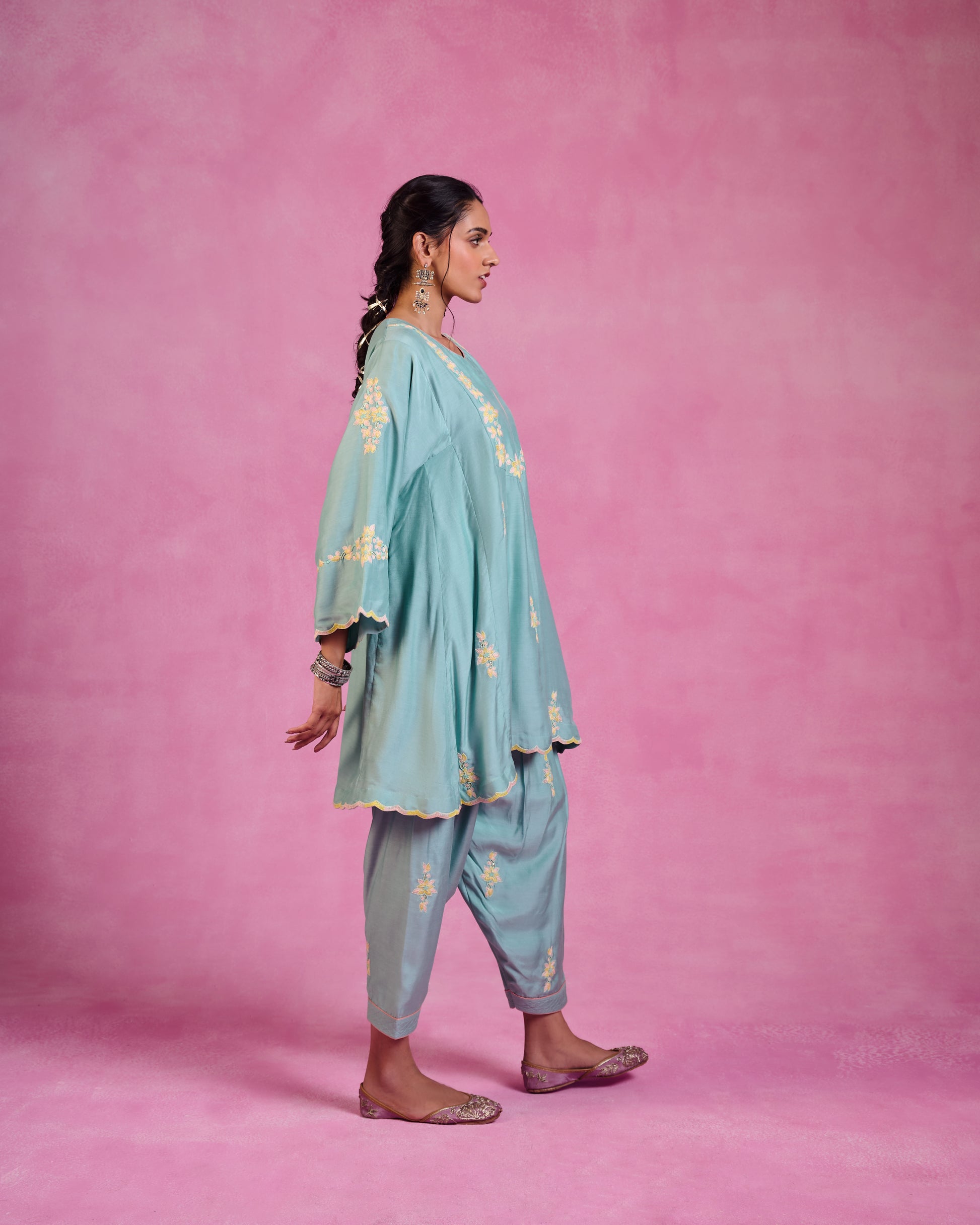 In a crisp, ethereal blue, this two-piece flared kurta and salwar set is crafted from luxurious cotton silk, offering a soft and graceful silhouette. With its refined elegance and effortless charm, it’s the perfect choice for those seeking understated beauty
