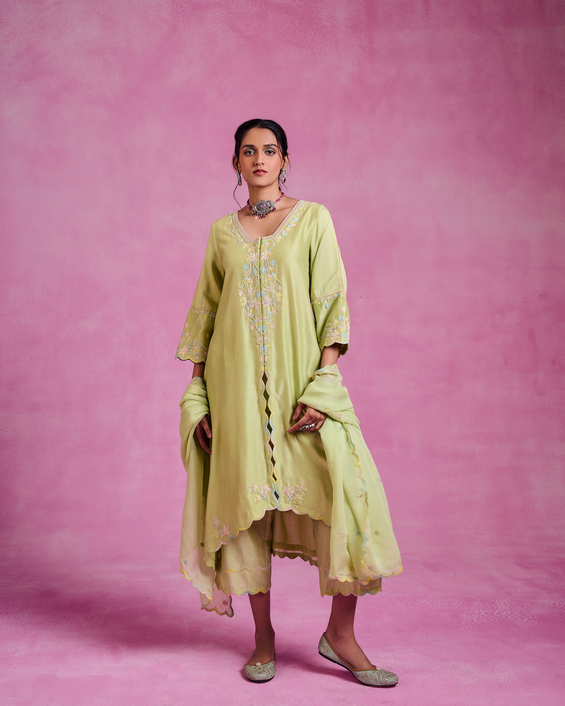 This three-piece Chanderi suit set in matcha green pairs delicate border work with a fluid silhouette that moves with you. It’s timeless, graceful, and made for those who carry elegance with ease.