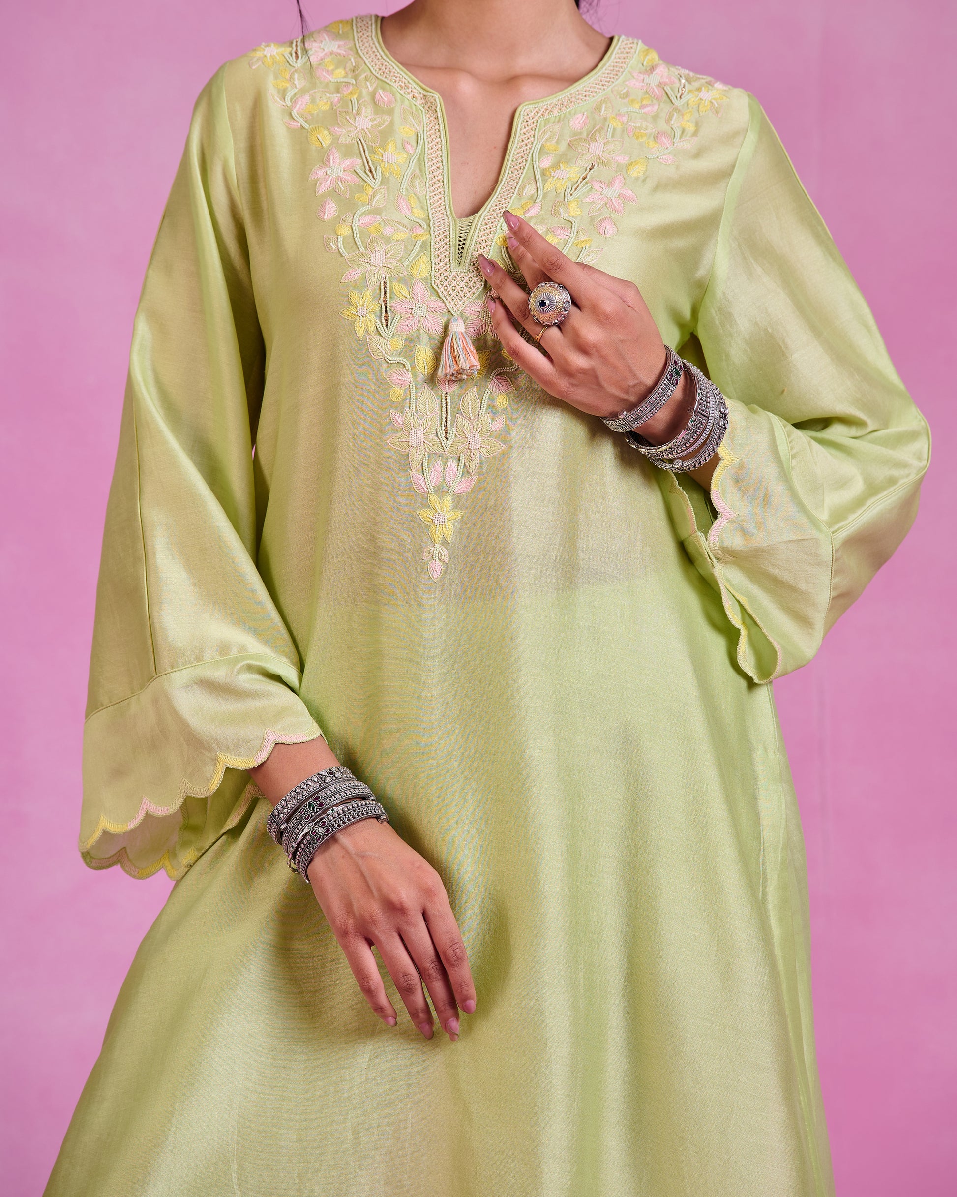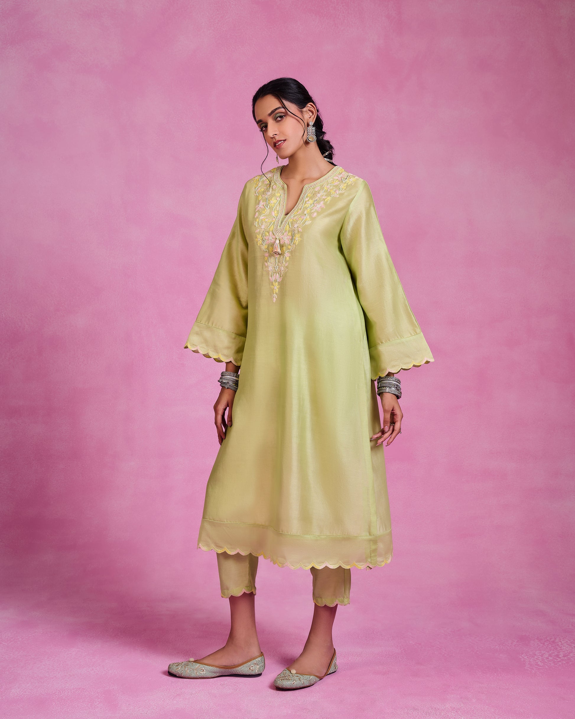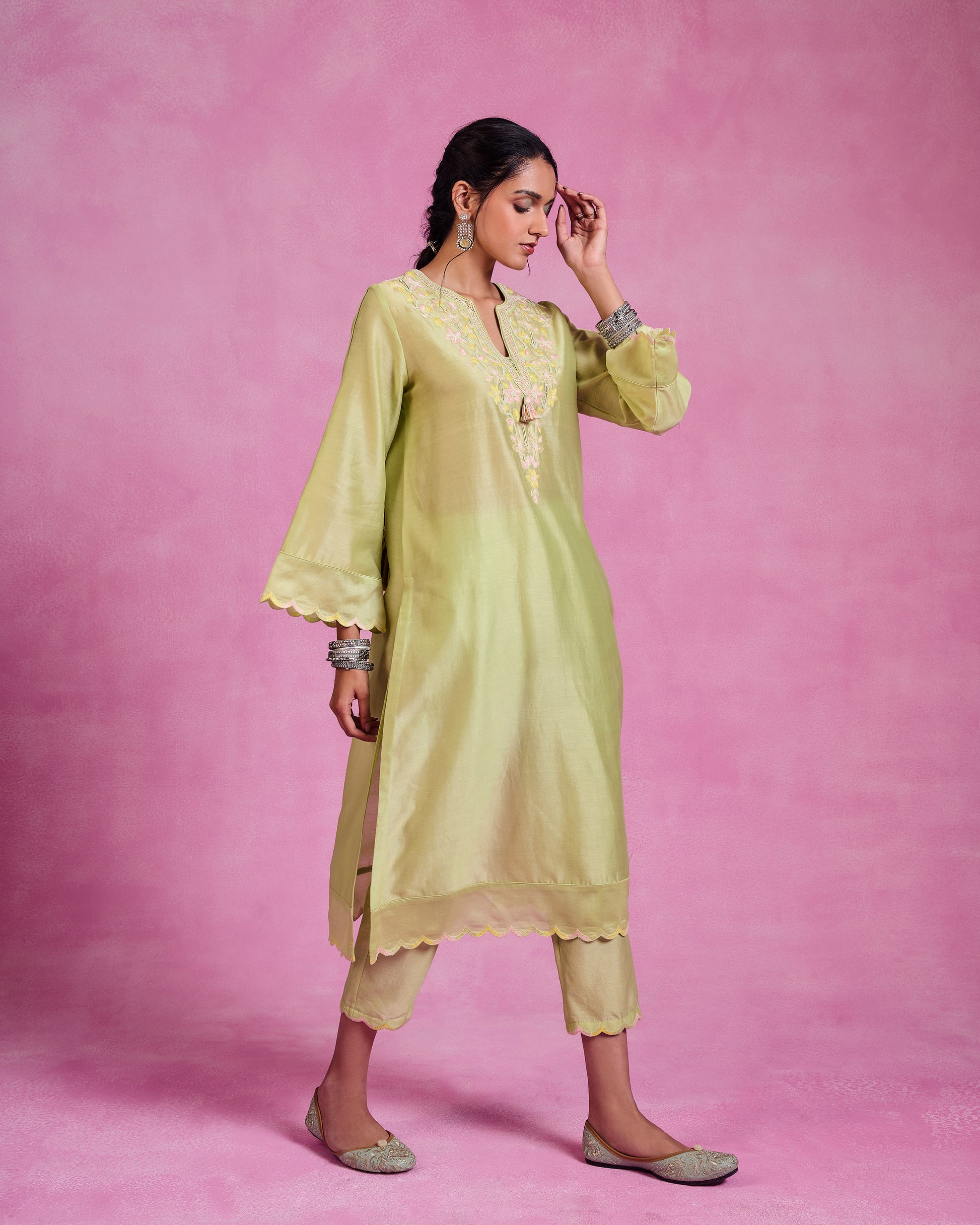 This matcha green kaftanstyle kurta set of 2 in luxurious Chanderi features bell sleeves and a flowing silhouette, creating a graceful and elegant look. Paired with coordinated bottoms, it offers a timeless, sophisticated vibe perfect for any refined occasion.
