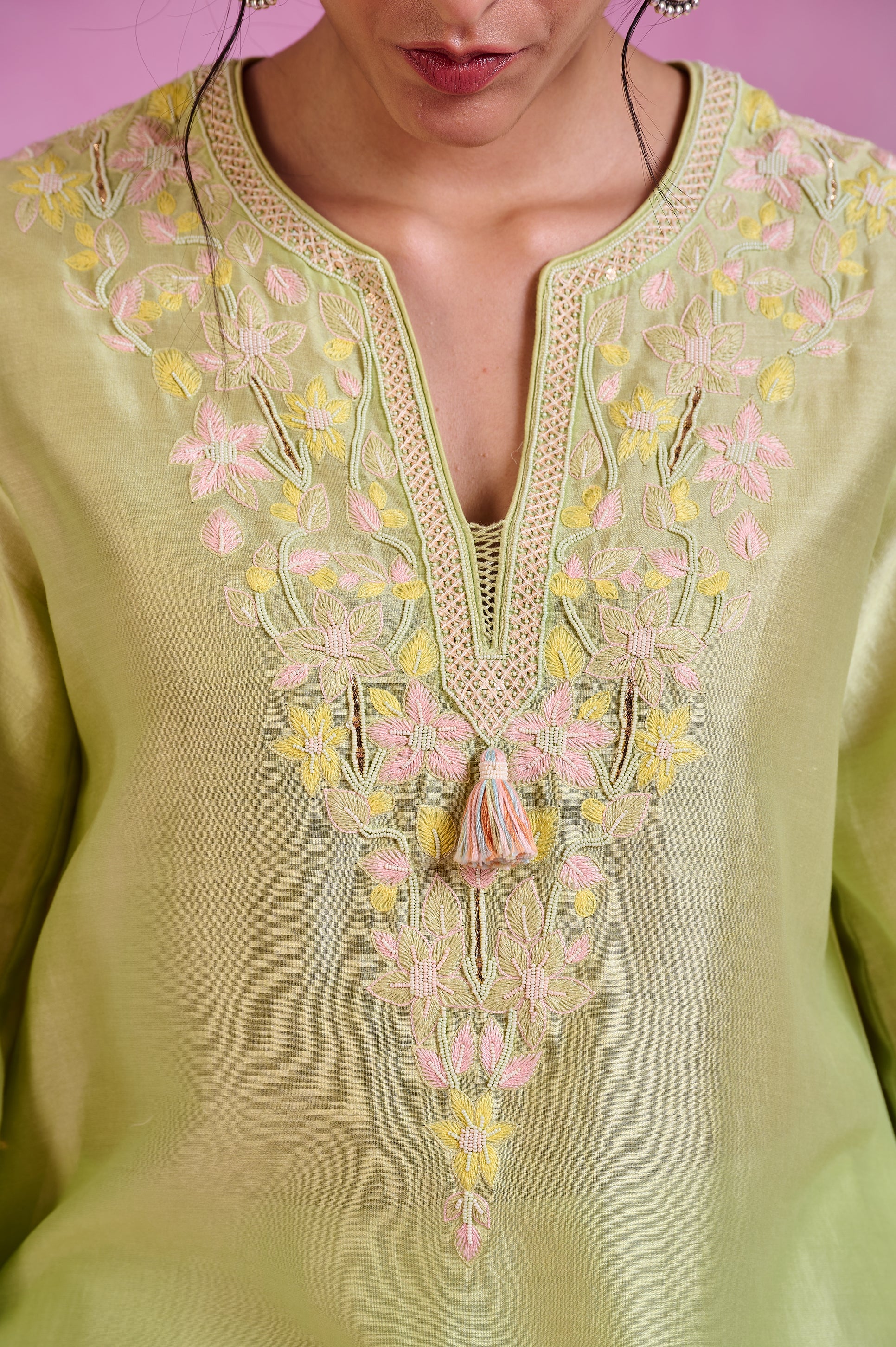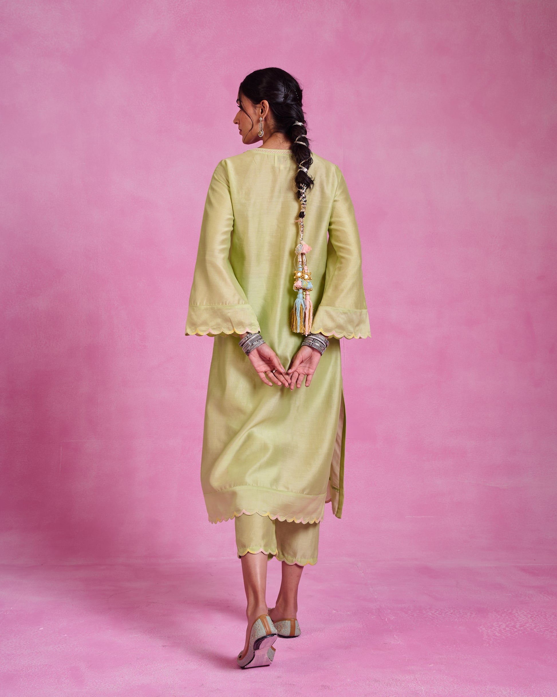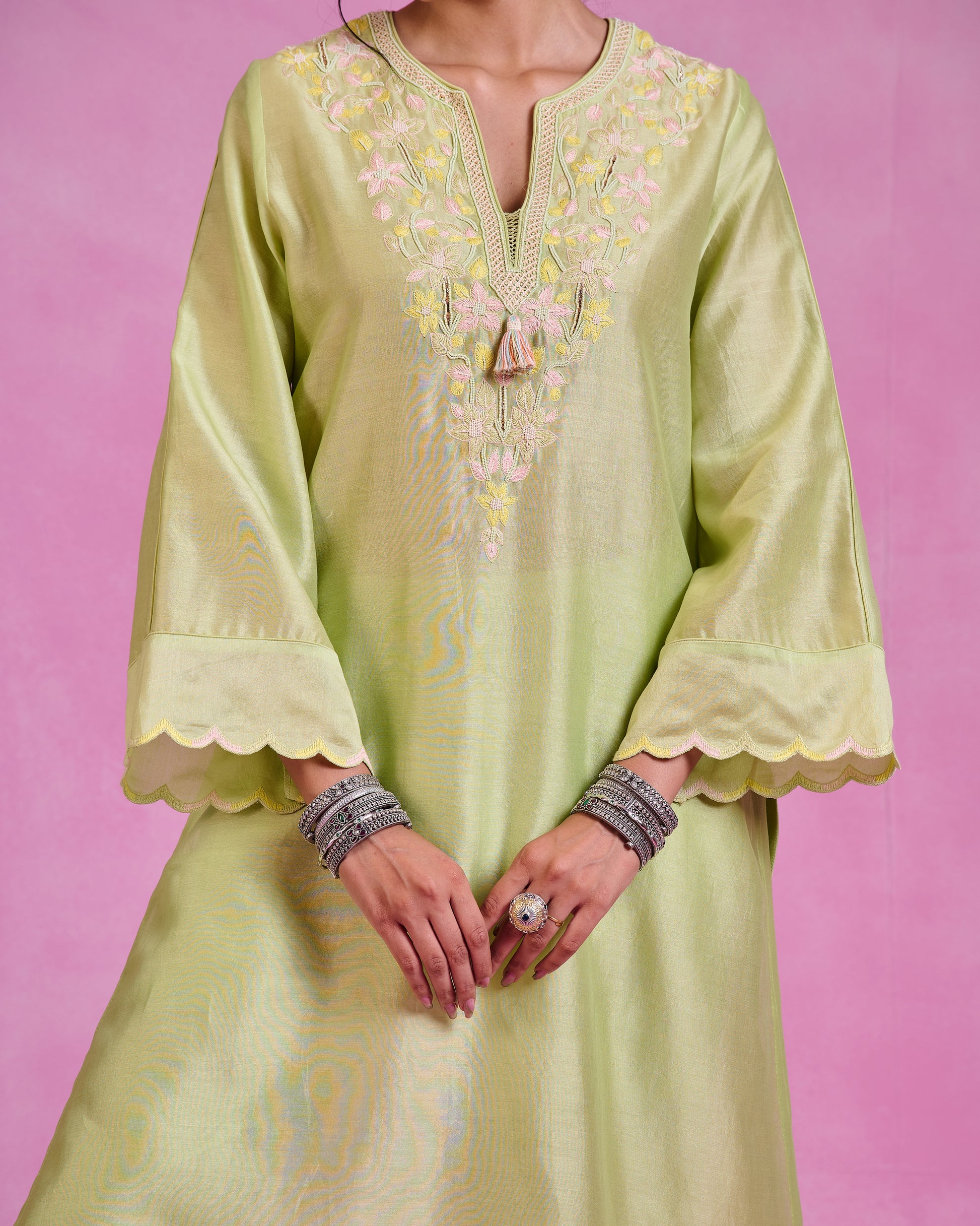 This matcha green kaftanstyle kurta set of 2 in luxurious Chanderi features bell sleeves and a flowing silhouette, creating a graceful and elegant look. Paired with coordinated bottoms, it offers a timeless, sophisticated vibe perfect for any refined occasion.