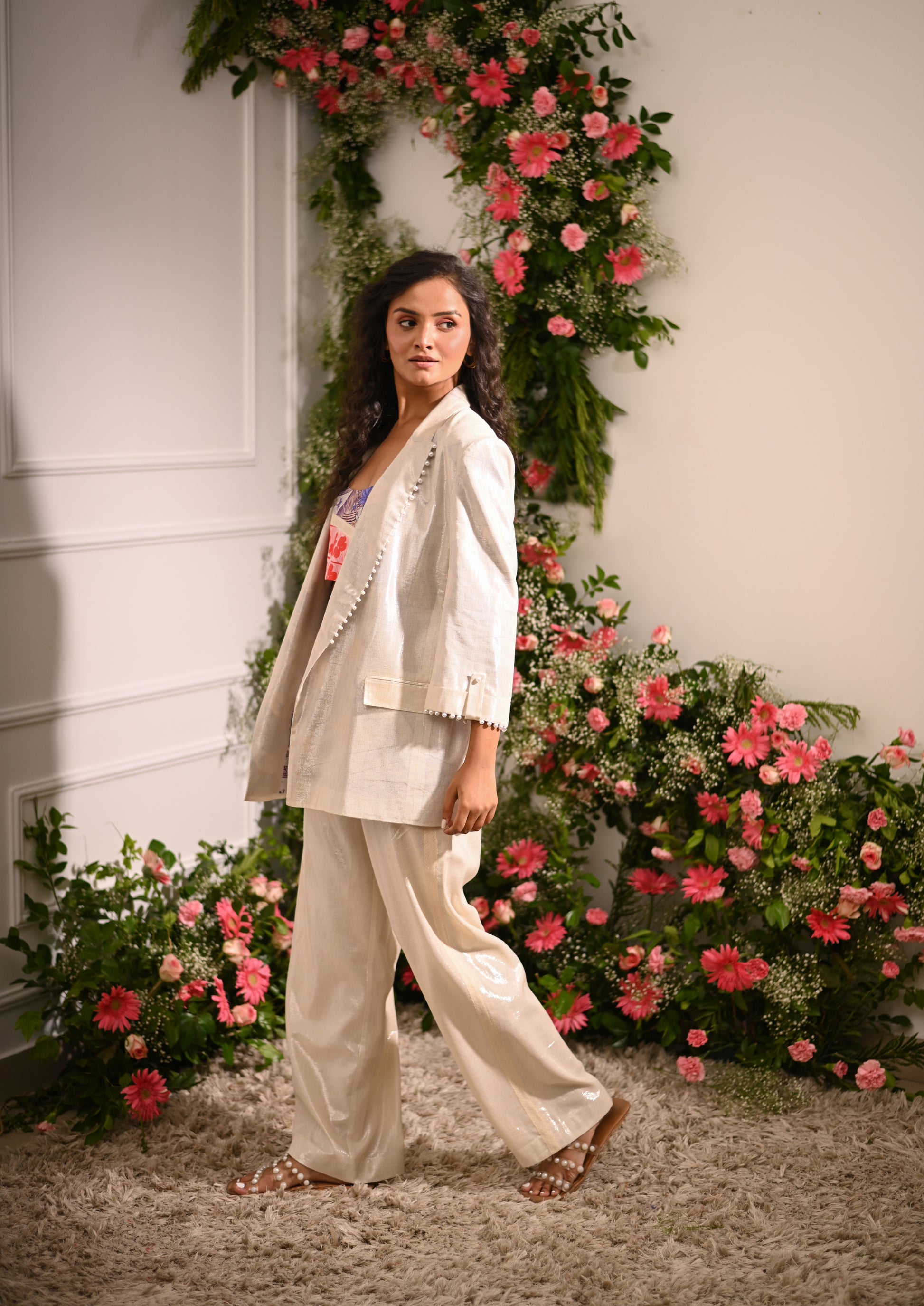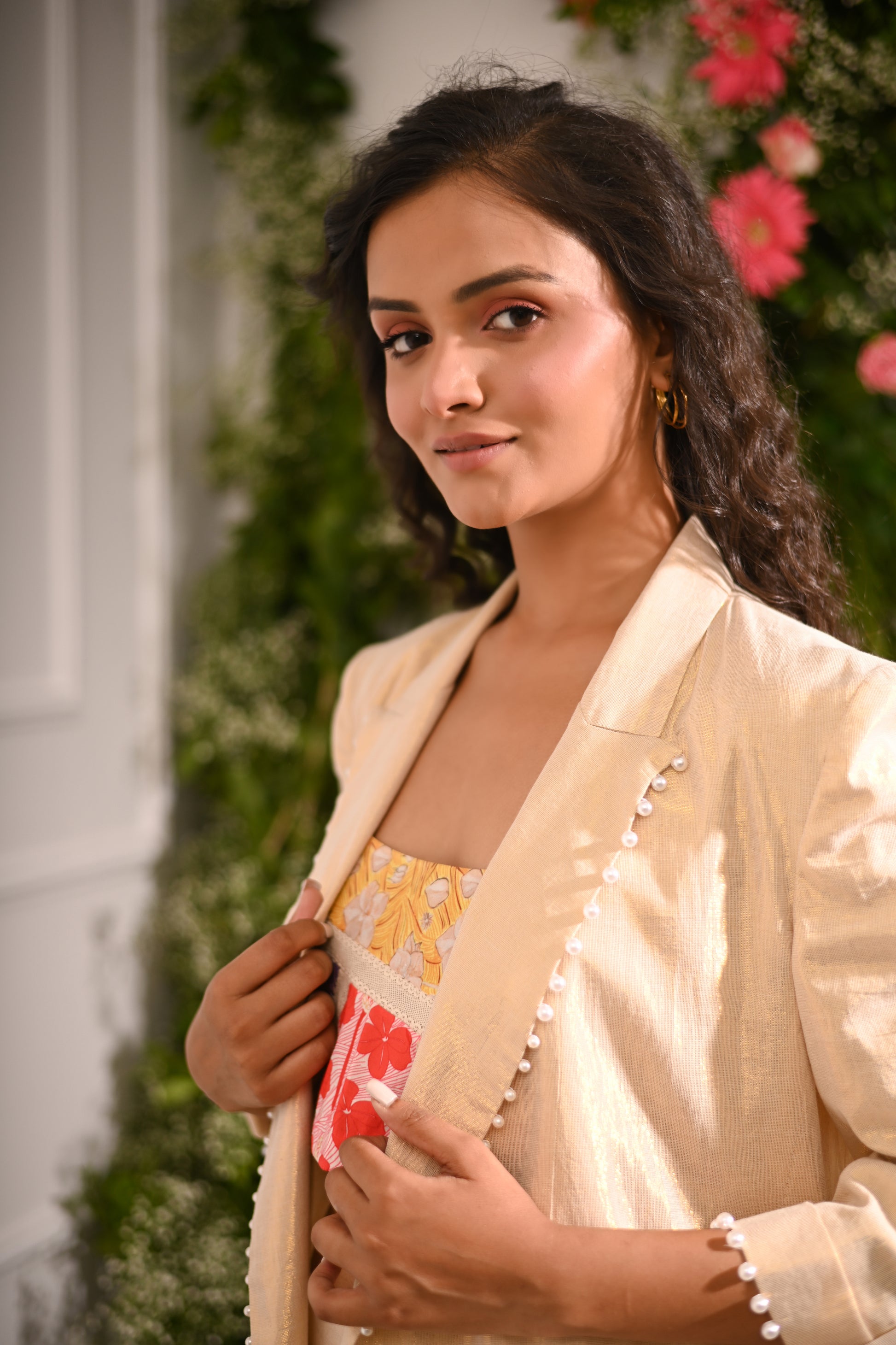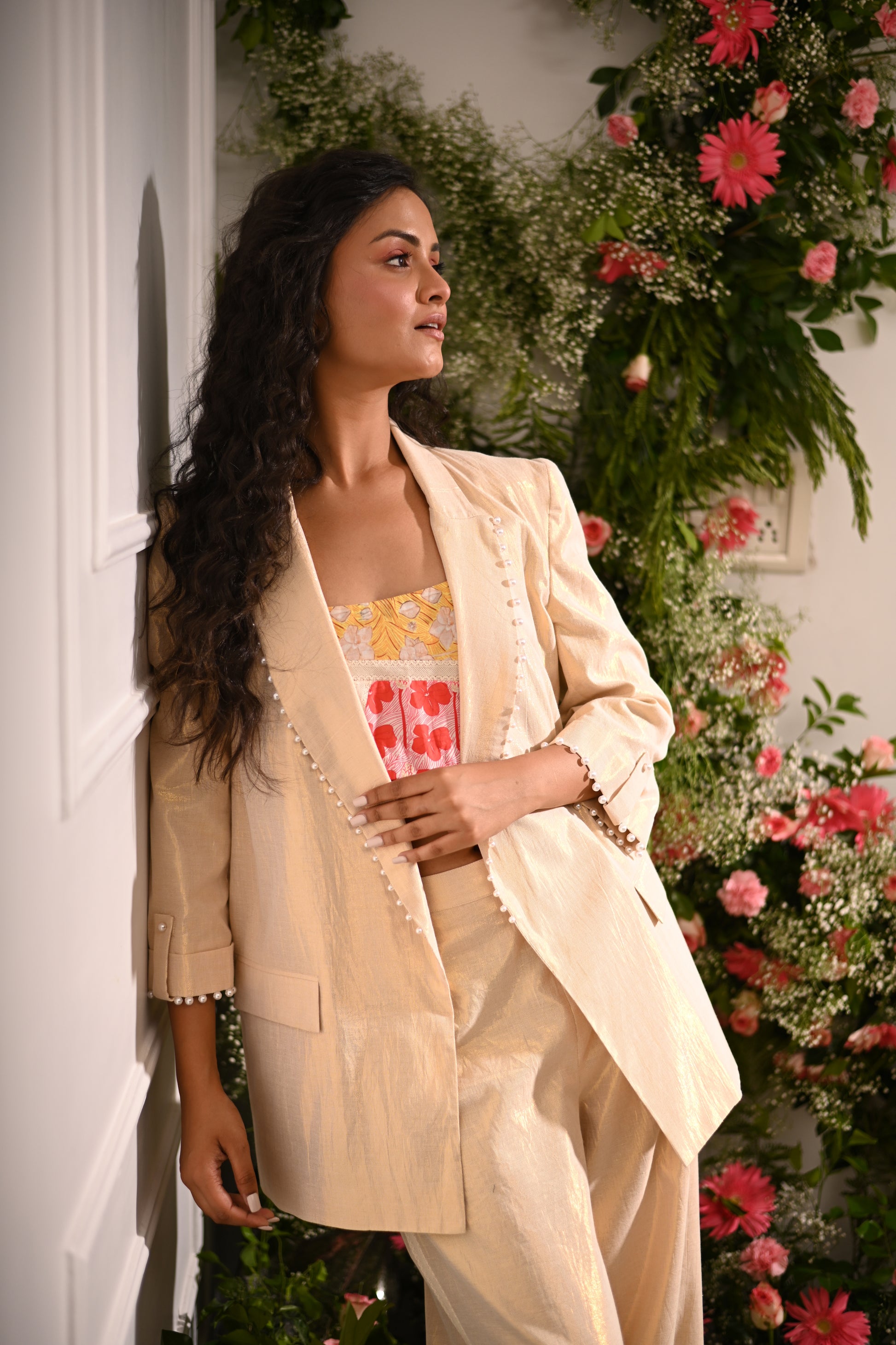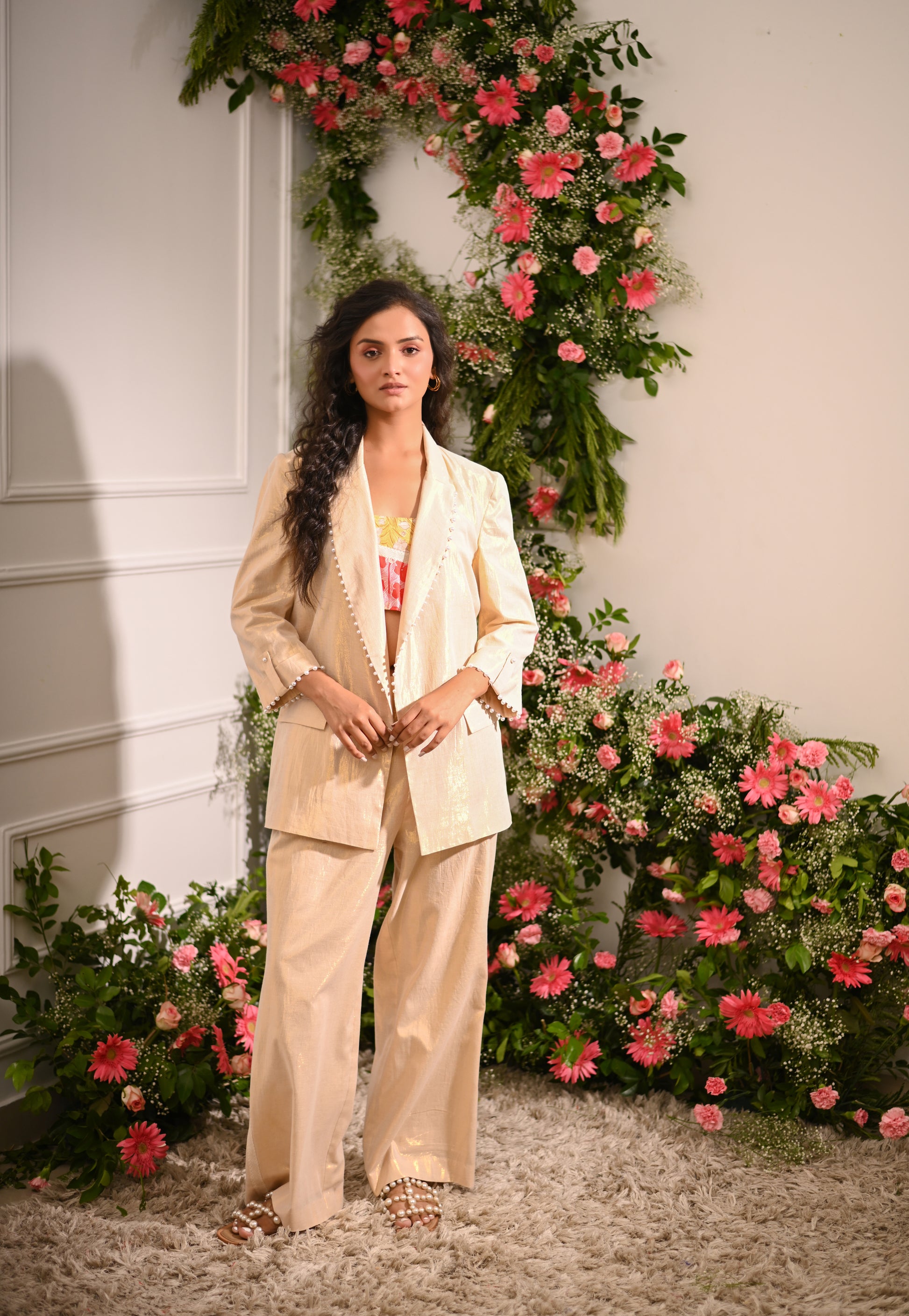 Our Gold Sparkle Suit Set, crafted with exquisite detailing, offers a glamorous and refined look. This set features an oversized flowing blazer in gold shimmer cotton, adorned with faux pearl details, a lapel collar, and front flap pockets. It is paired with loose-fit trousers featuring side pockets and a half-elasticated waistband. The ensemble is completed with a camisole featuring printed patchwork, lace details, and hook fastening at the back.