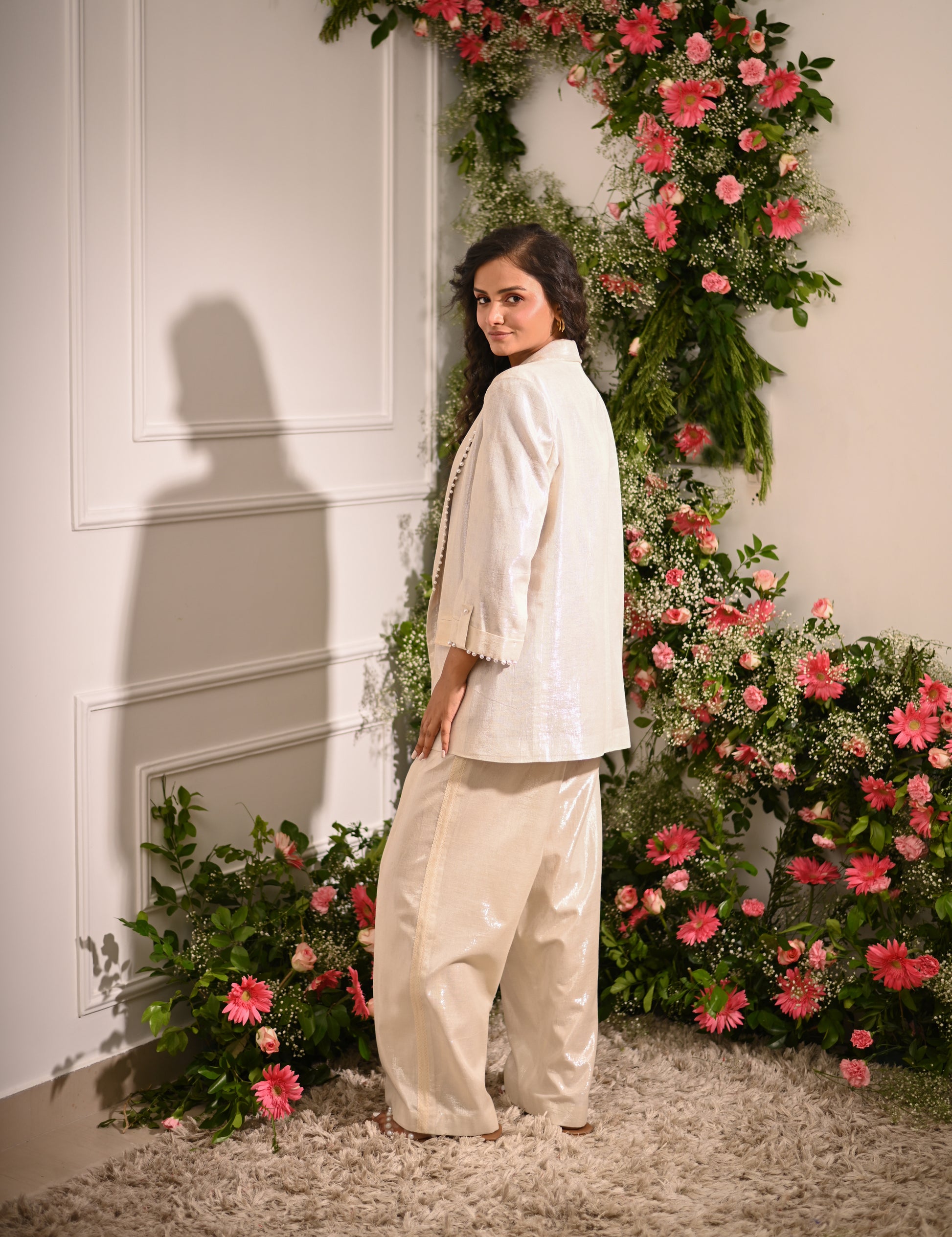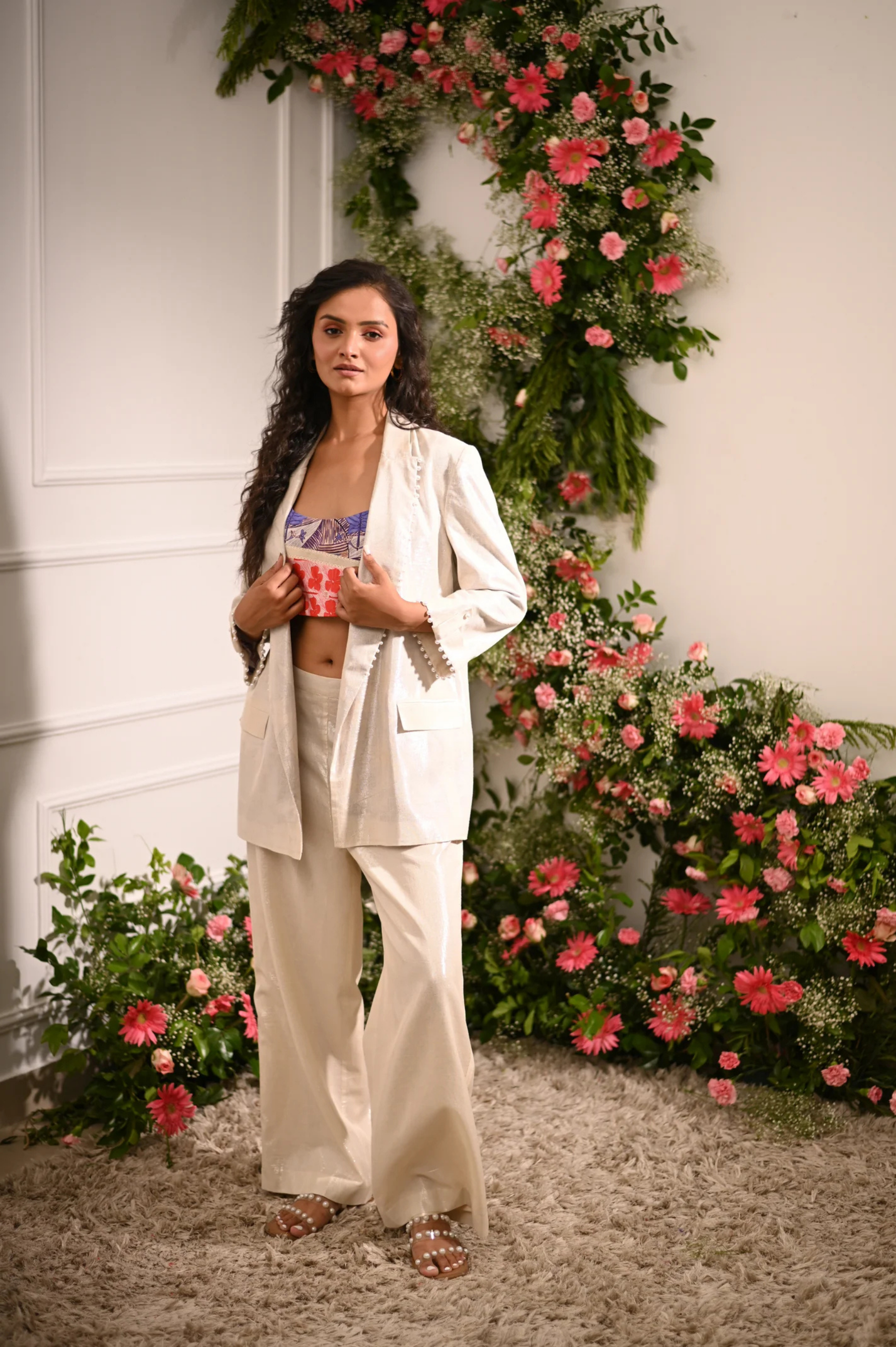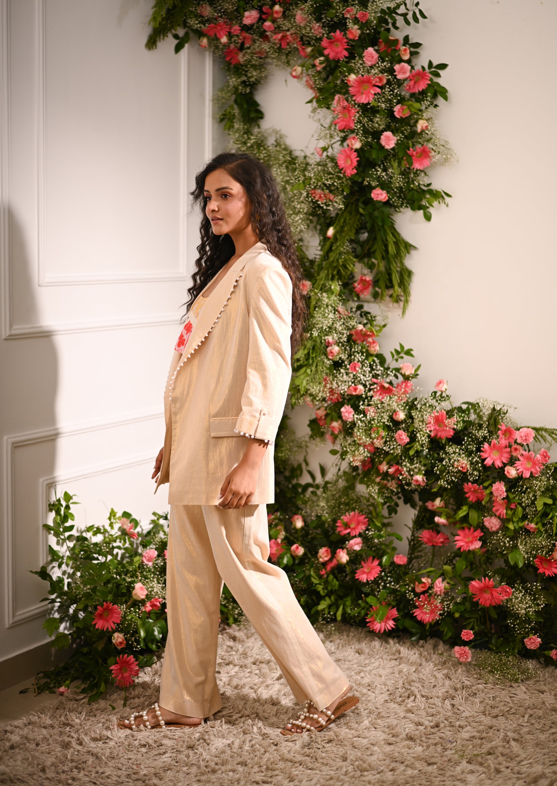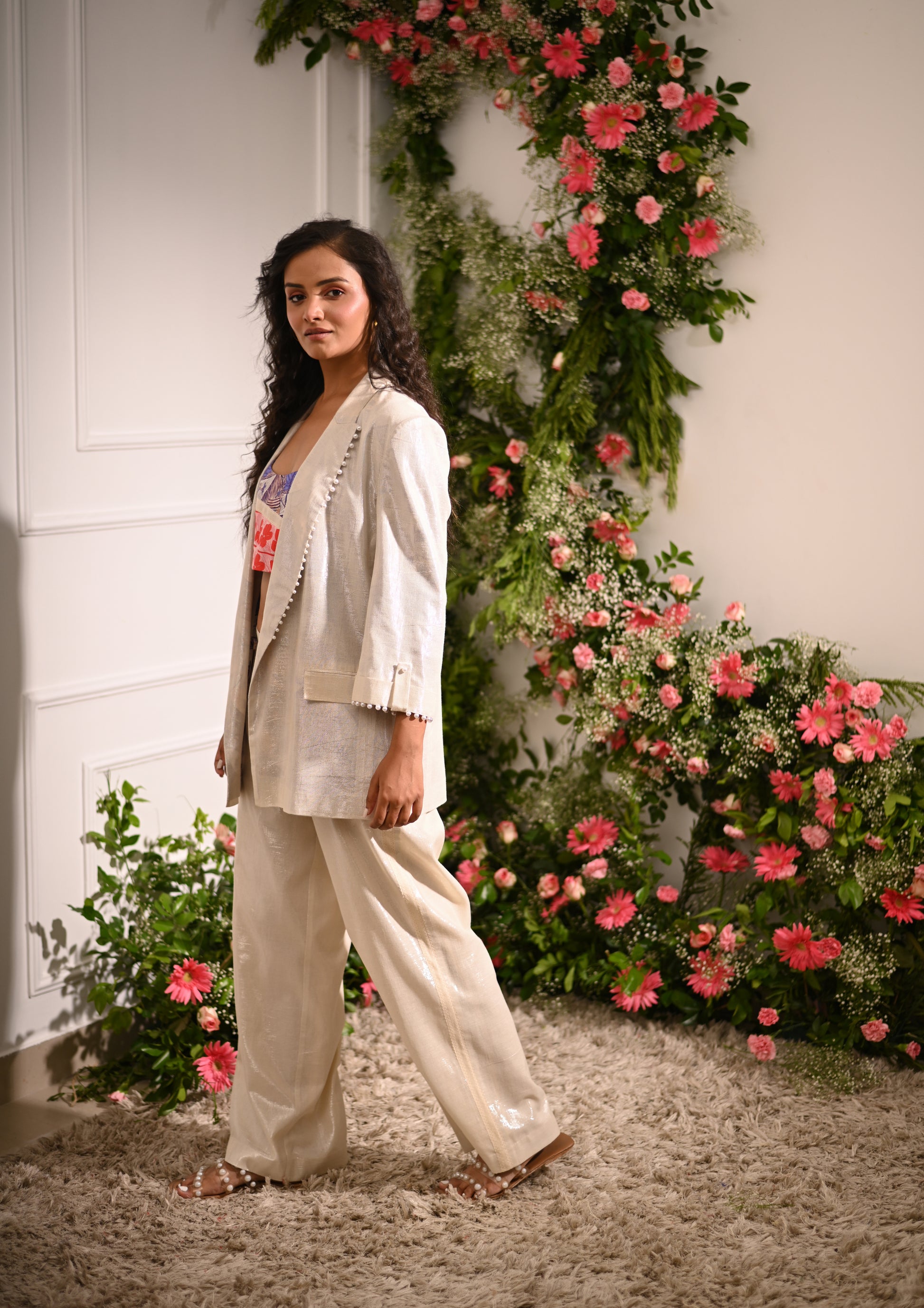 Our Gold Sparkle Suit Set, crafted with exquisite detailing, offers a glamorous and refined look. This set features an oversized flowing blazer in gold shimmer cotton, adorned with faux pearl details, a lapel collar, and front flap pockets. It is paired with loose-fit trousers featuring side pockets and a half-elasticated waistband. The ensemble is completed with a camisole featuring printed patchwork, lace details, and hook fastening at the back.