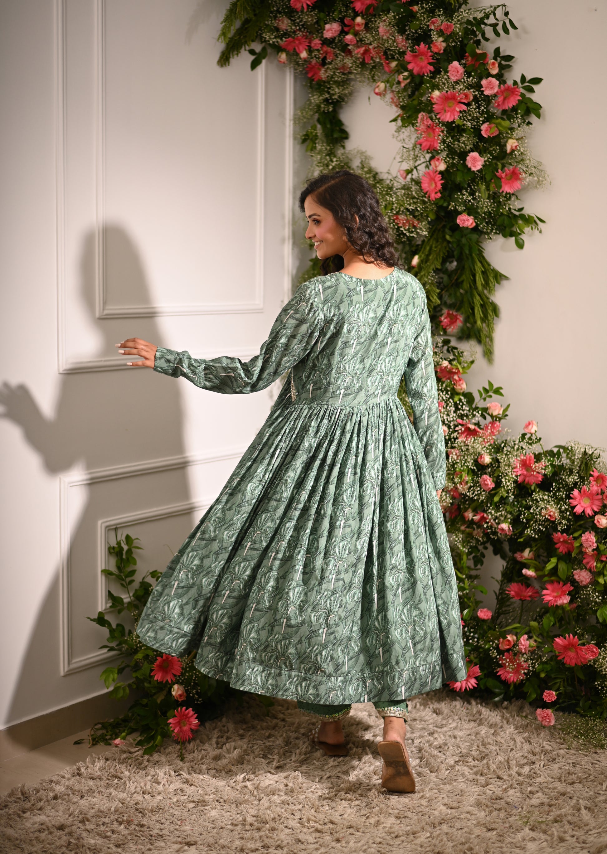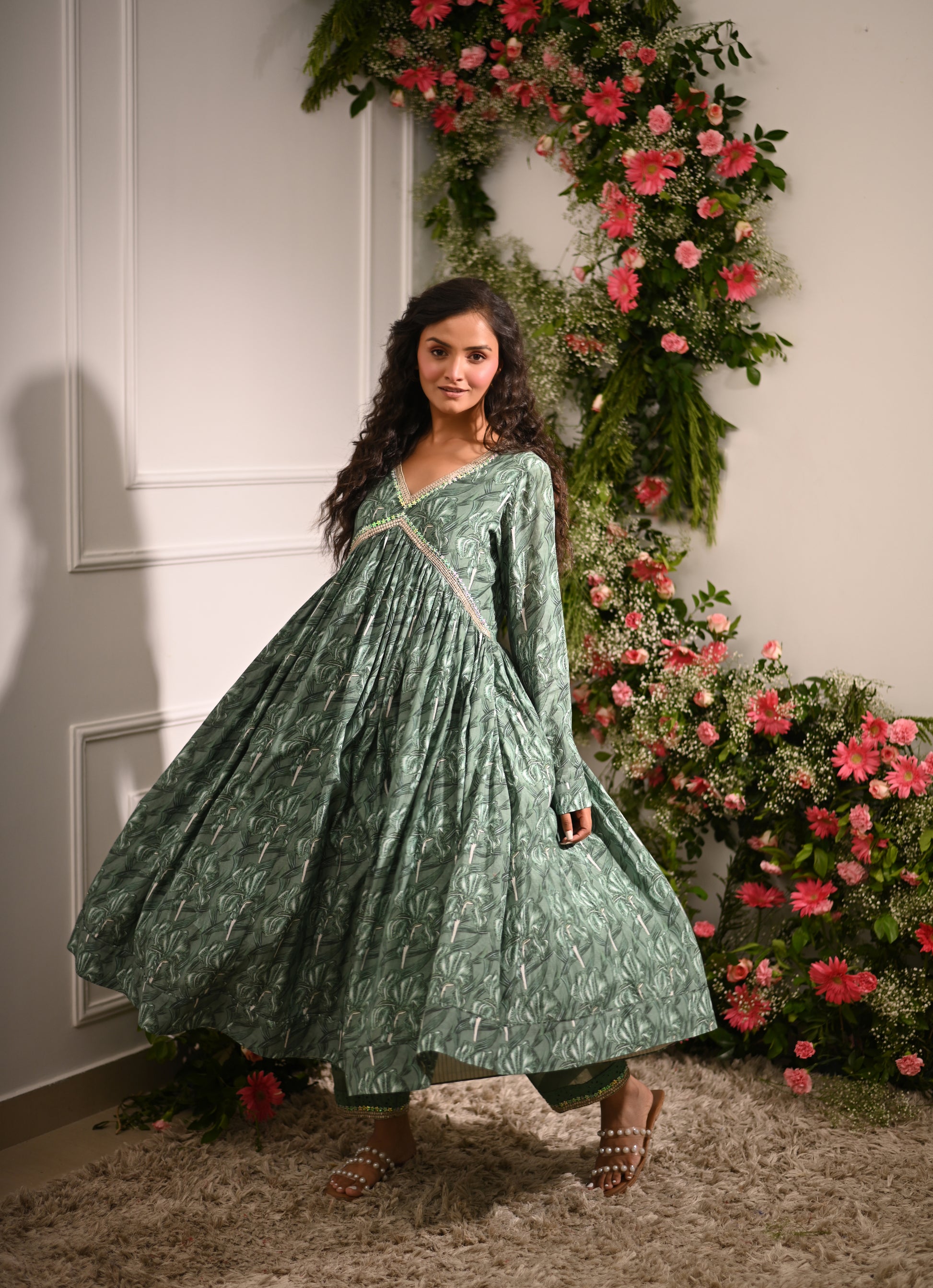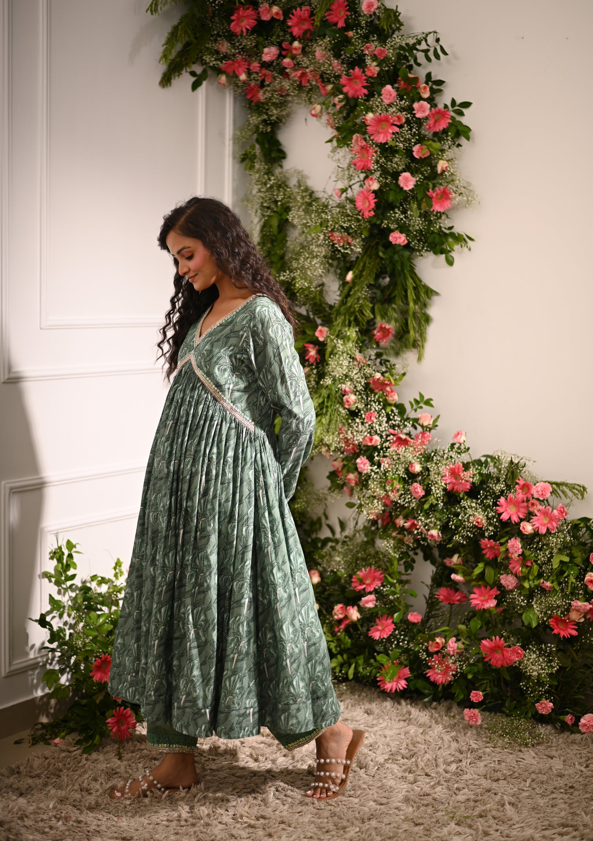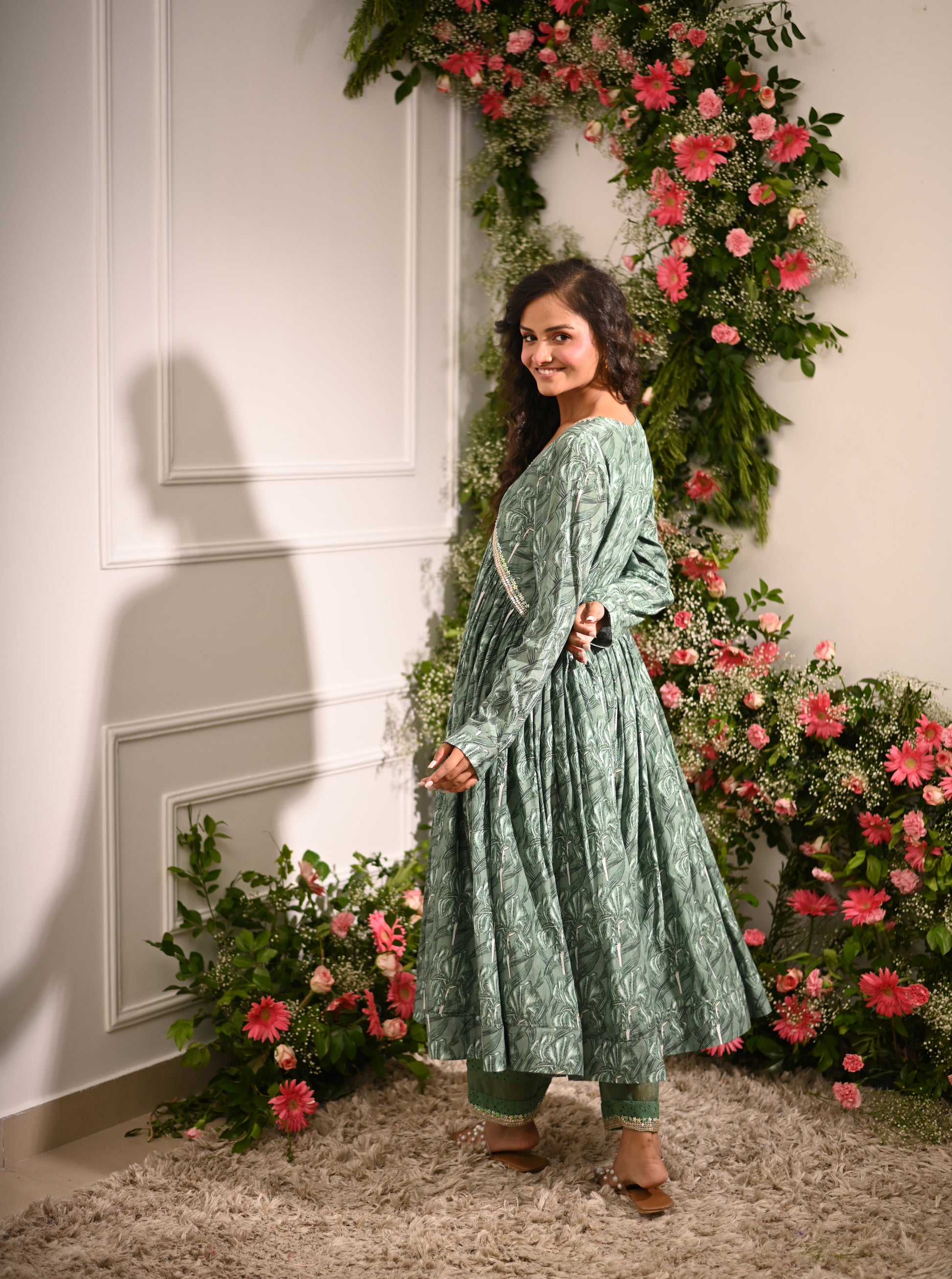 Our Iris Suit Set, crafted with exquisite detailing, offers a sophisticated and vibrant look. This set features an embroidered printed Anarkali kurta paired with a cutwork cotton and organza panelled salwar, complete with a hand-embroidered border and a fully elastic waistband. The ensemble is finished with a Dupion Organza dupatta adorned with lace details.