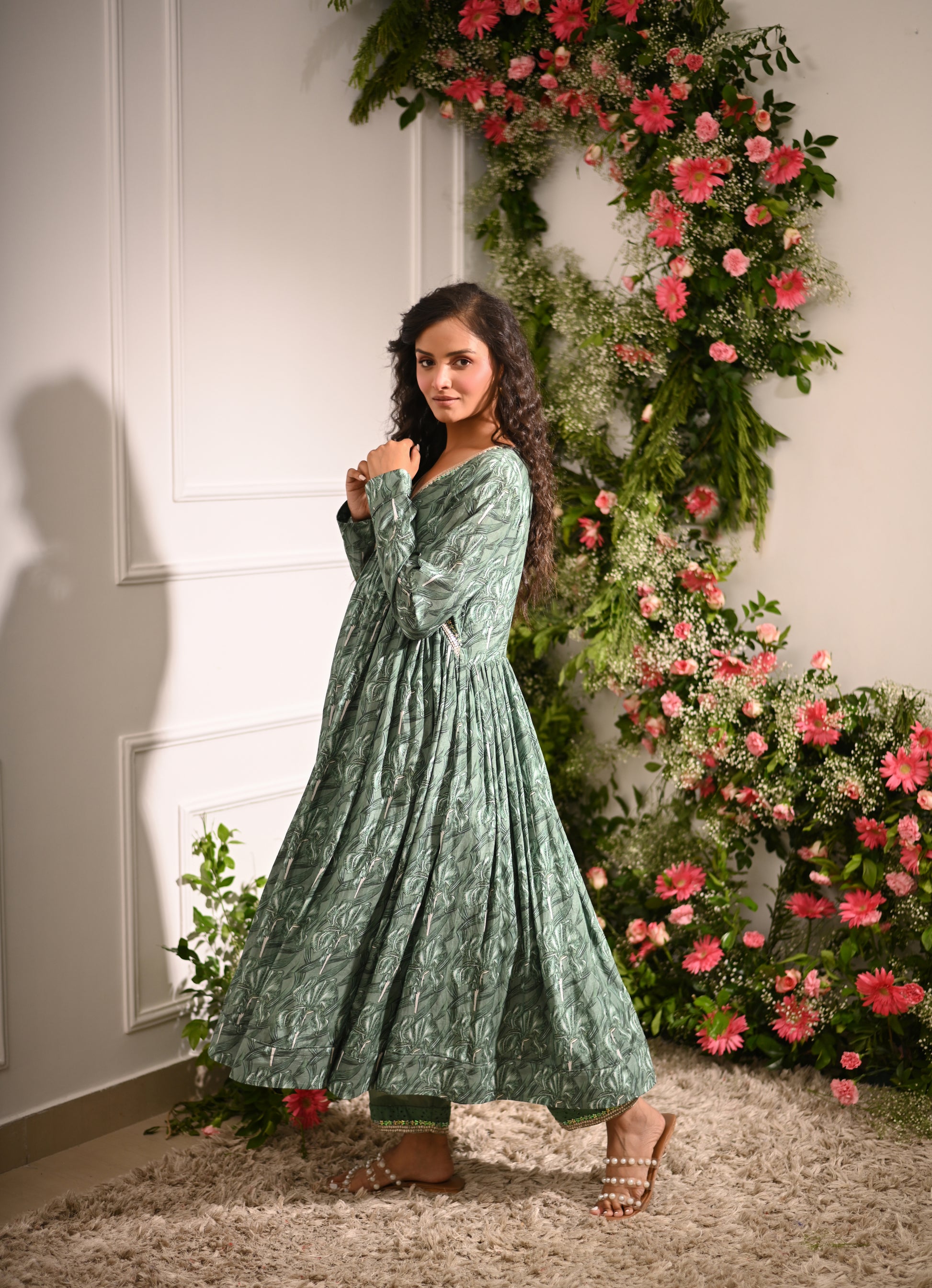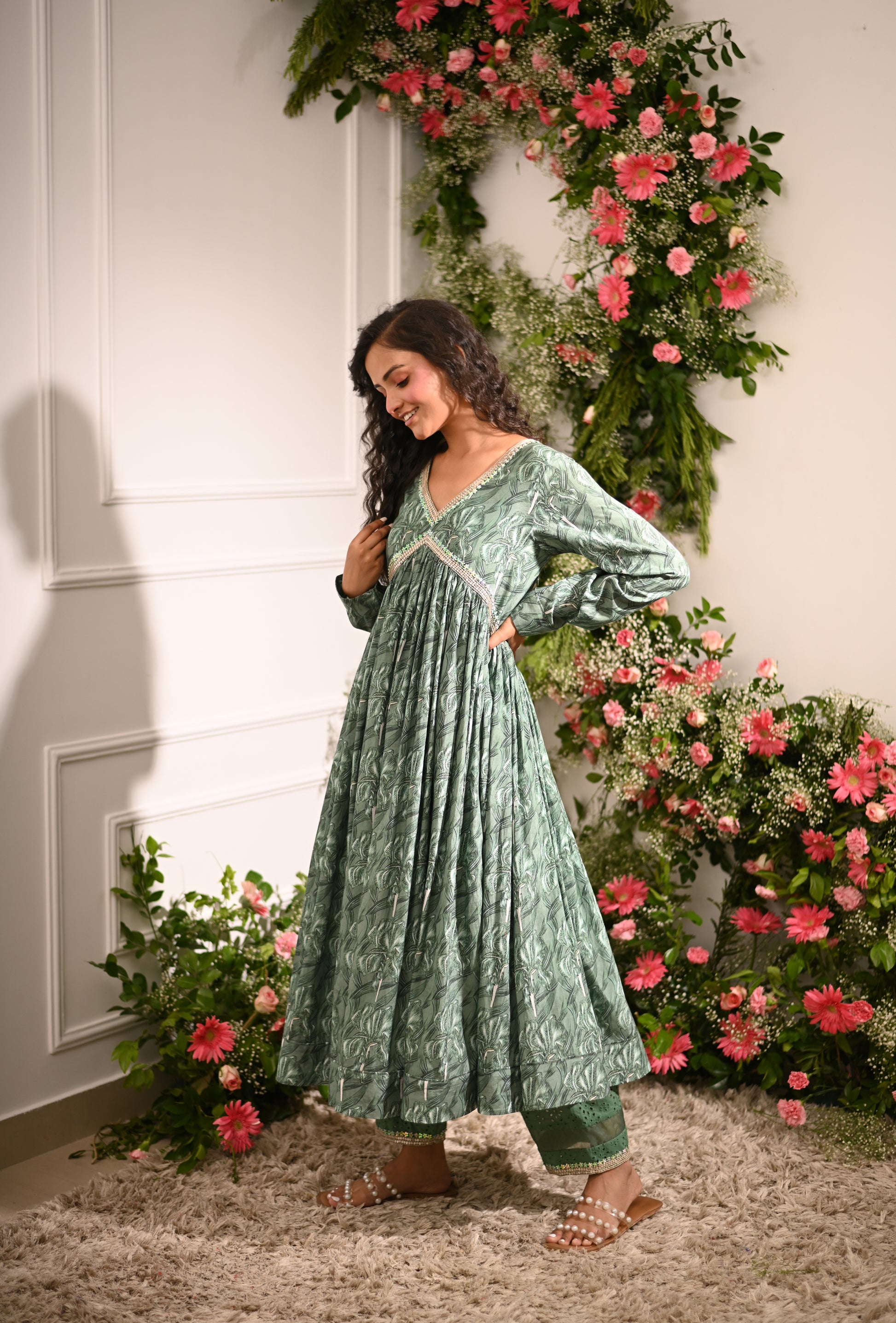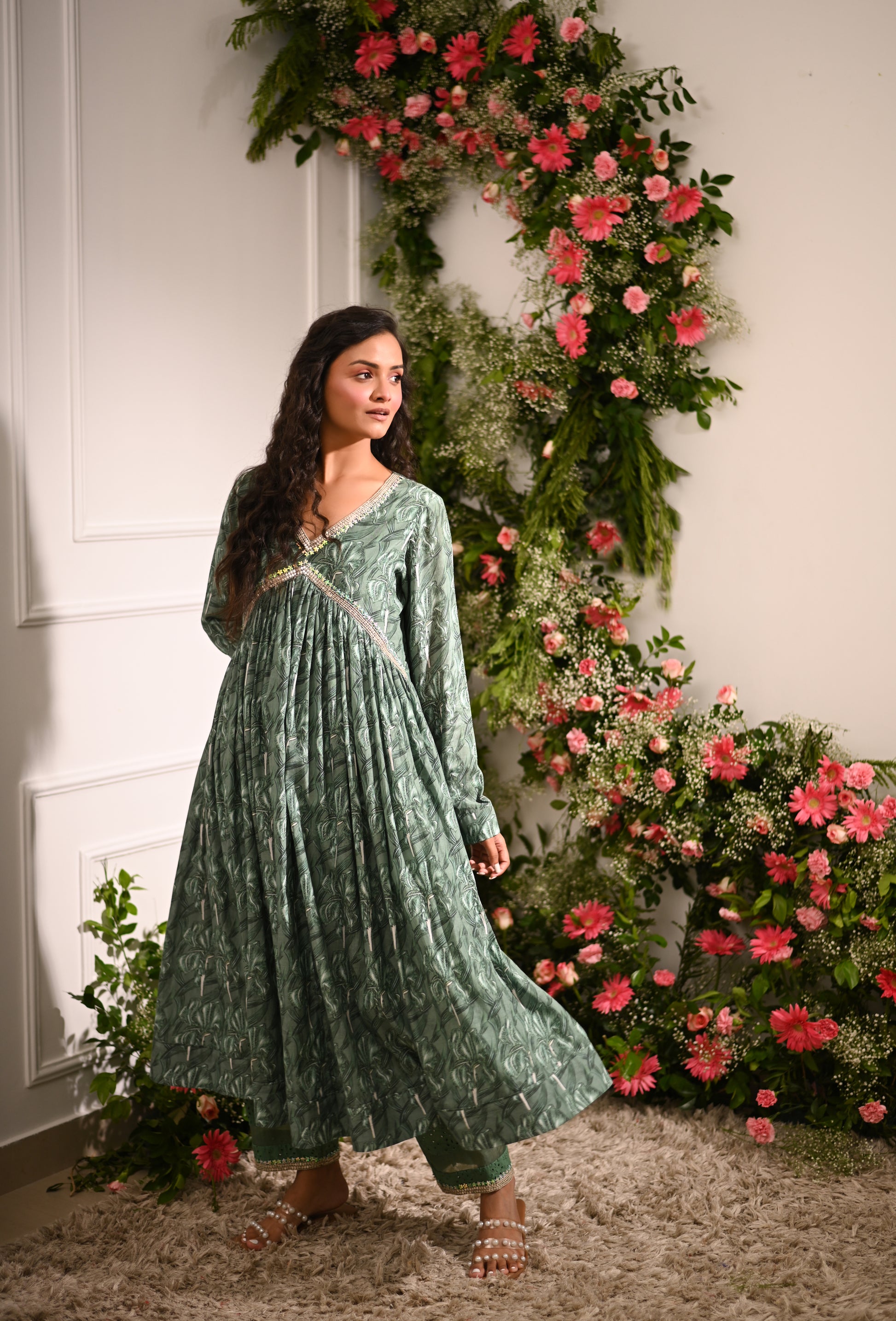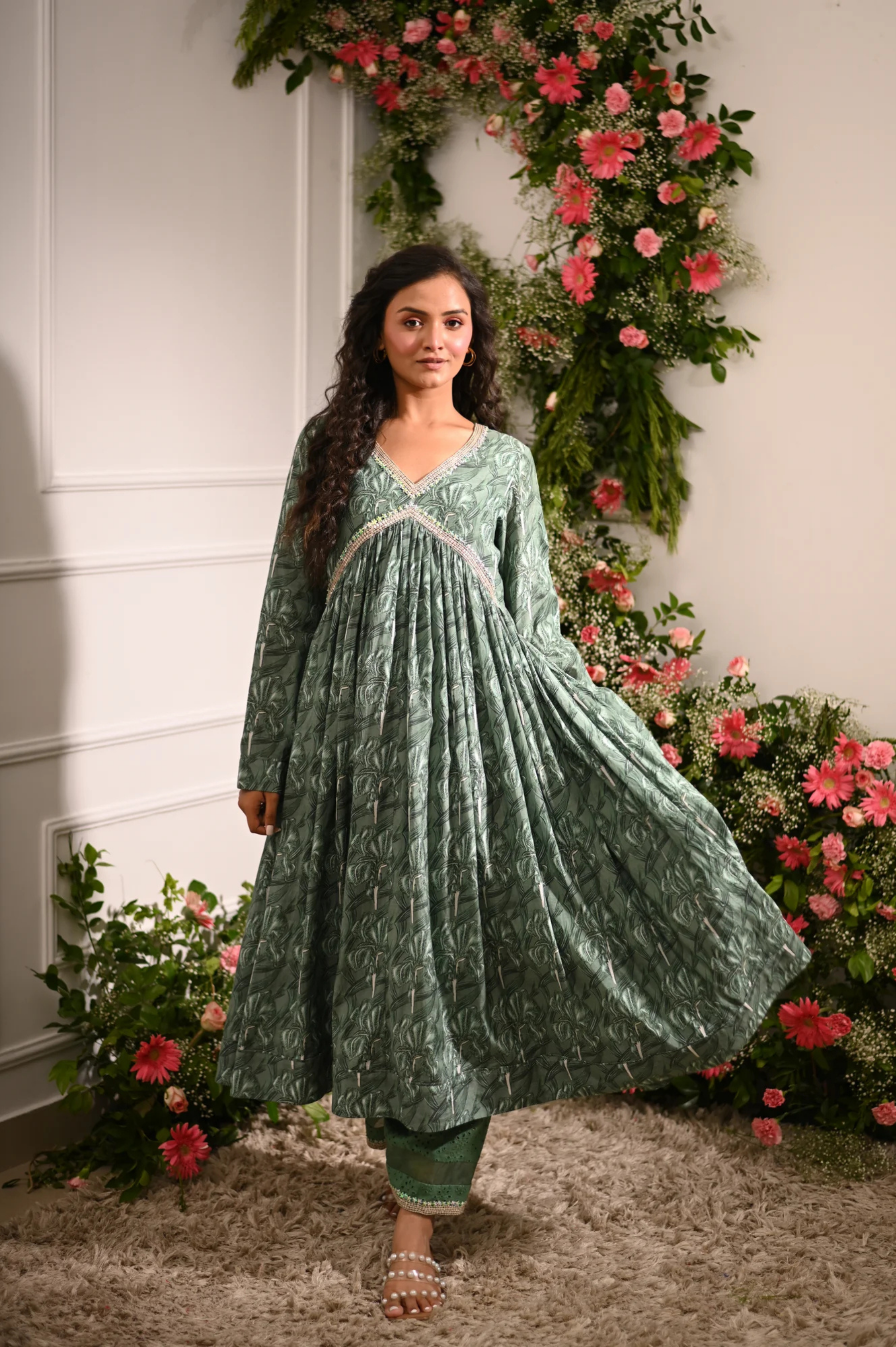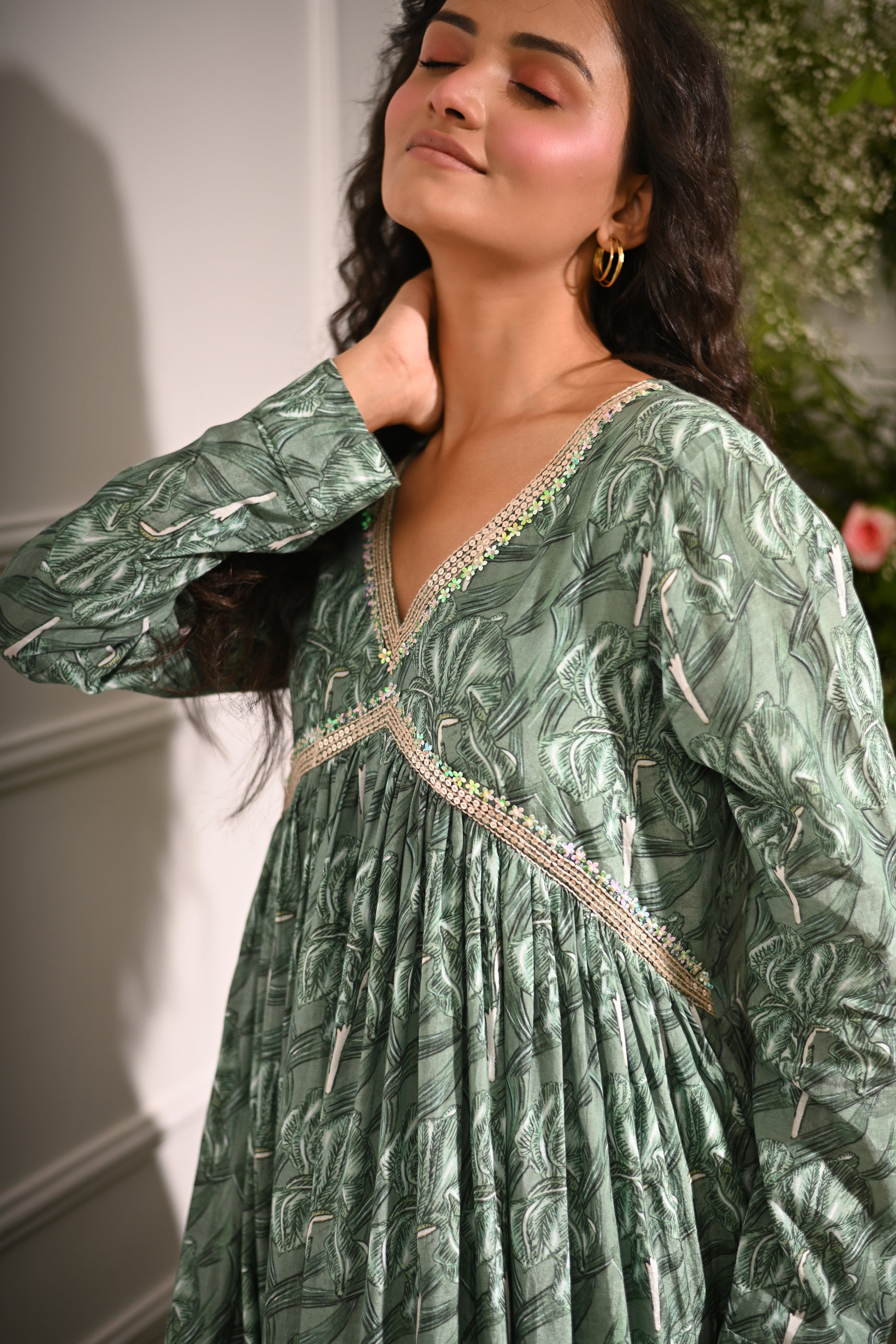 Our Iris Suit Set, crafted with exquisite detailing, offers a sophisticated and vibrant look. This set features an embroidered printed Anarkali kurta paired with a cutwork cotton and organza panelled salwar, complete with a hand-embroidered border and a fully elastic waistband. The ensemble is finished with a Dupion Organza dupatta adorned with lace details.