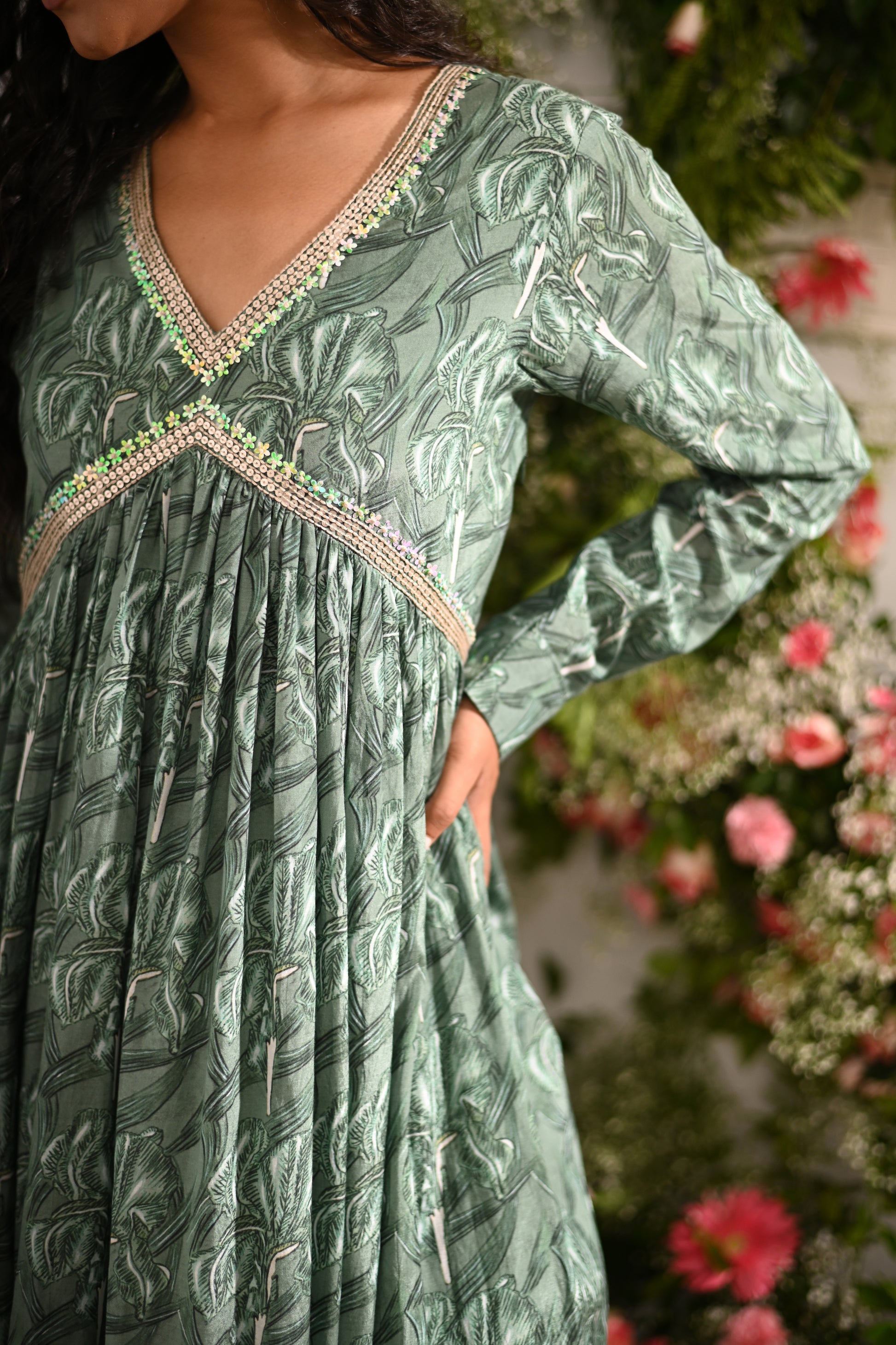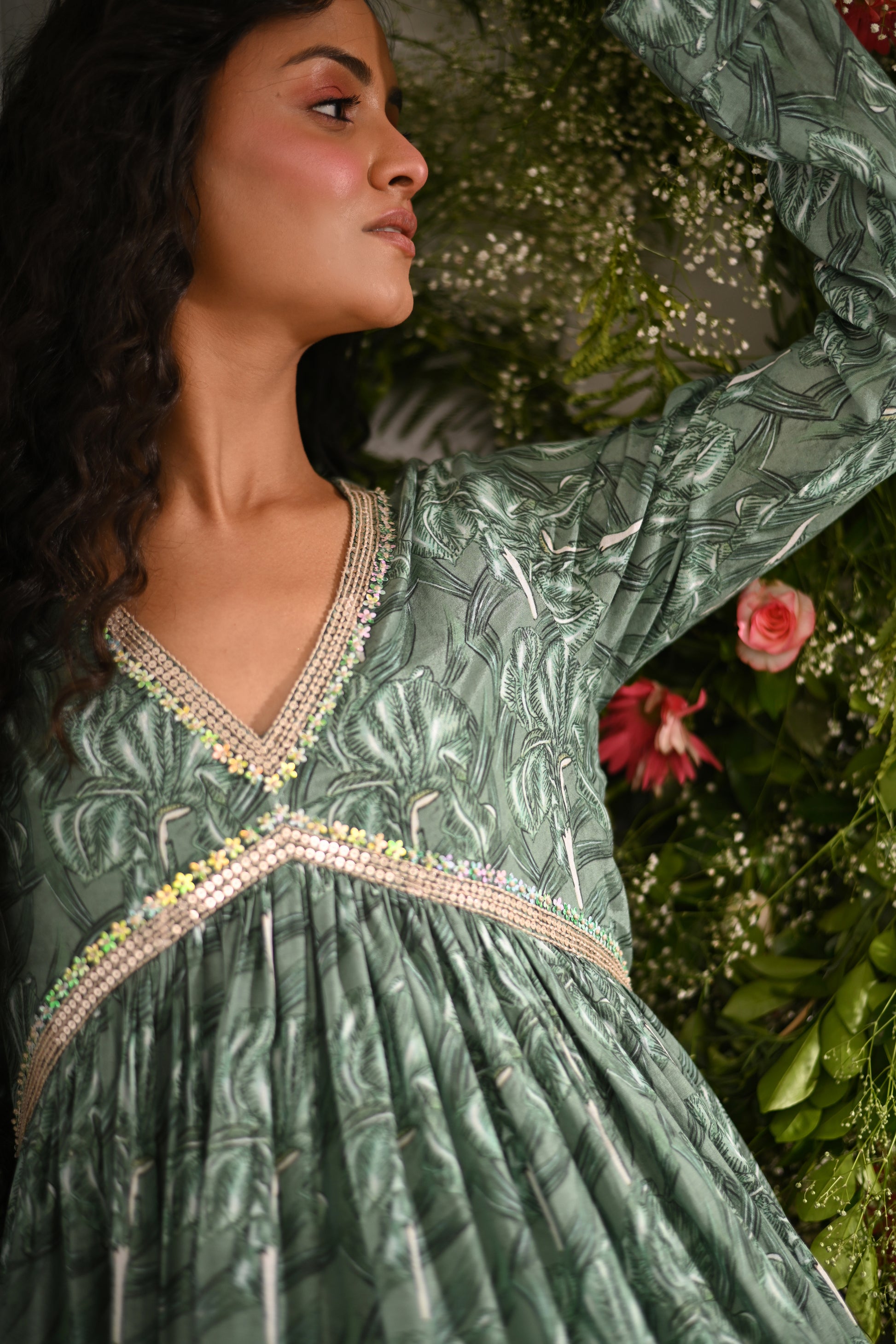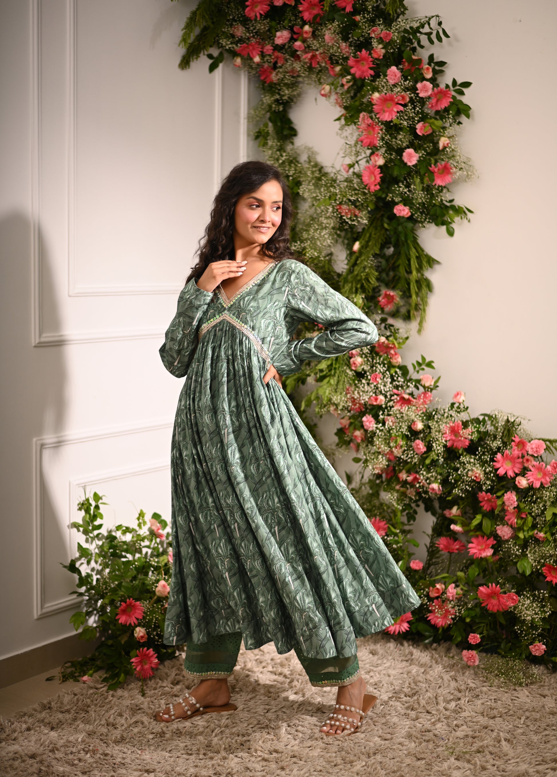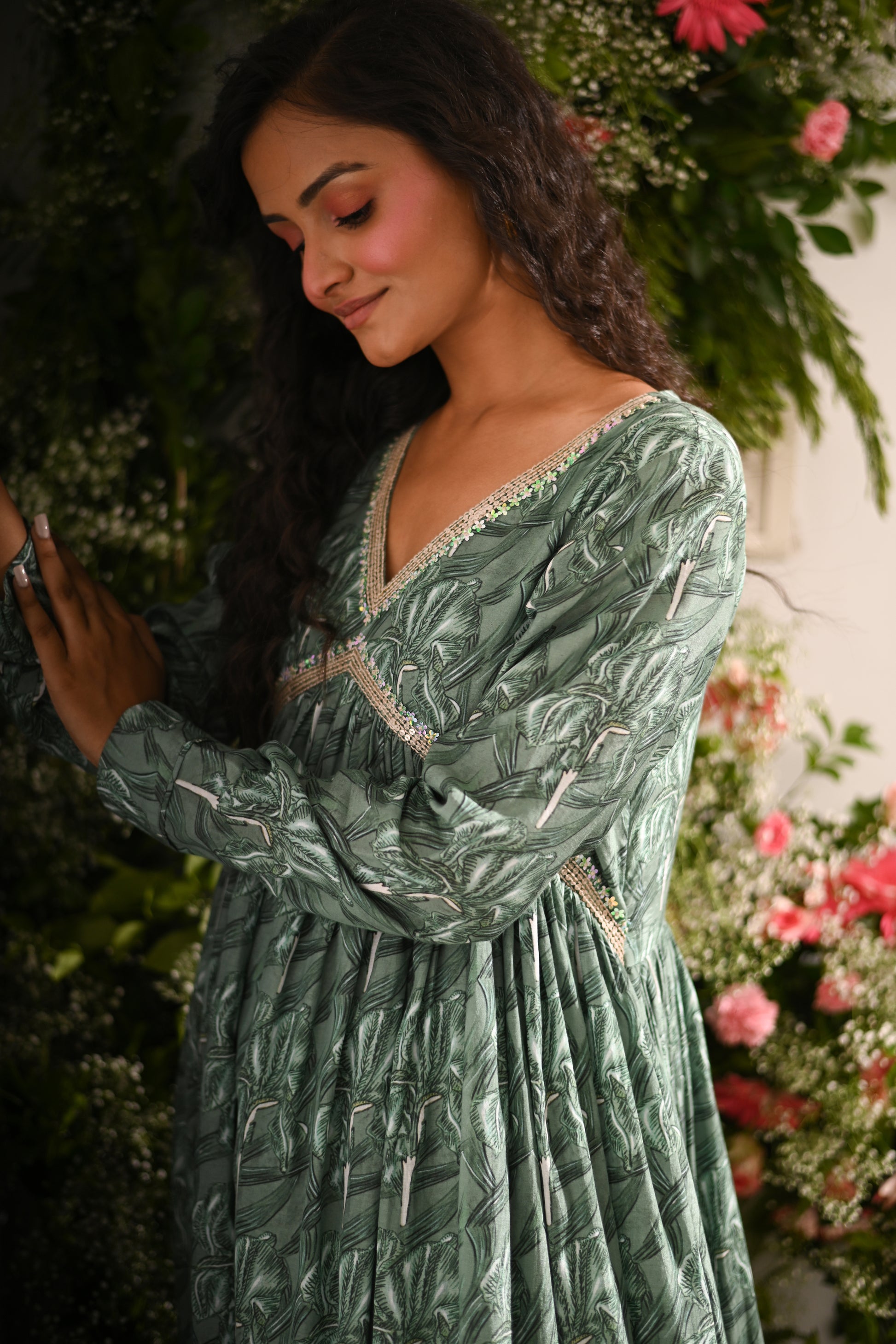 Our Iris Suit Set, crafted with exquisite detailing, offers a sophisticated and vibrant look. This set features an embroidered printed Anarkali kurta paired with a cutwork cotton and organza panelled salwar, complete with a hand-embroidered border and a fully elastic waistband. The ensemble is finished with a Dupion Organza dupatta adorned with lace details.