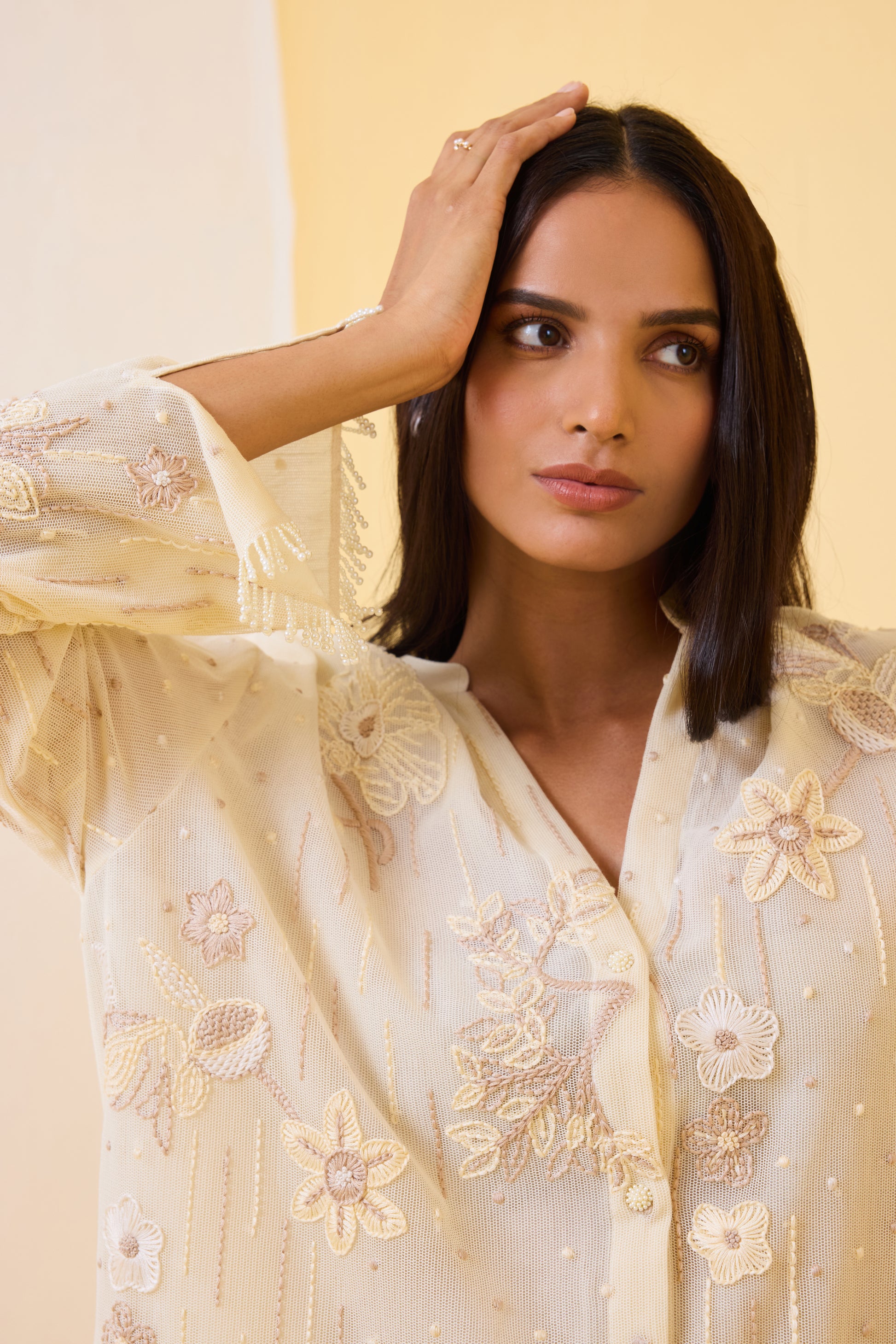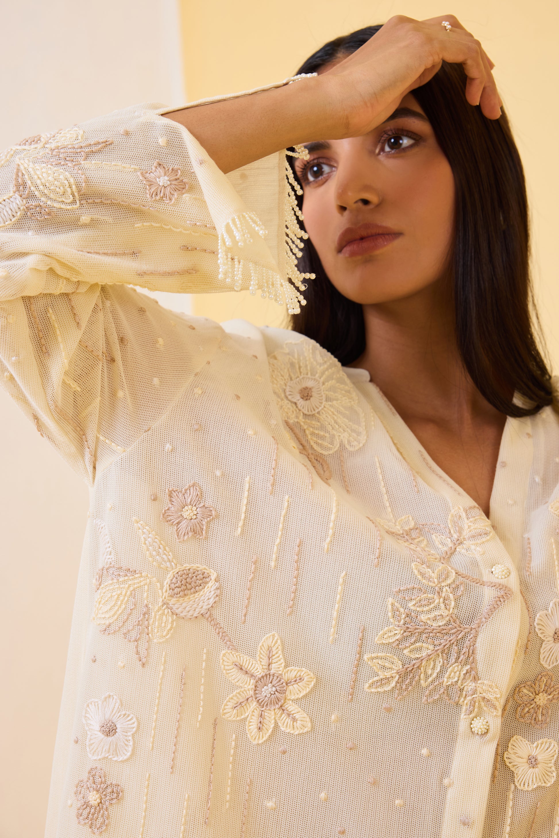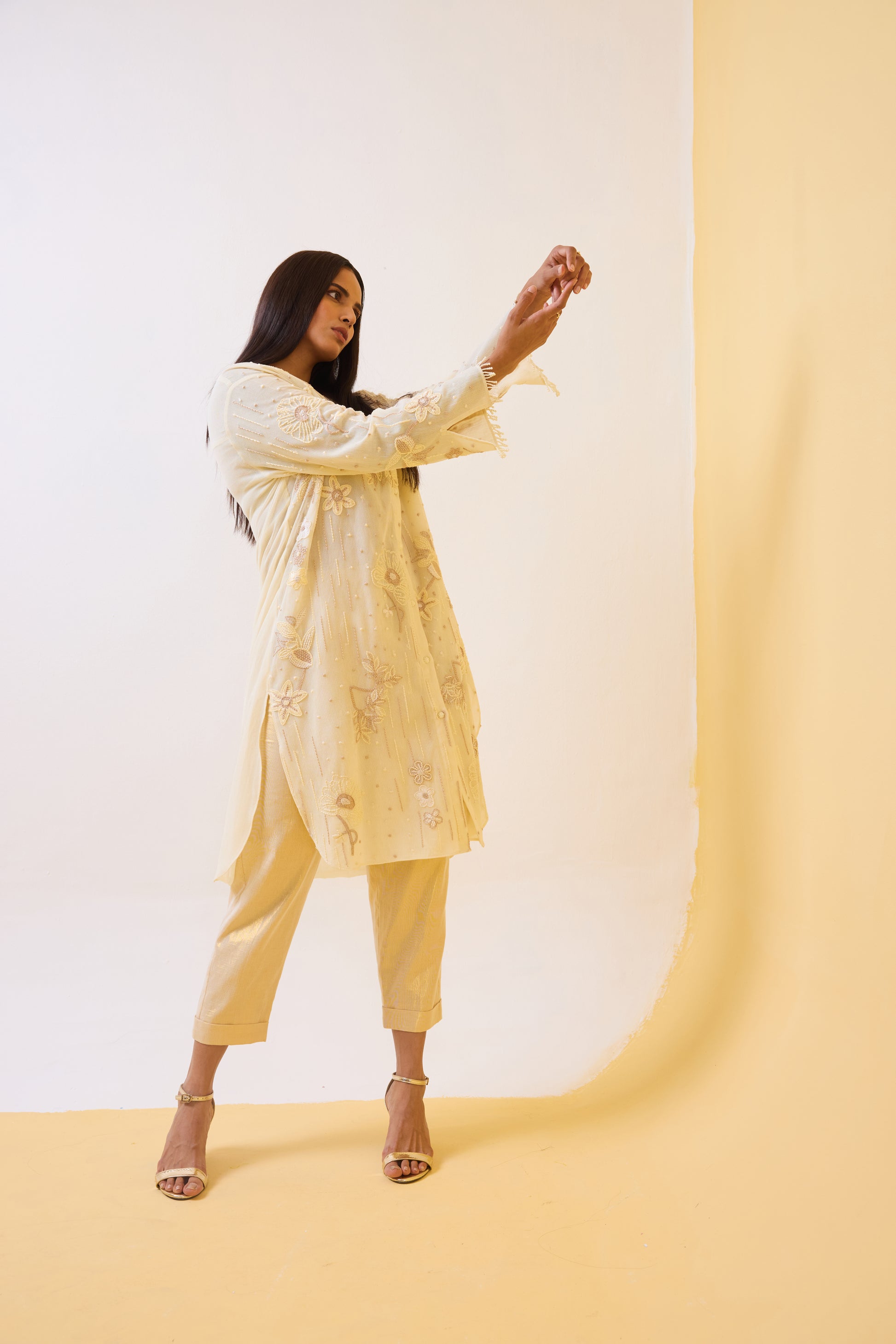 The Msasa Co-Ord Set features a relaxed-fit, button-up long kurta with full sleeves, adorned with all-over delicate hand embroidery and handmade pearl tassels. The kurta is paired with tapered gold-coloured pants that have an elasticated waistband, pockets, and a side zipper, offering both style and comfort.