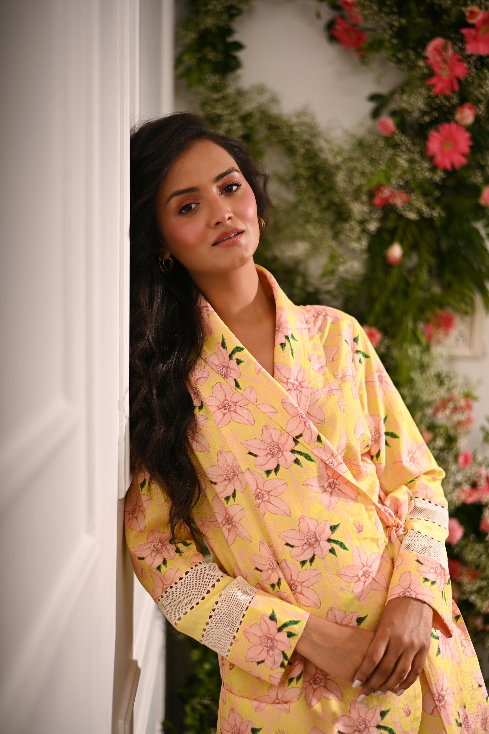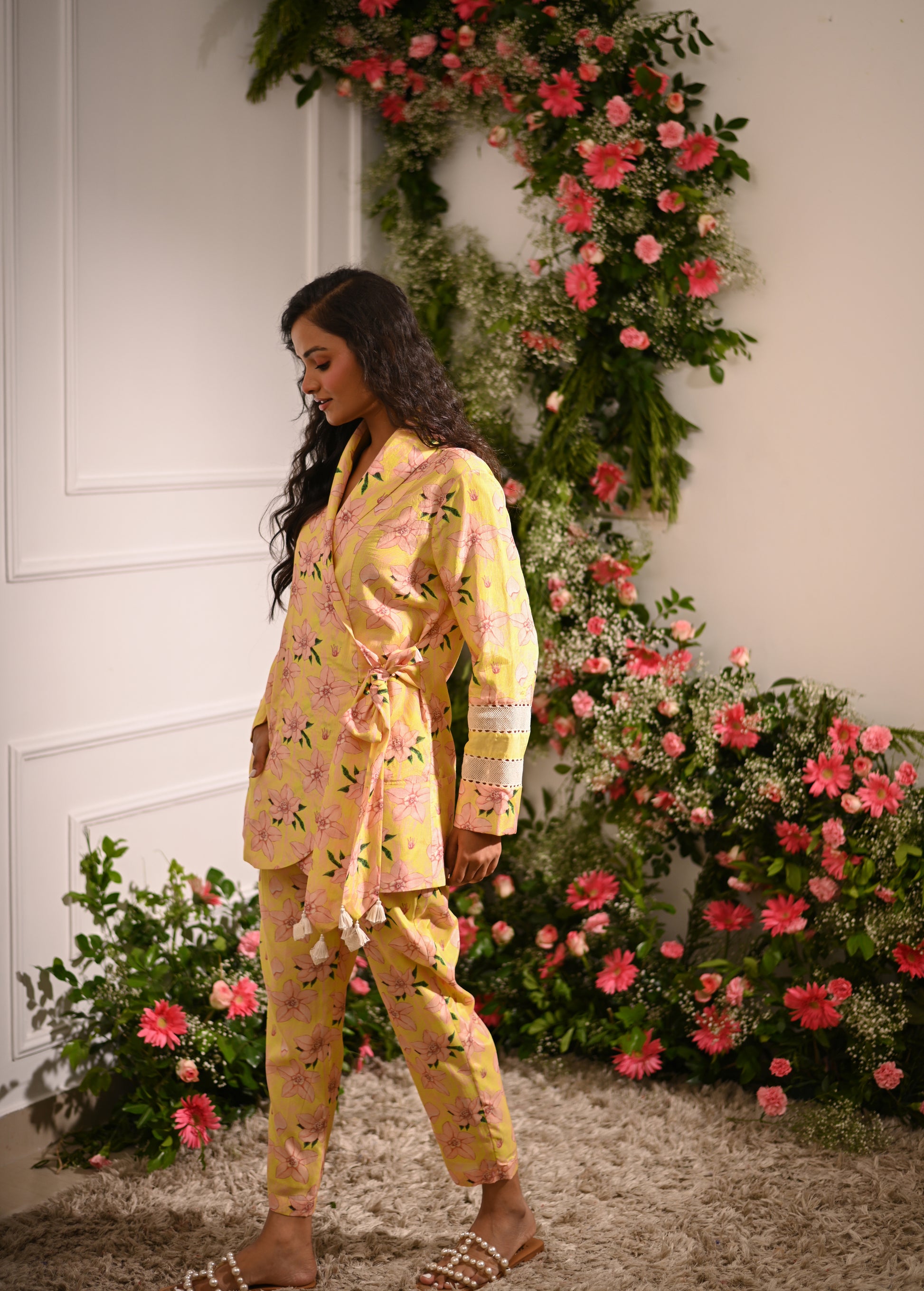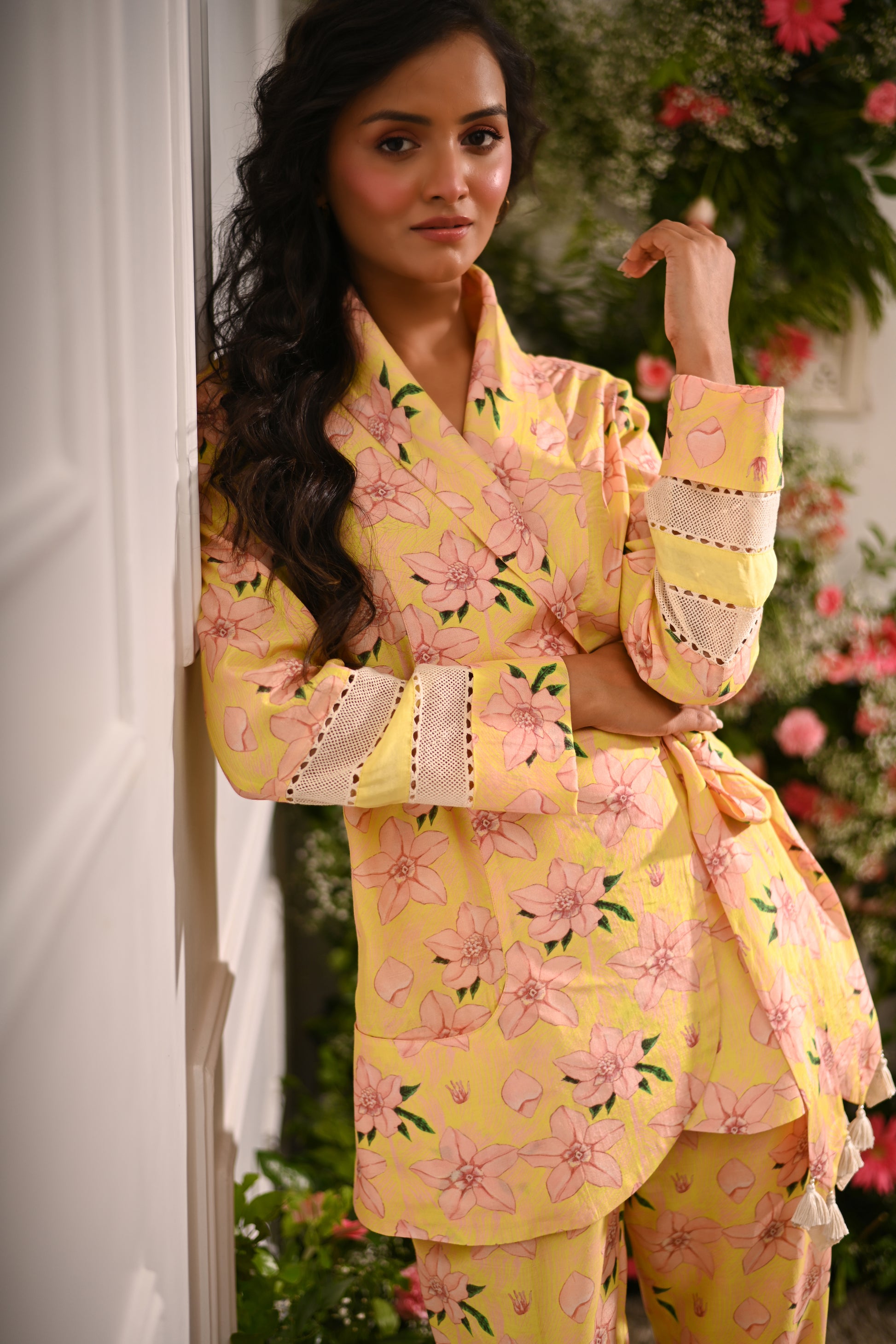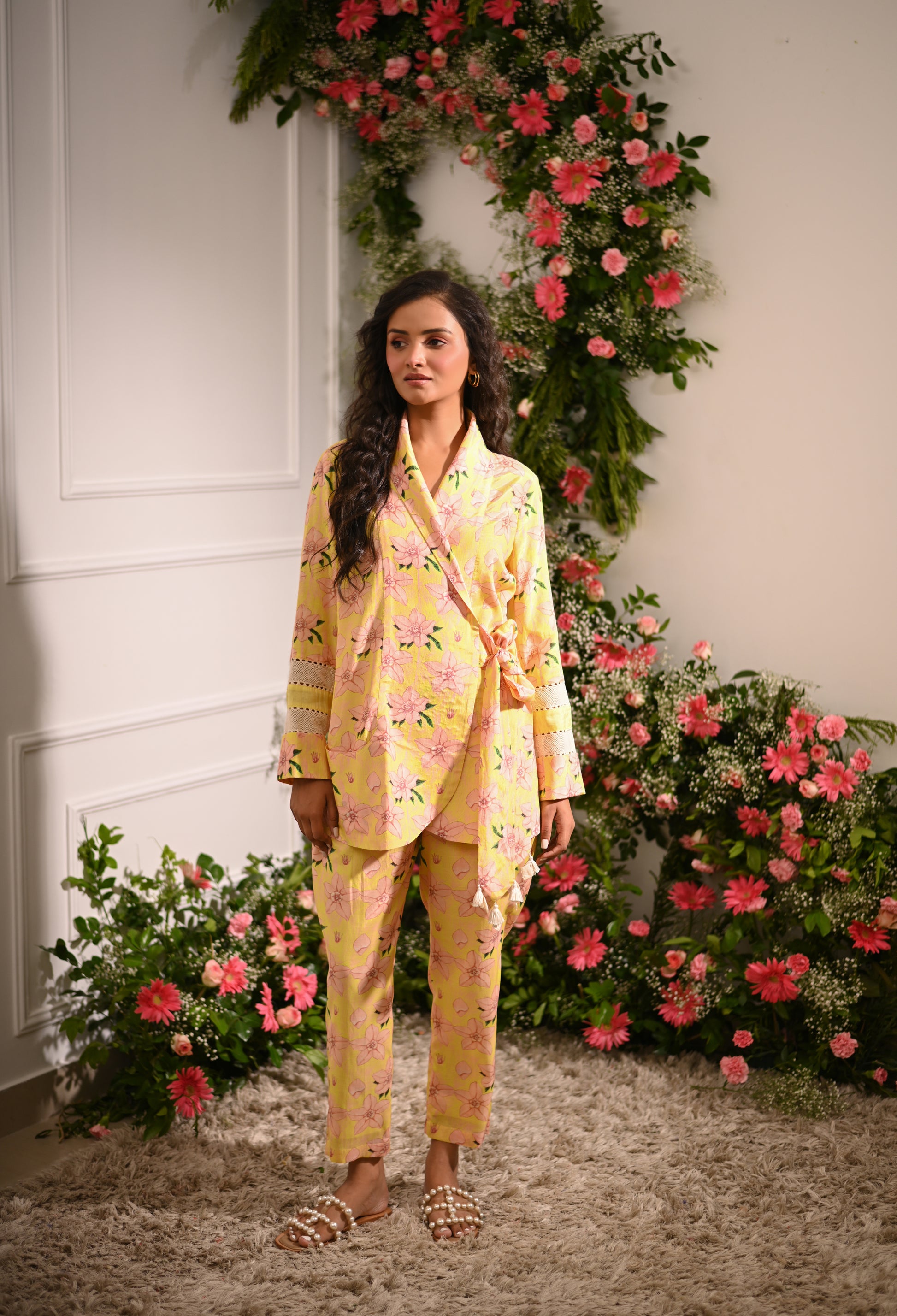 Our Orientalis Co-ord Set, crafted with exquisite detailing, offers a chic and elegant look. This set features a printed lightweight wrap shacket adorned with lace and handmade tassel detailing, paired with tapered hem trousers featuring a half-elastic waistband. The full sleeves and vibrant butter yellow colour enhance the sophisticated appeal of this ensemble.