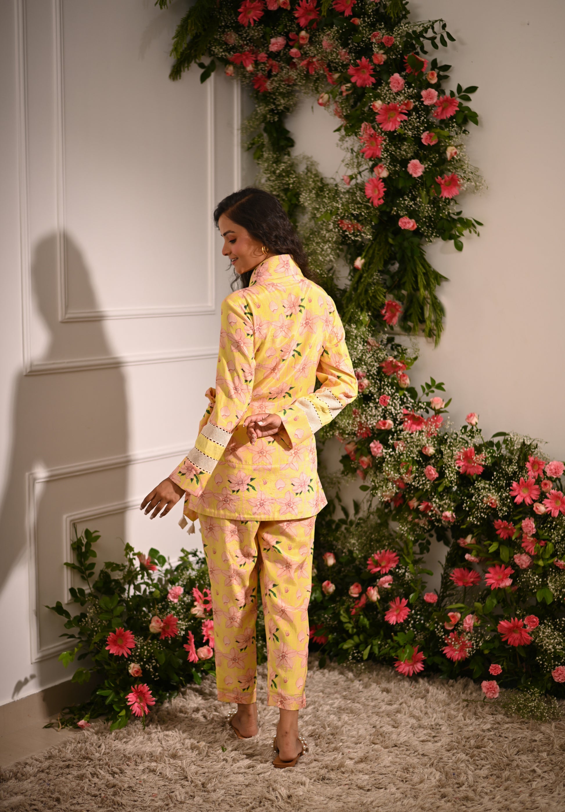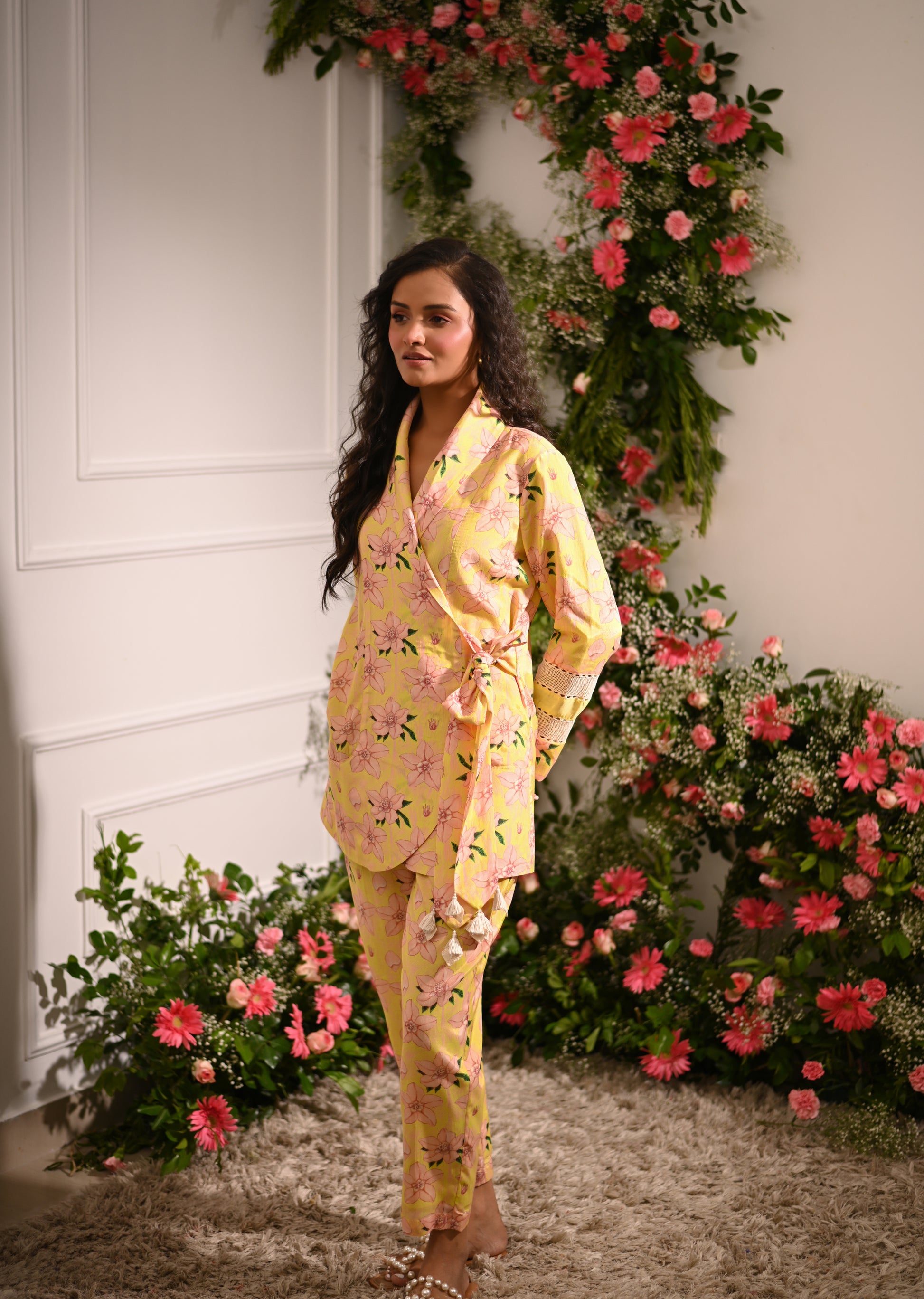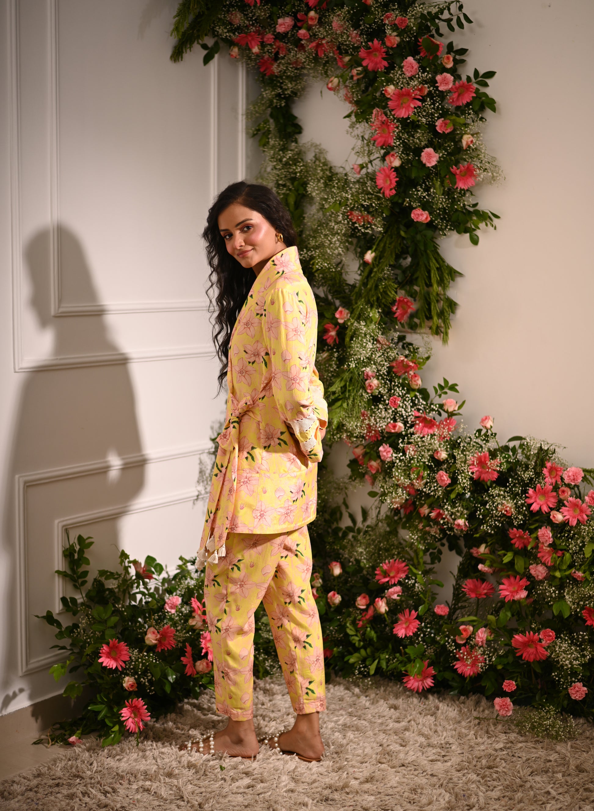 Our Orientalis Co-ord Set, crafted with exquisite detailing, offers a chic and elegant look. This set features a printed lightweight wrap shacket adorned with lace and handmade tassel detailing, paired with tapered hem trousers featuring a half-elastic waistband. The full sleeves and vibrant butter yellow colour enhance the sophisticated appeal of this ensemble.