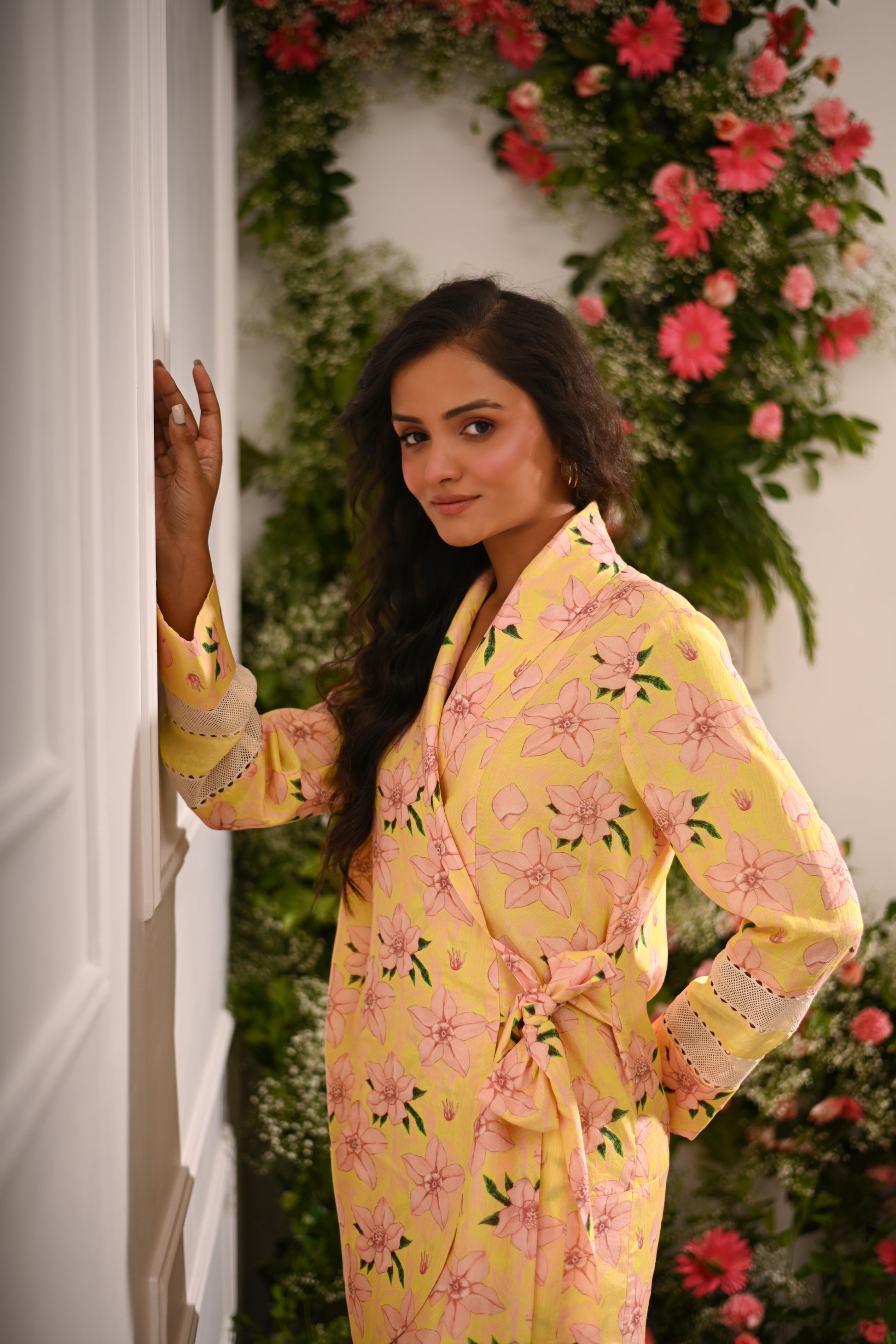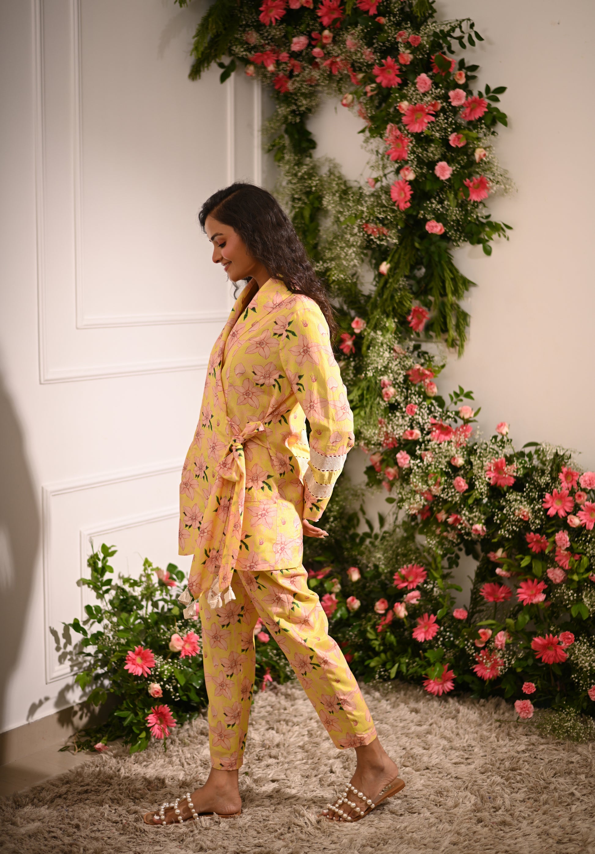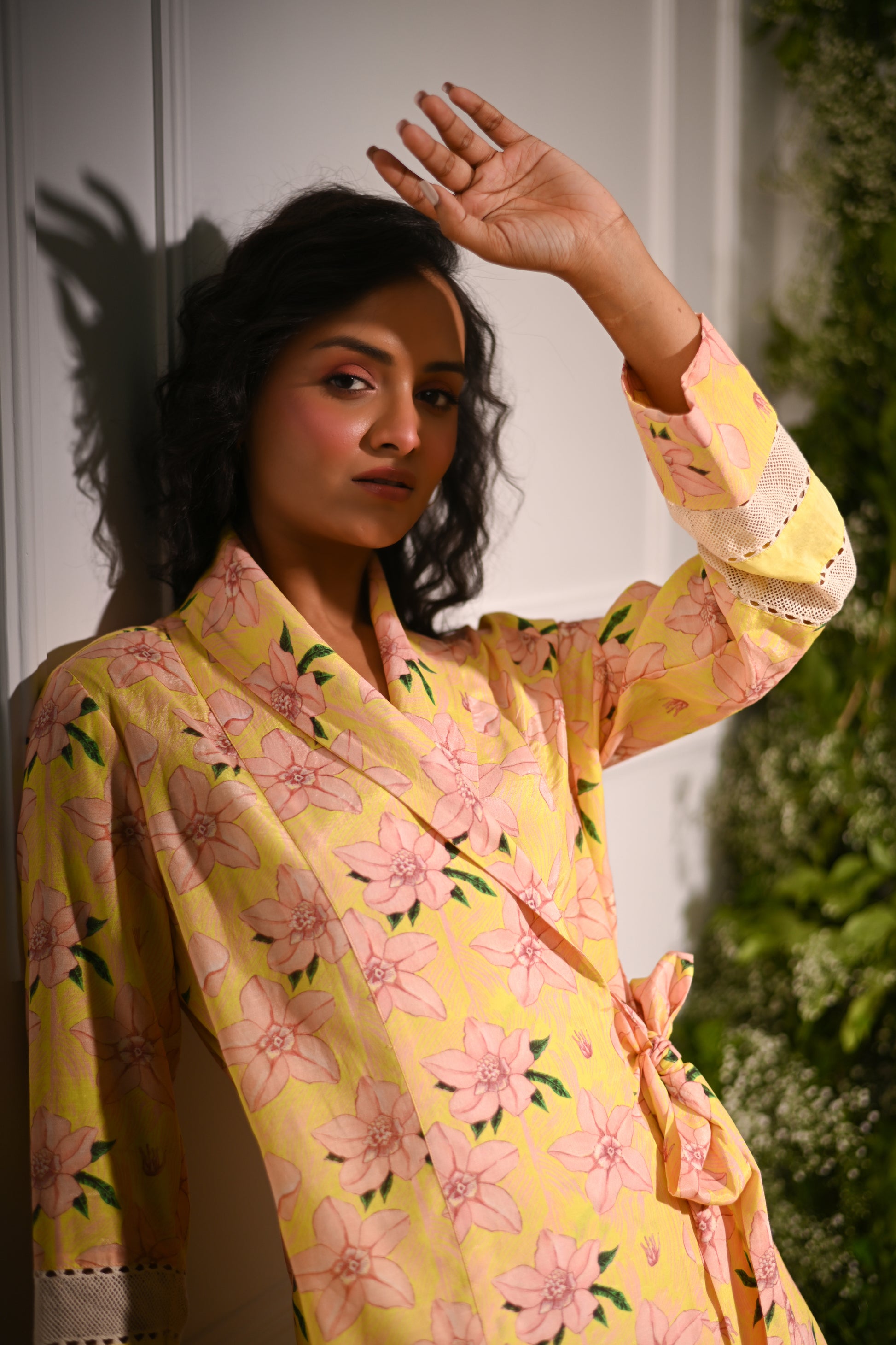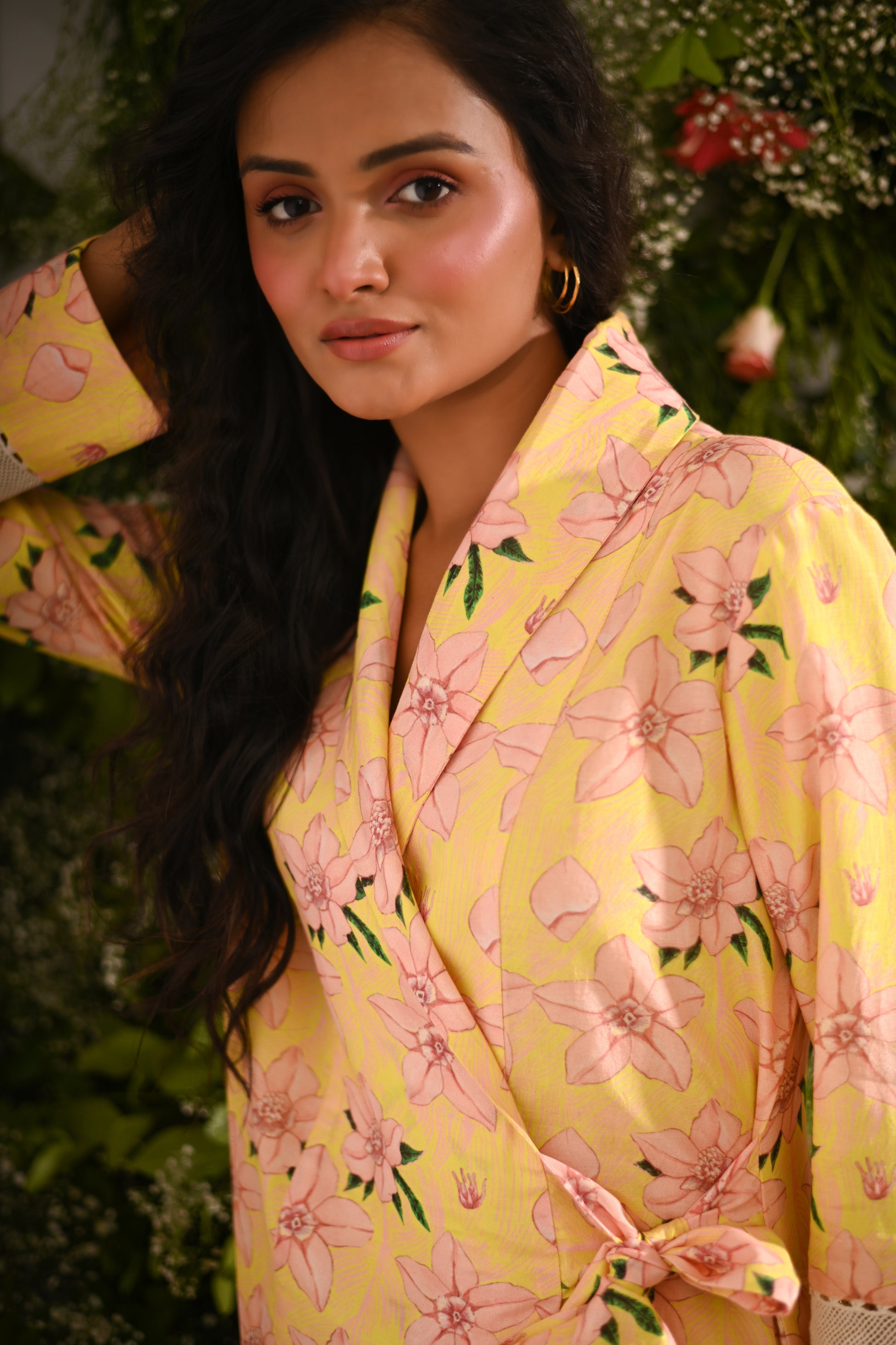 Our Orientalis Co-ord Set, crafted with exquisite detailing, offers a chic and elegant look. This set features a printed lightweight wrap shacket adorned with lace and handmade tassel detailing, paired with tapered hem trousers featuring a half-elastic waistband. The full sleeves and vibrant butter yellow colour enhance the sophisticated appeal of this ensemble.