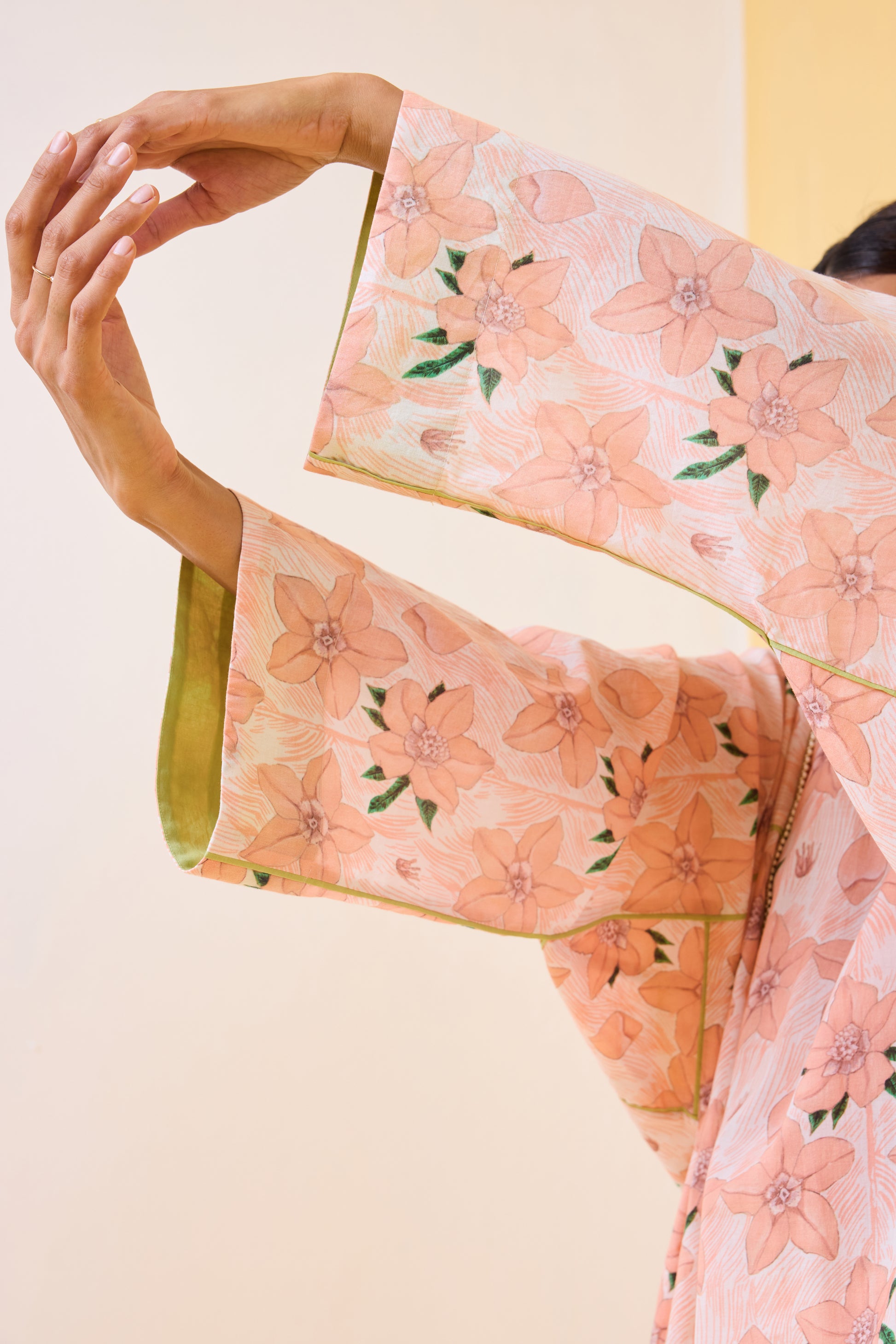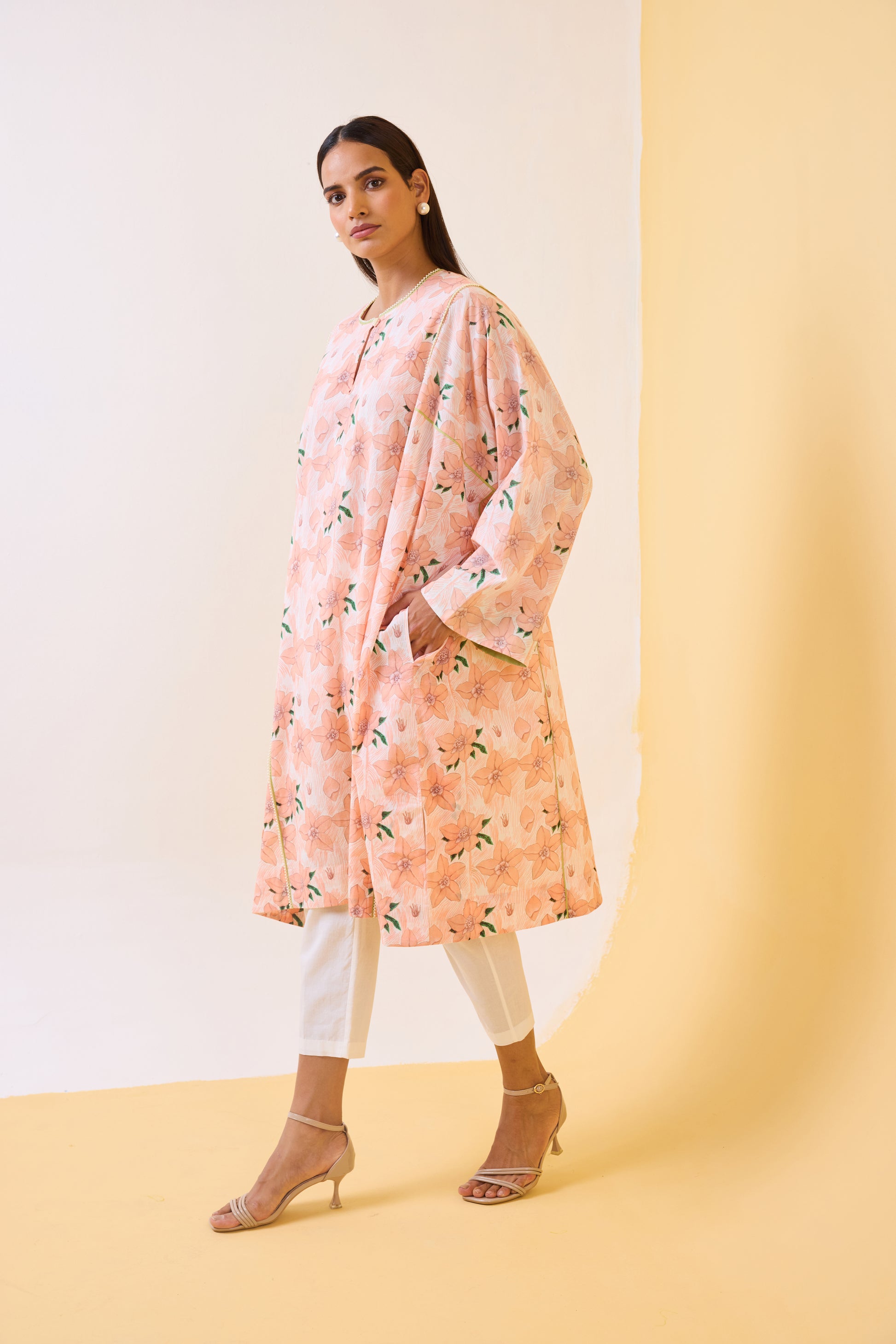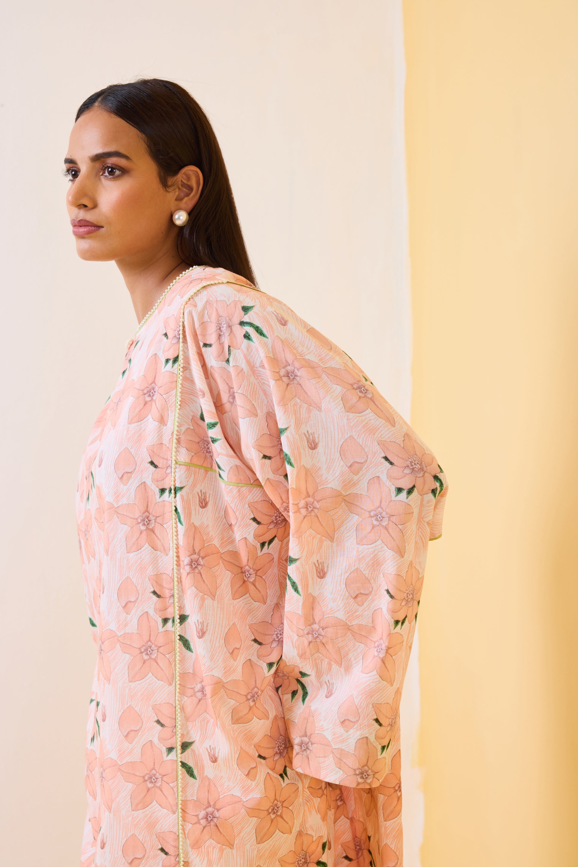 The Peachy Rose-Bud Pheran Kurta Set features a pheran-style kurta with a round neckline, adorned with contrast fabric edging and delicate pearl details. Paired with relaxed-fit pants that come with a tapered hem and a half-elasticated waistband, this set offers both style and comfort. The ensemble is finished with the same print fabric for a cohesive look.
