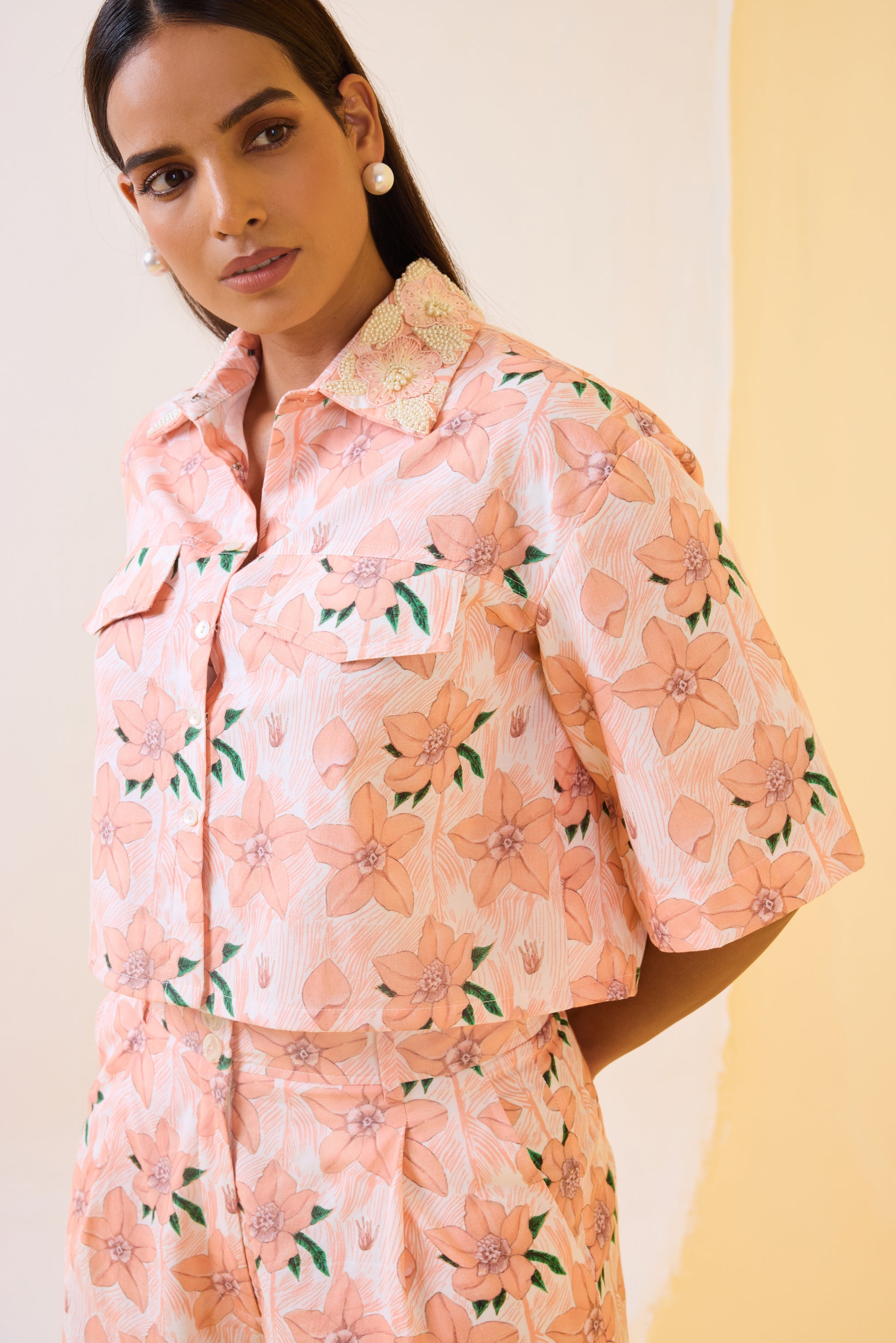 The Peach Rose-Bud Shirt Set features a cropped shirt with short sleeves, front false-flap pockets, and a button-up front with pearl and thread hand embroidery at the collar. Paired with cropped palazzo pants that include a front zipper and hook opening, this co-ord set combines chic style with practicality.