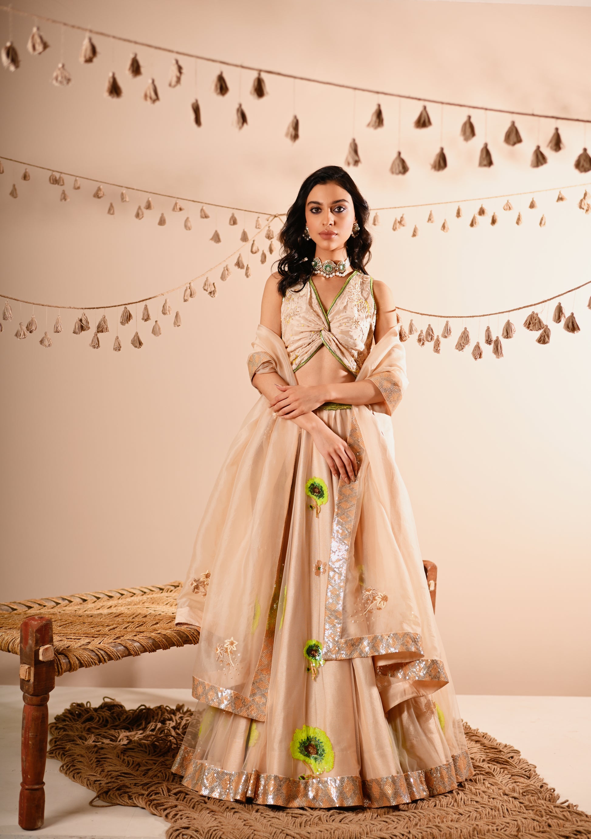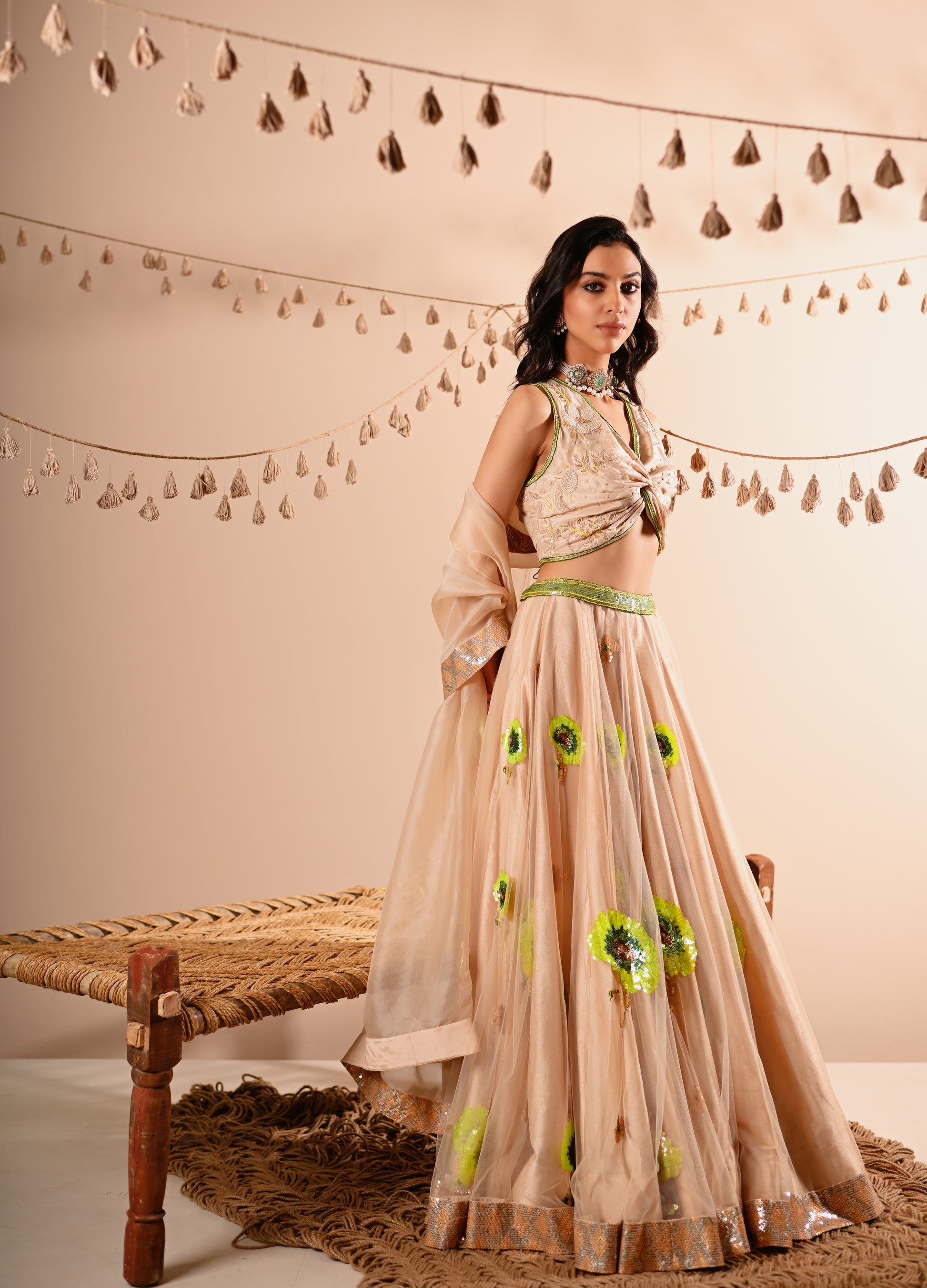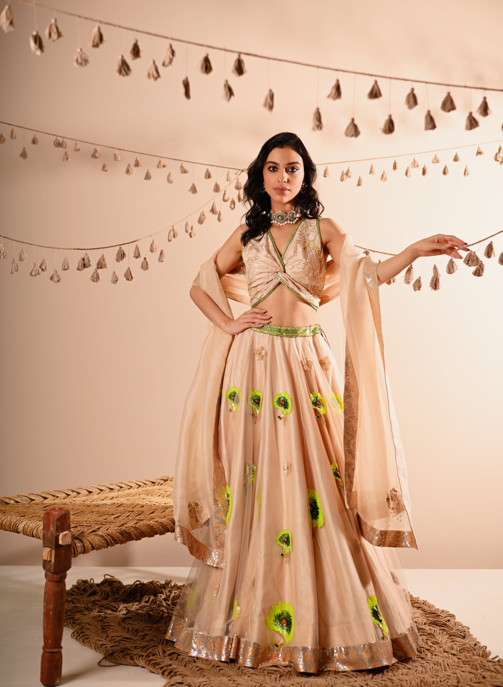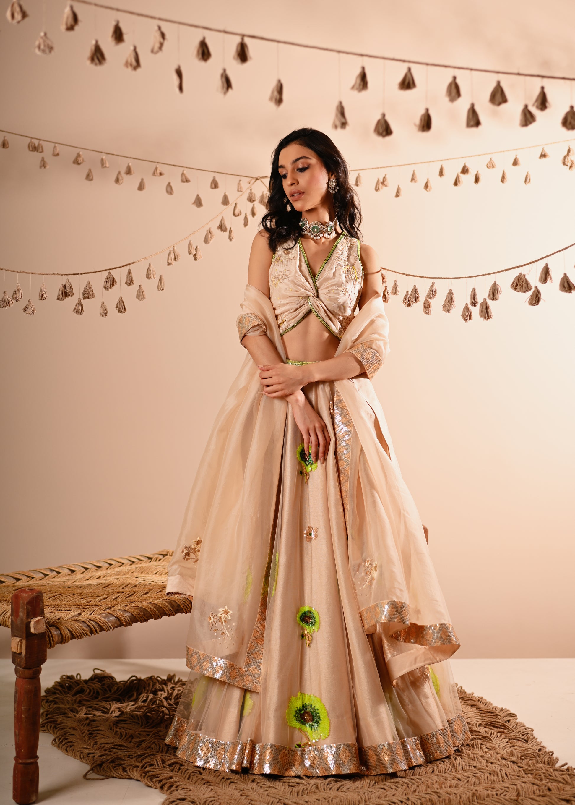Our Poppy Lehenga Set, crafted with exquisite detailing, offers a luxurious and elegant look. This set features a hand-embroidered draped V-neck top with a side concealed zipper, paired with a lehenga that boasts a 10-meter flare, 12 Kalis, and an attached double lining. The lehenga is designed with a belt, tassel tie, and side zipper for a perfect fit. The ensemble is completed with a full-size organza dupatta, adding a touch of grace to this champagne-beige set.