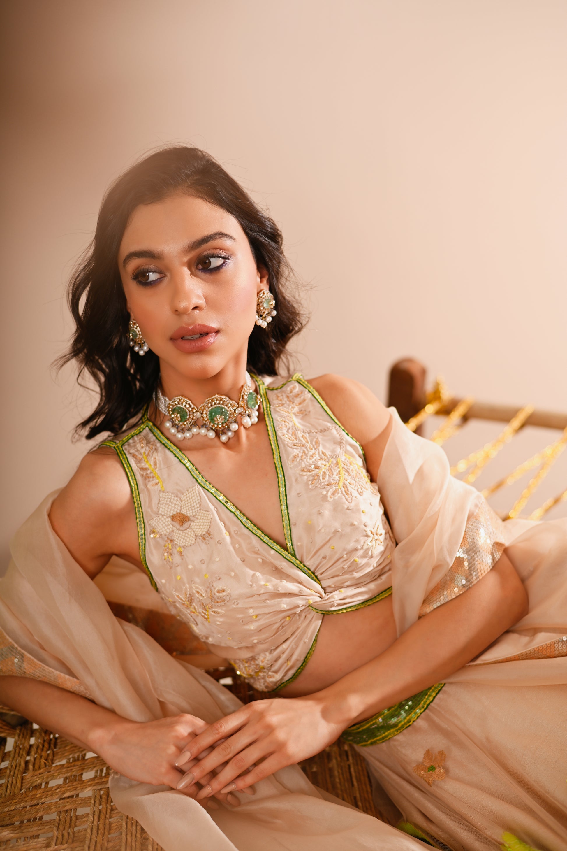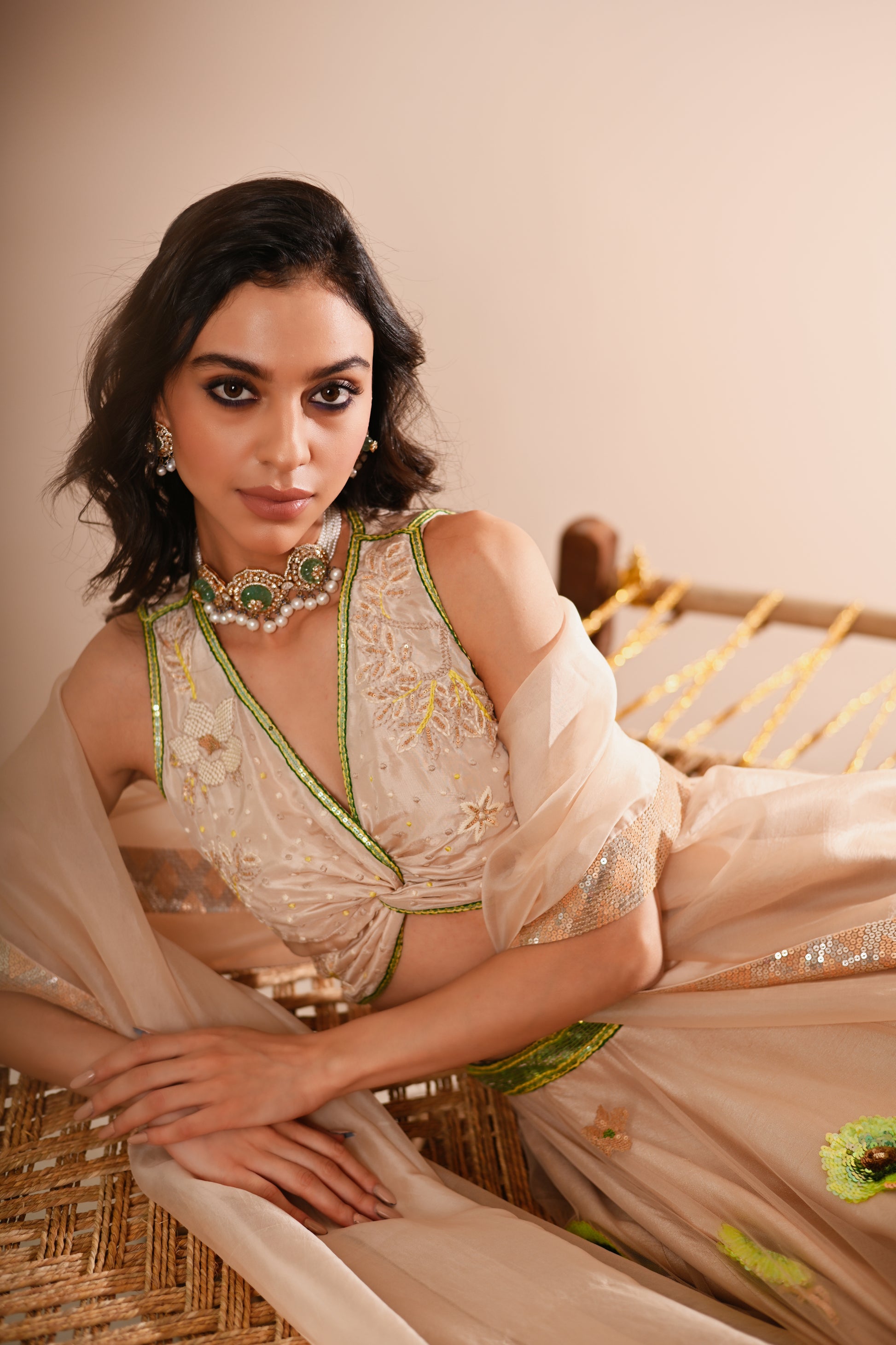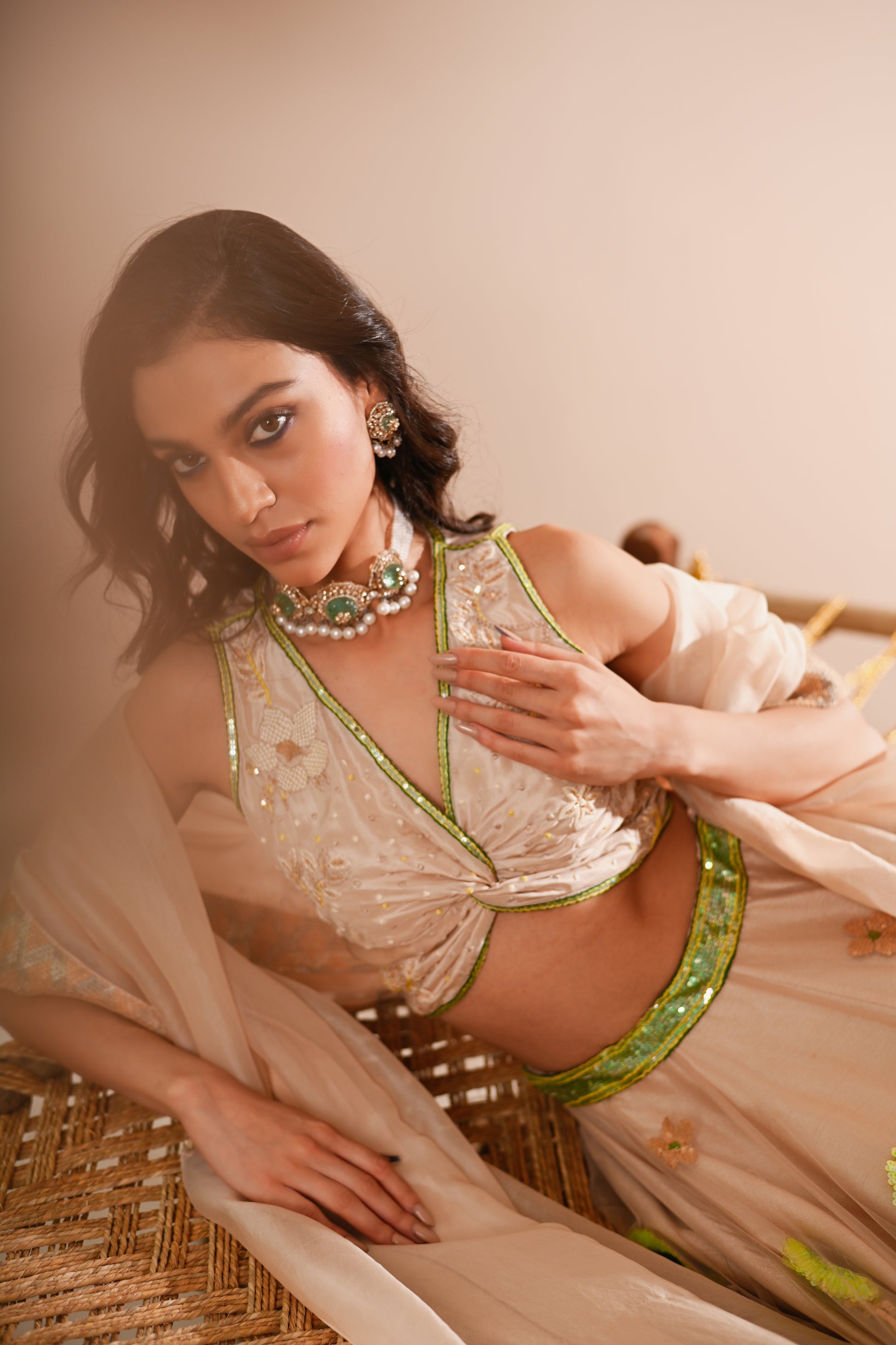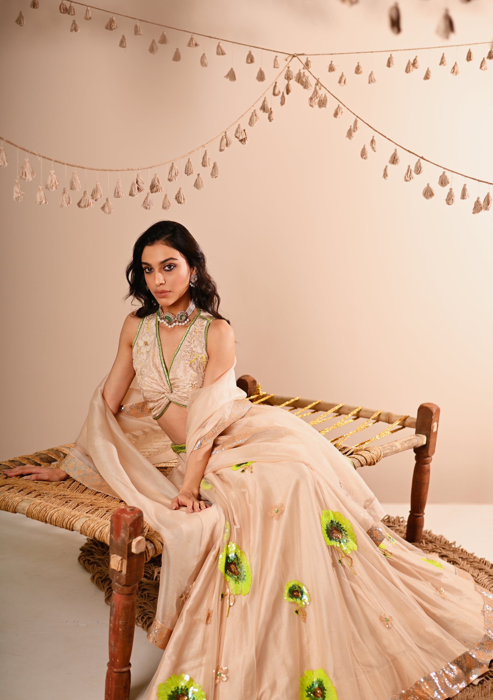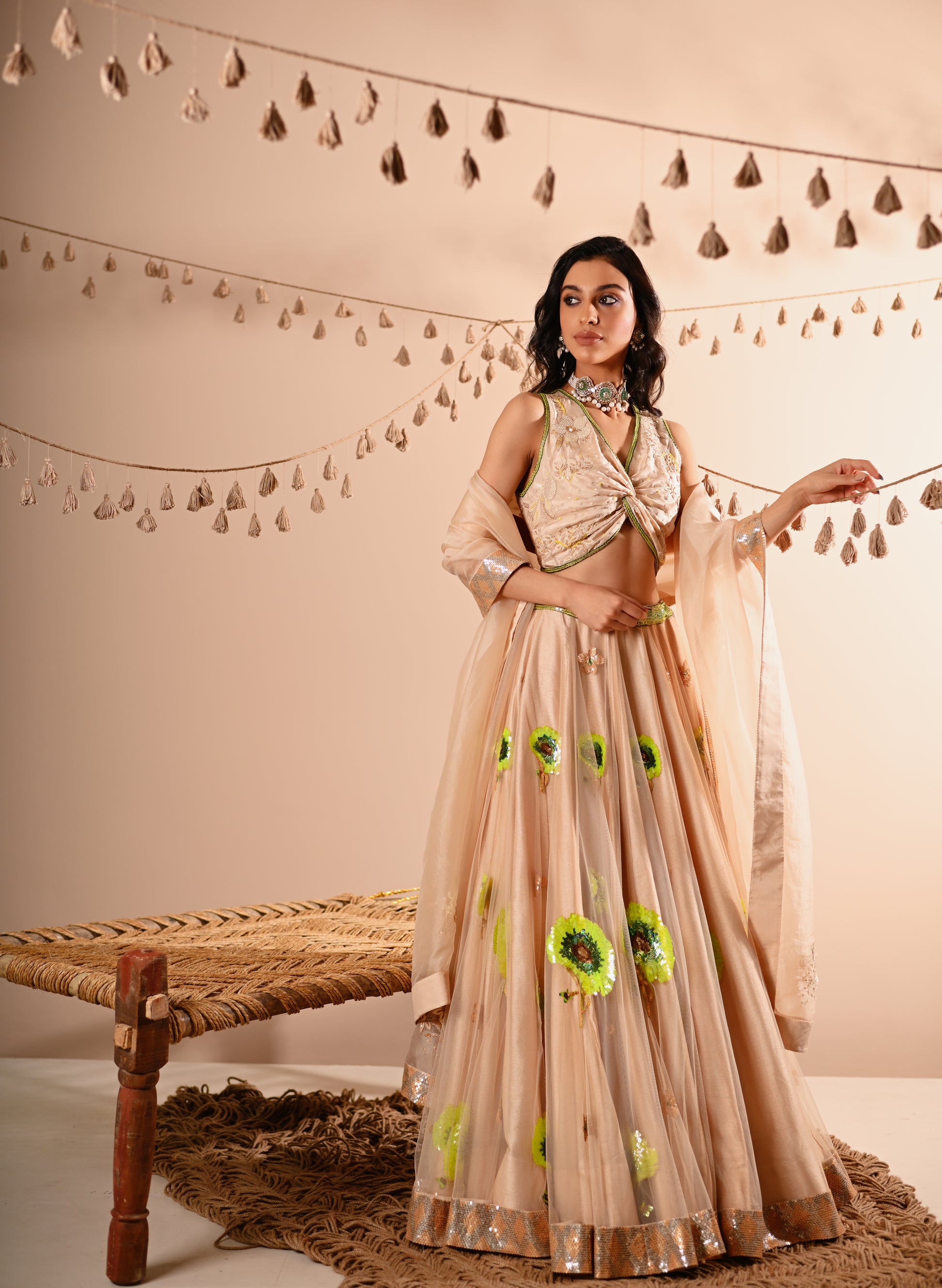 Our Poppy Lehenga Set, crafted with exquisite detailing, offers a luxurious and elegant look. This set features a hand-embroidered draped V-neck top with a side concealed zipper, paired with a lehenga that boasts a 10-meter flare, 12 Kalis, and an attached double lining. The lehenga is designed with a belt, tassel tie, and side zipper for a perfect fit. The ensemble is completed with a full-size organza dupatta, adding a touch of grace to this champagne-beige set.
