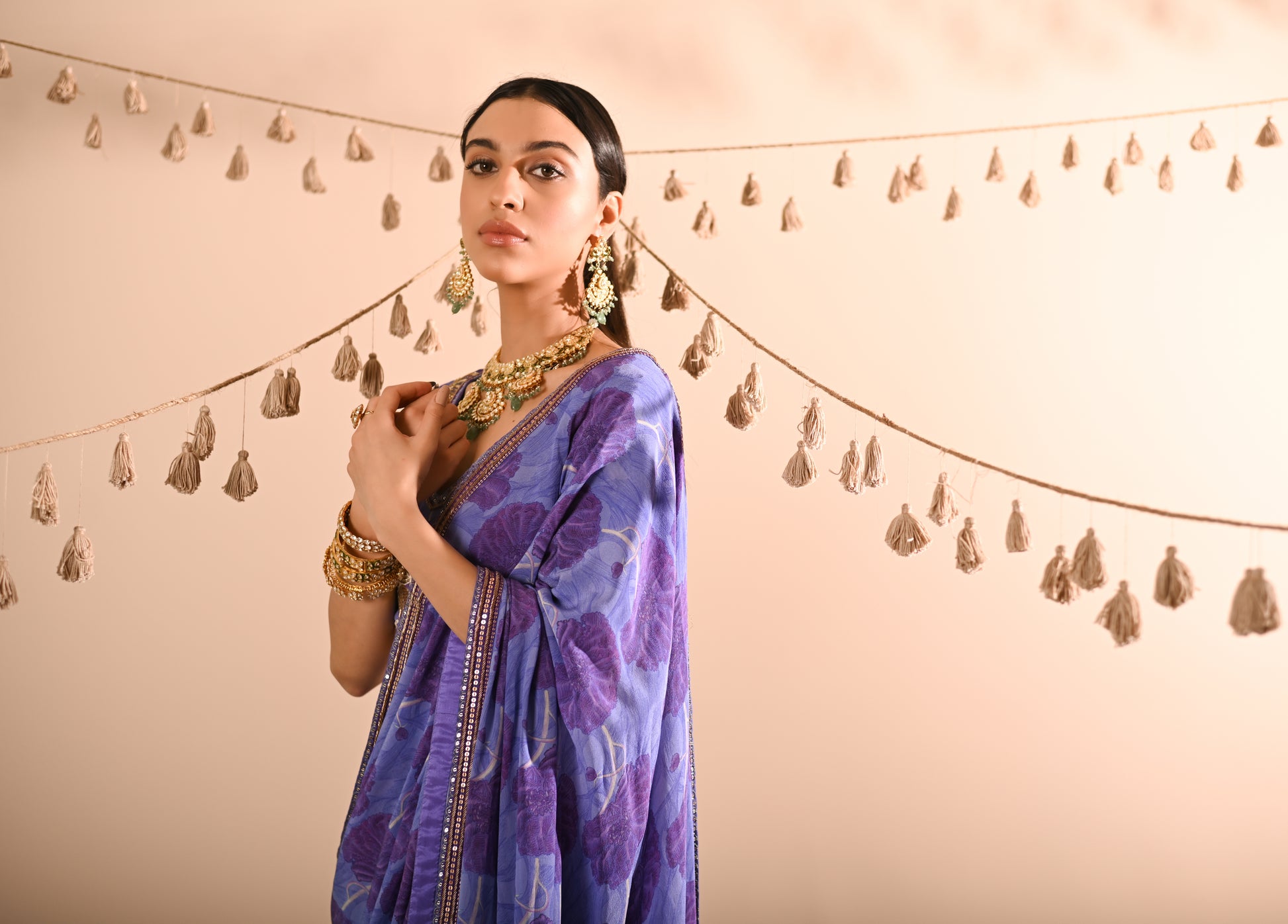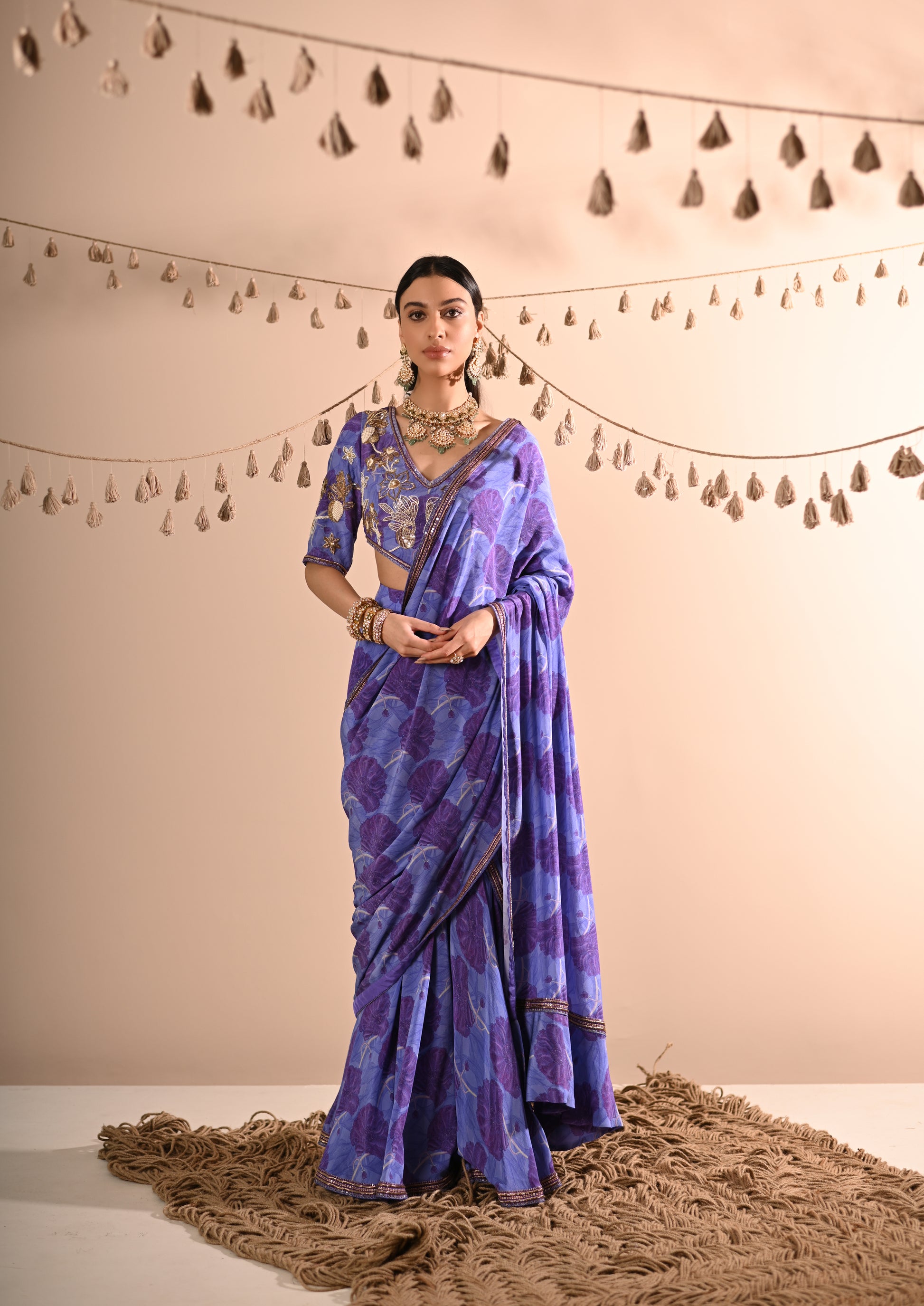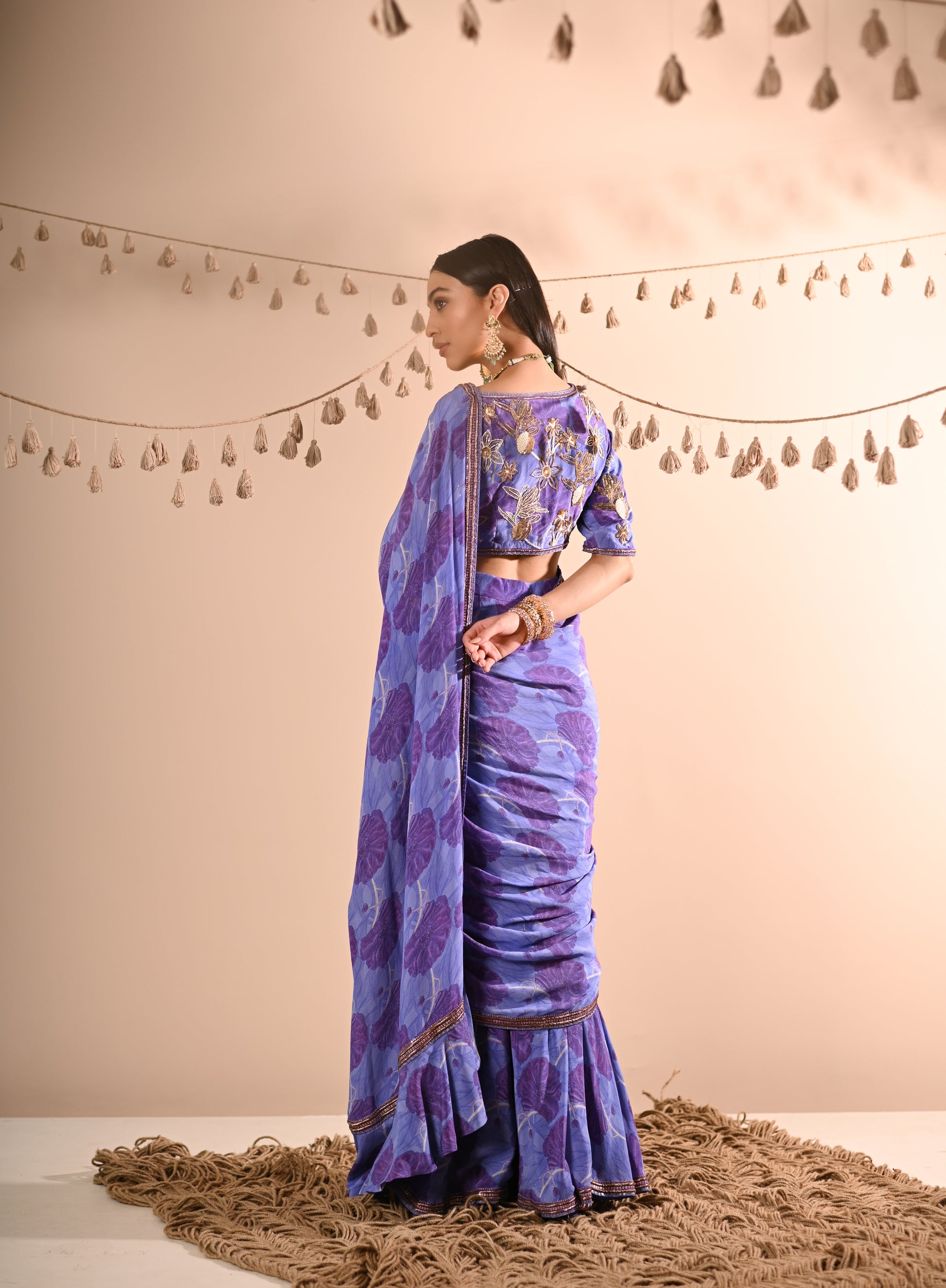Our Poppy Pre-Draped Sharara Saree Set, crafted with exquisite detailing, offers a chic and contemporary look. This set features a digital print with hand-embroidered accents. The blouse boasts a leaf-shaped neckline, half sleeves, attached padded cups, and a V-shaped hemline, with a convenient side zip opening. The pre-draped sharara saree is adorned with a ruffle pallu and an embroidered border and includes a belt and side zip opening for easy wear. The set is presented in a beautiful periwinkle blue, making it a standout choice for any occasion.