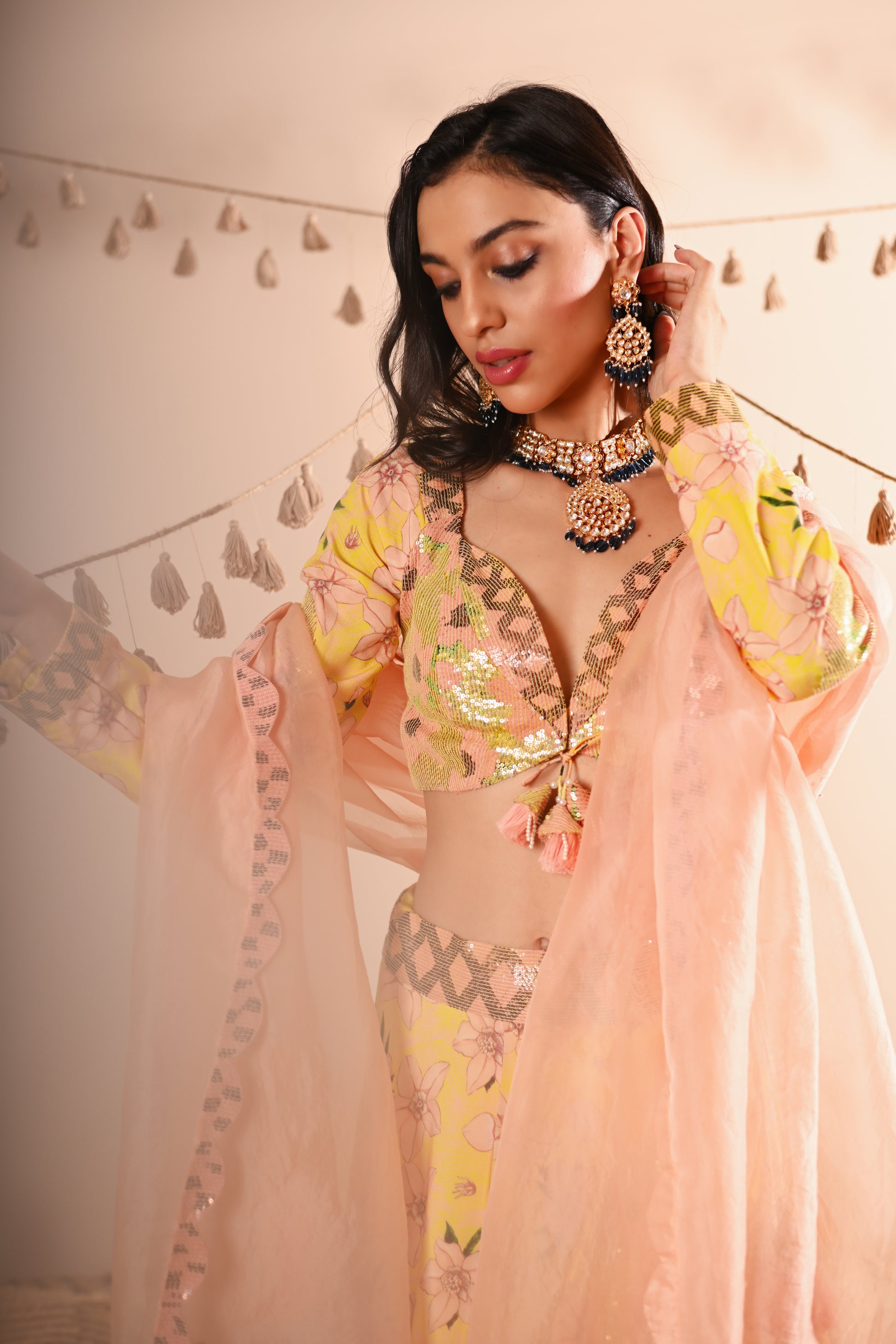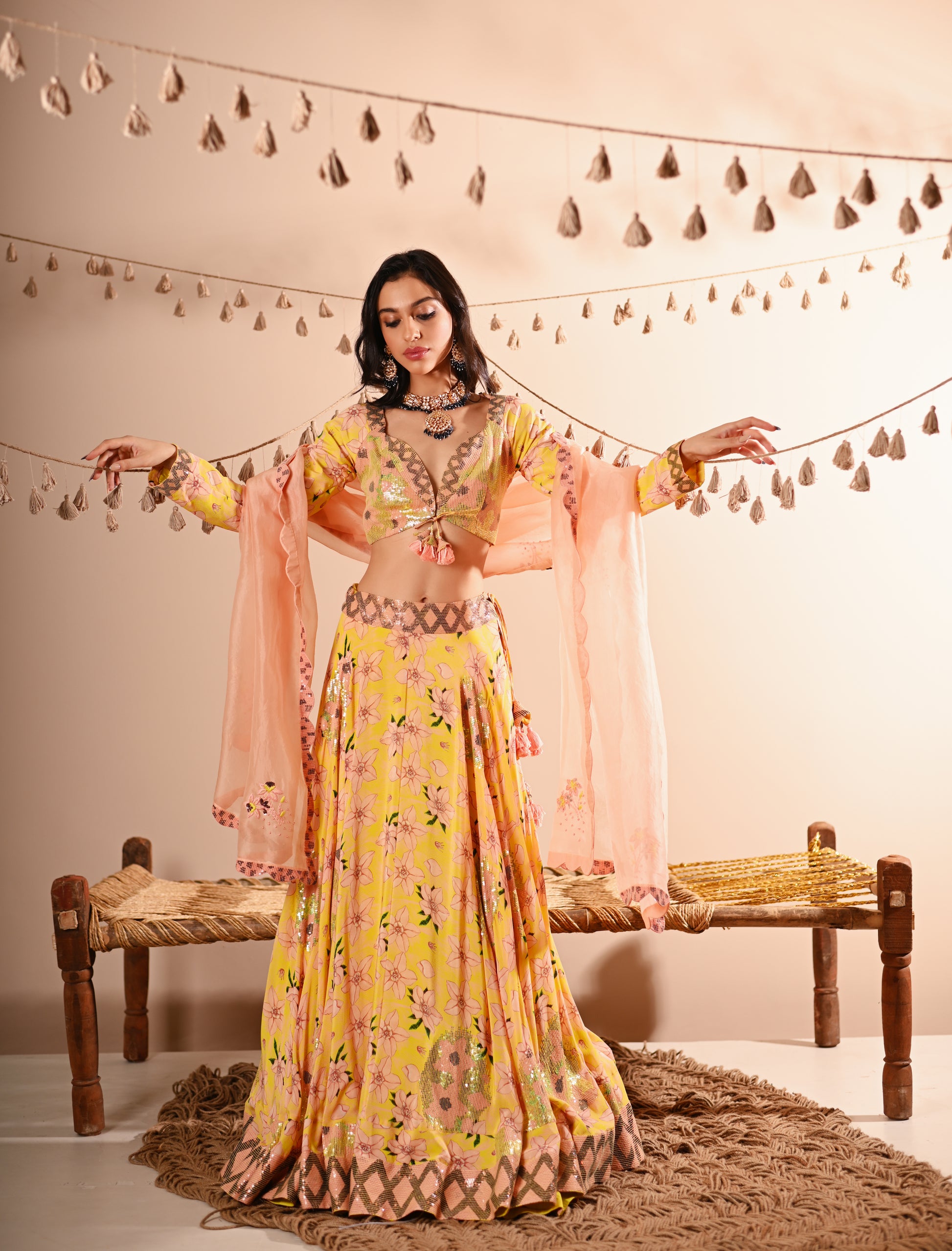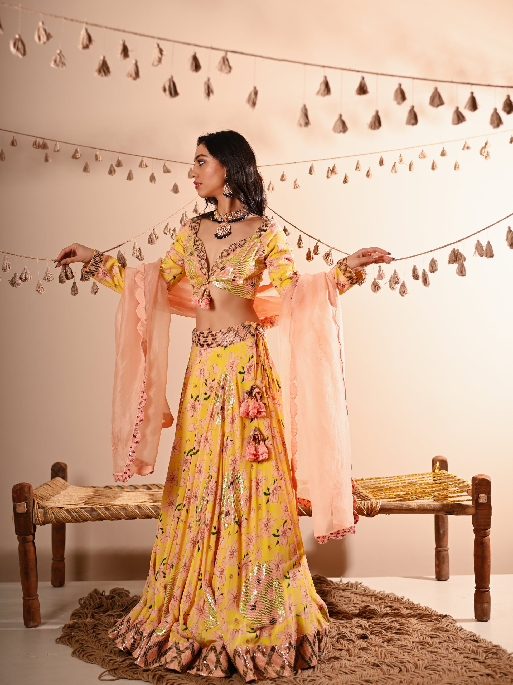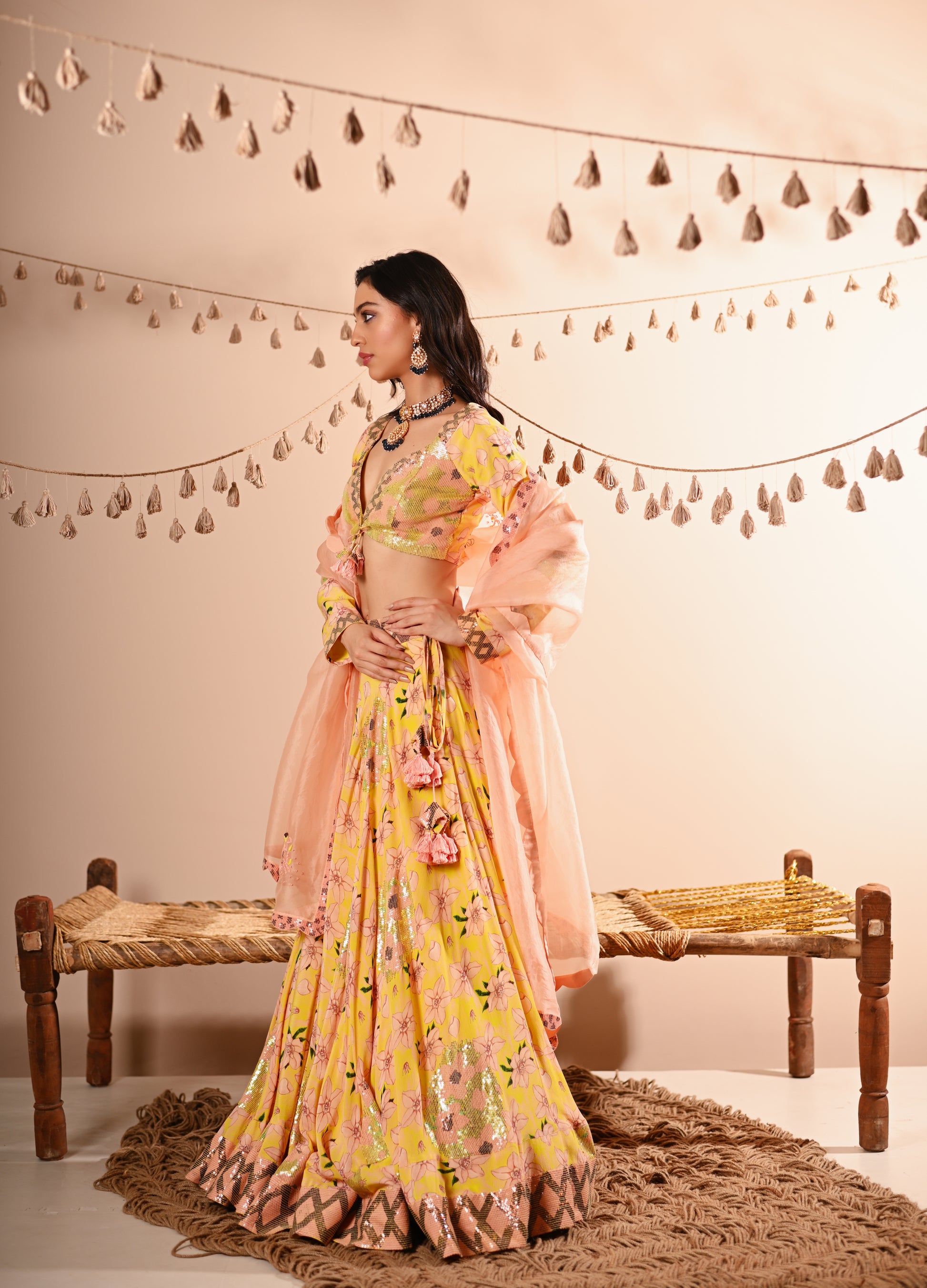 Our Rose Bud Lehenga Set, crafted with exquisite detailing, offers a vibrant and sophisticated look. This set features a digital print and hand-embroidered top with a sweetheart neckline, full sleeves, and a front hook and tassel tie opening. The lehenga is designed with a belt, tassel tie, side zipper, and hook opening, featuring a 4 kali circle and an 8-meter flare, along with two layers of attached lining. The ensemble is completed with a full-size organza dupatta, adding an elegant touch to the lemon-yellow base colour with multicoloured accents.