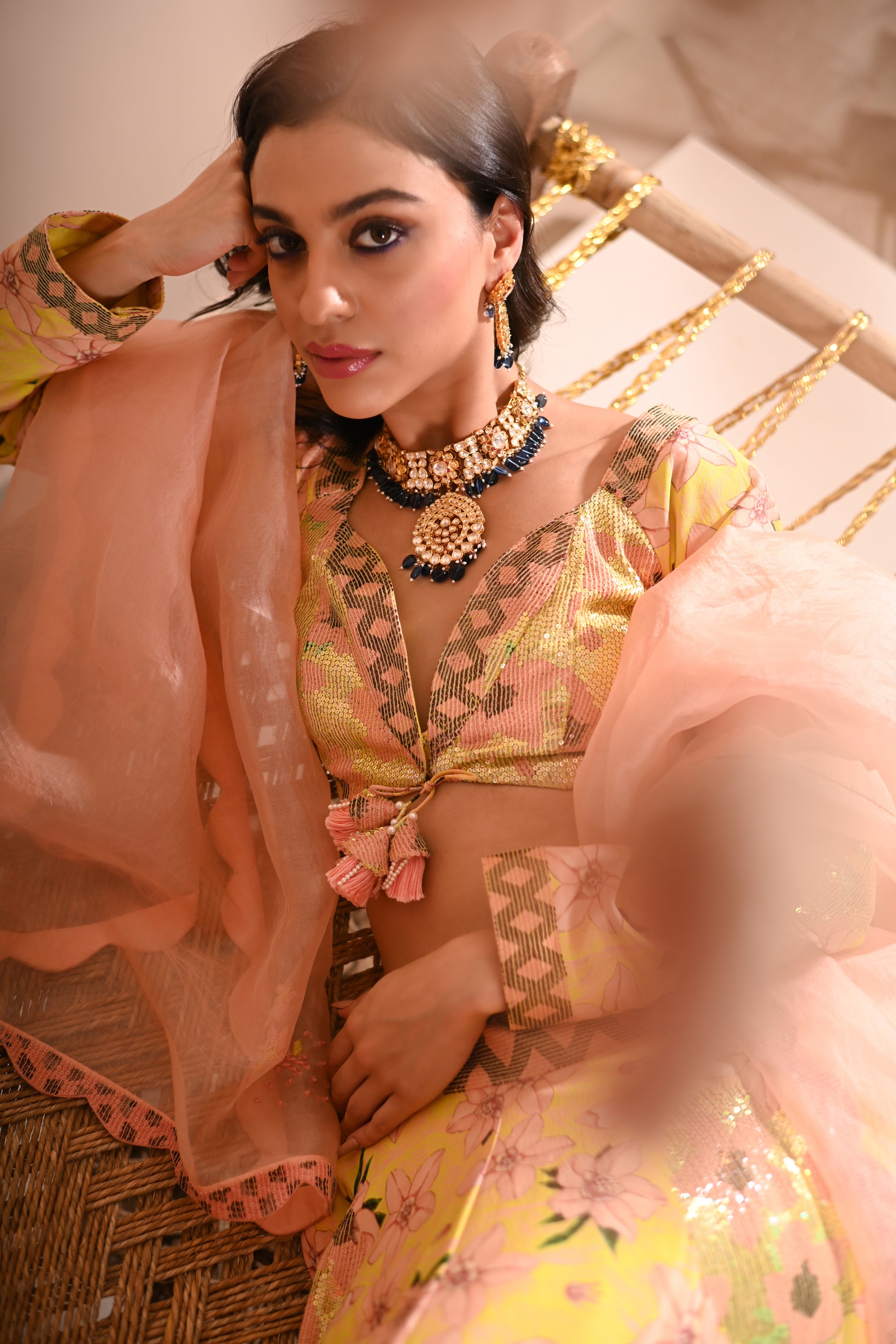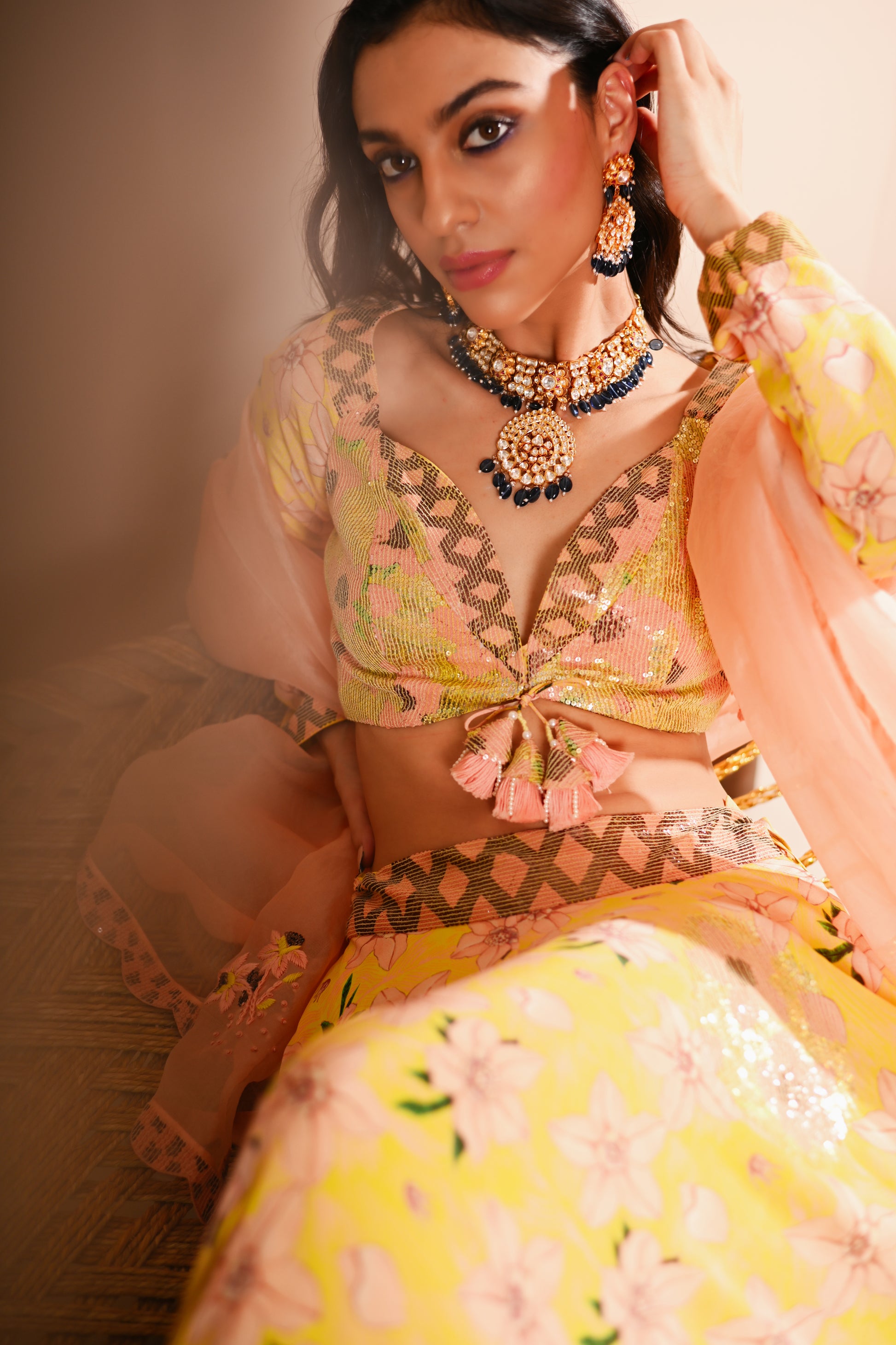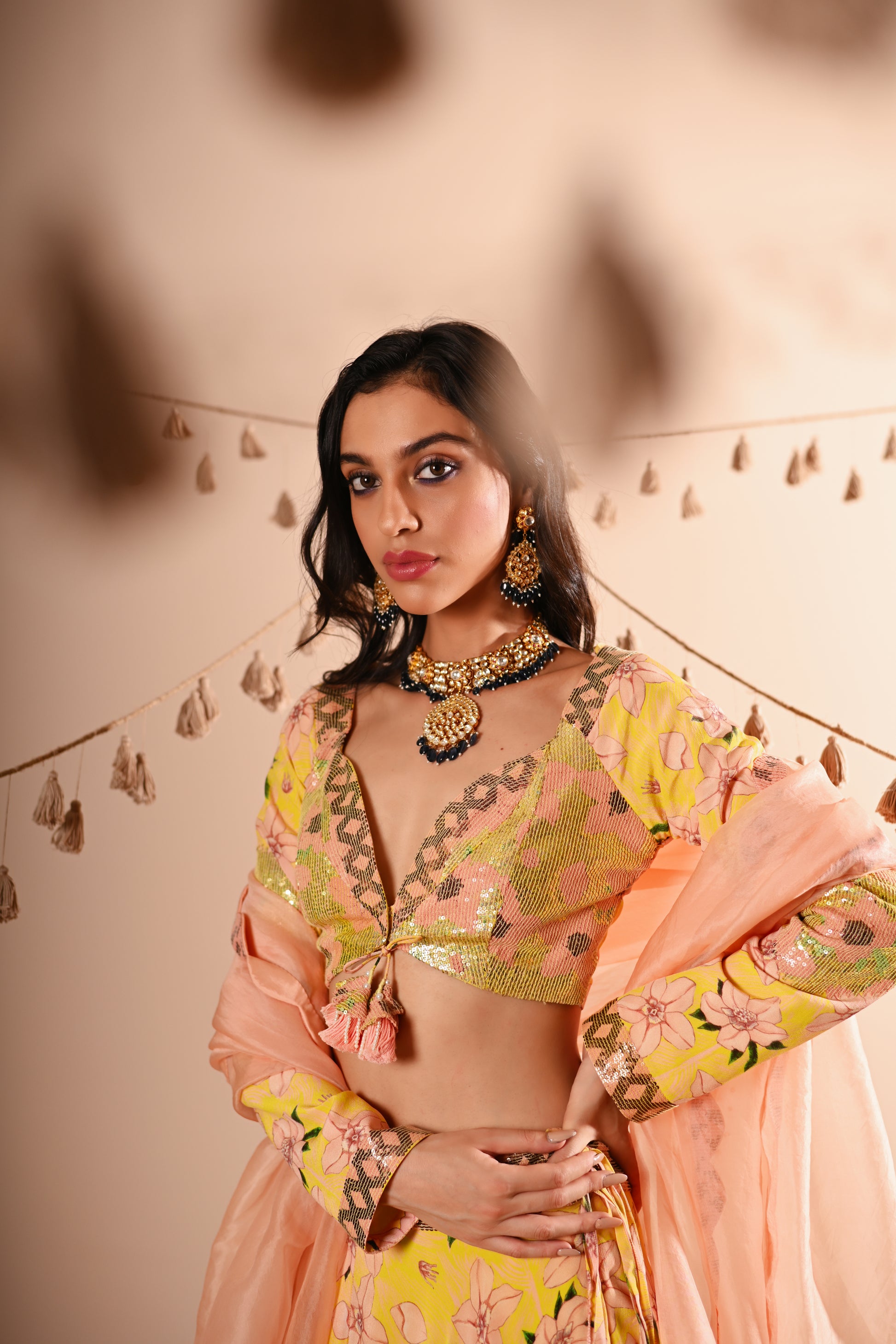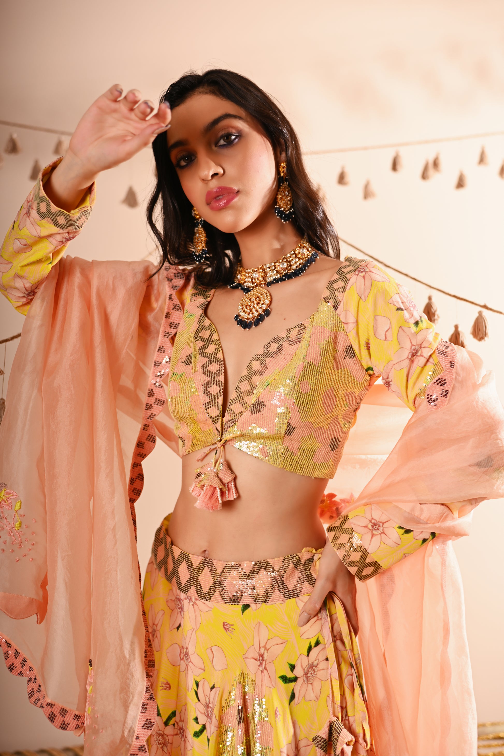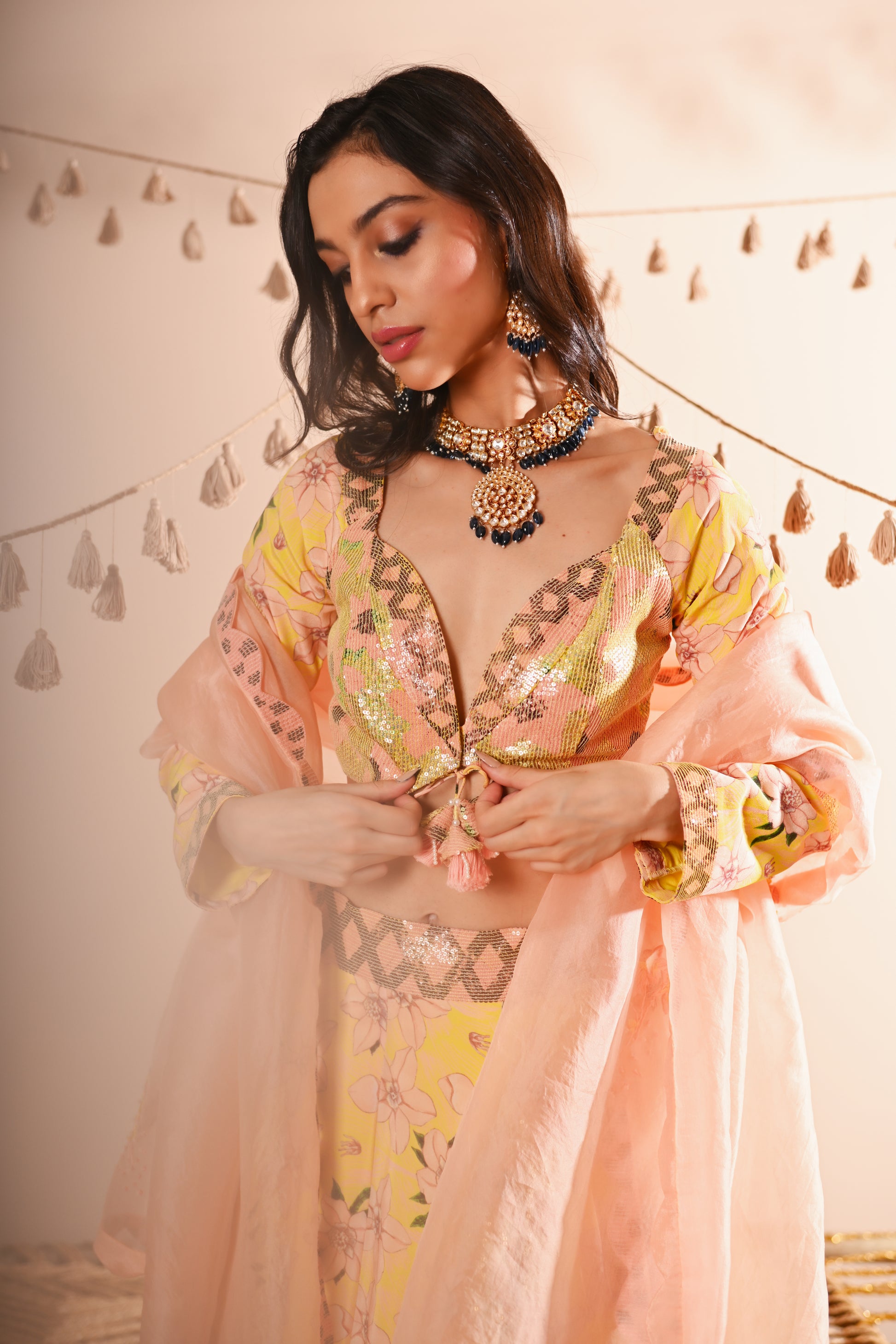 Our Rose Bud Lehenga Set, crafted with exquisite detailing, offers a vibrant and sophisticated look. This set features a digital print and hand-embroidered top with a sweetheart neckline, full sleeves, and a front hook and tassel tie opening. The lehenga is designed with a belt, tassel tie, side zipper, and hook opening, featuring a 4 kali circle and an 8-meter flare, along with two layers of attached lining. The ensemble is completed with a full-size organza dupatta, adding an elegant touch to the lemon-yellow base colour with multicoloured accents.