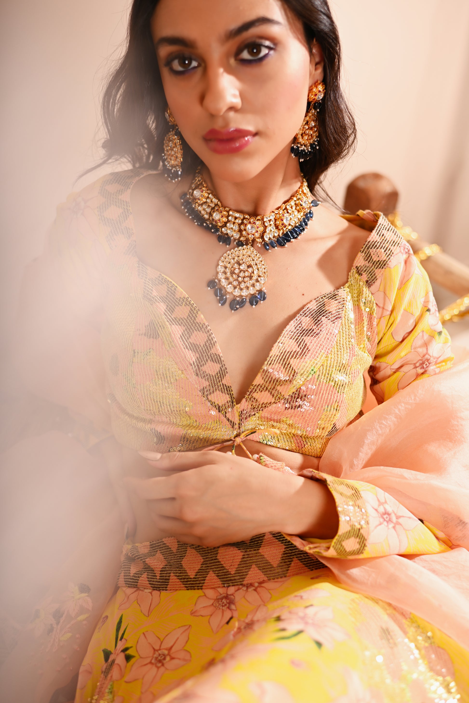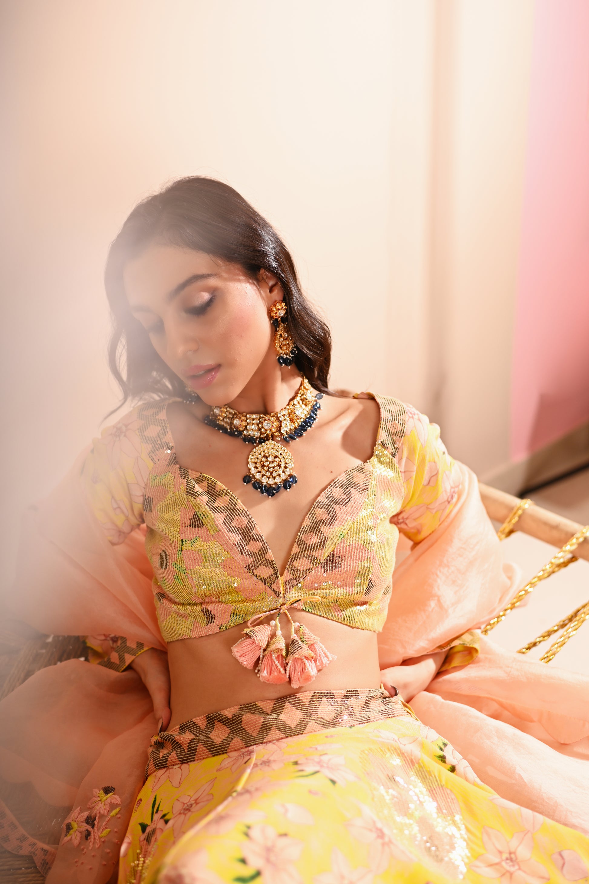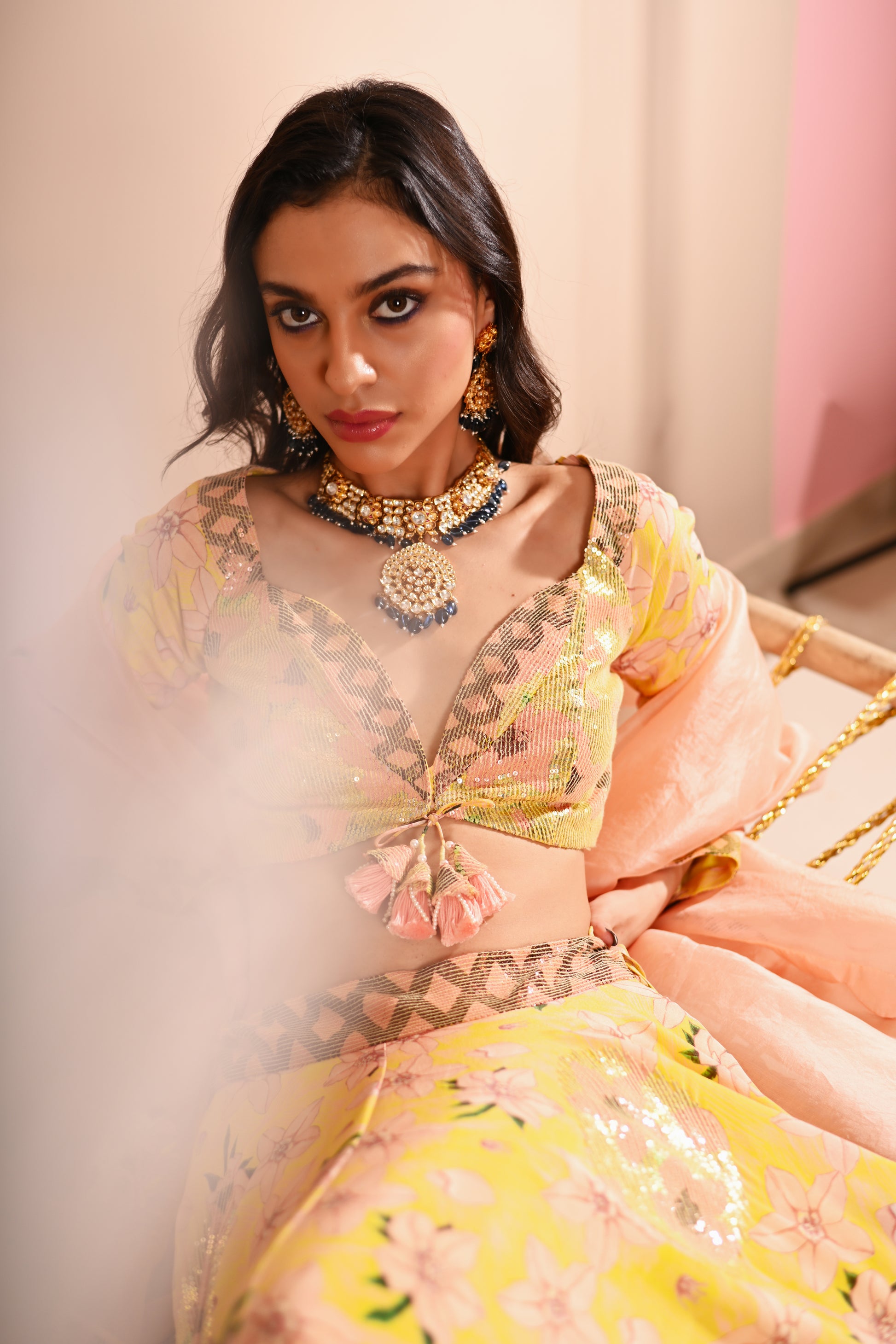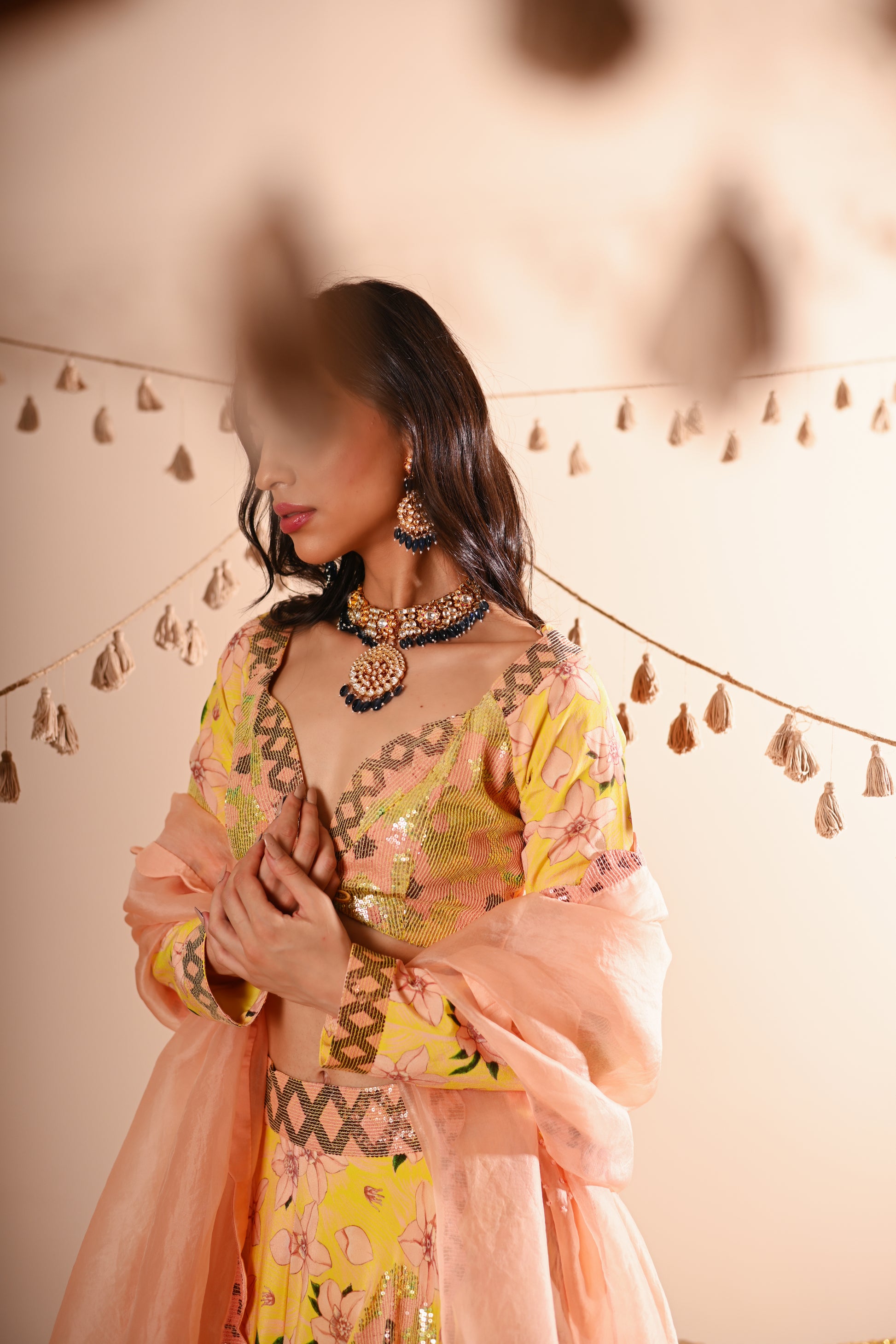 Our Rose Bud Lehenga Set, crafted with exquisite detailing, offers a vibrant and sophisticated look. This set features a digital print and hand-embroidered top with a sweetheart neckline, full sleeves, and a front hook and tassel tie opening. The lehenga is designed with a belt, tassel tie, side zipper, and hook opening, featuring a 4 kali circle and an 8-meter flare, along with two layers of attached lining. The ensemble is completed with a full-size organza dupatta, adding an elegant touch to the lemon-yellow base colour with multicoloured accents.