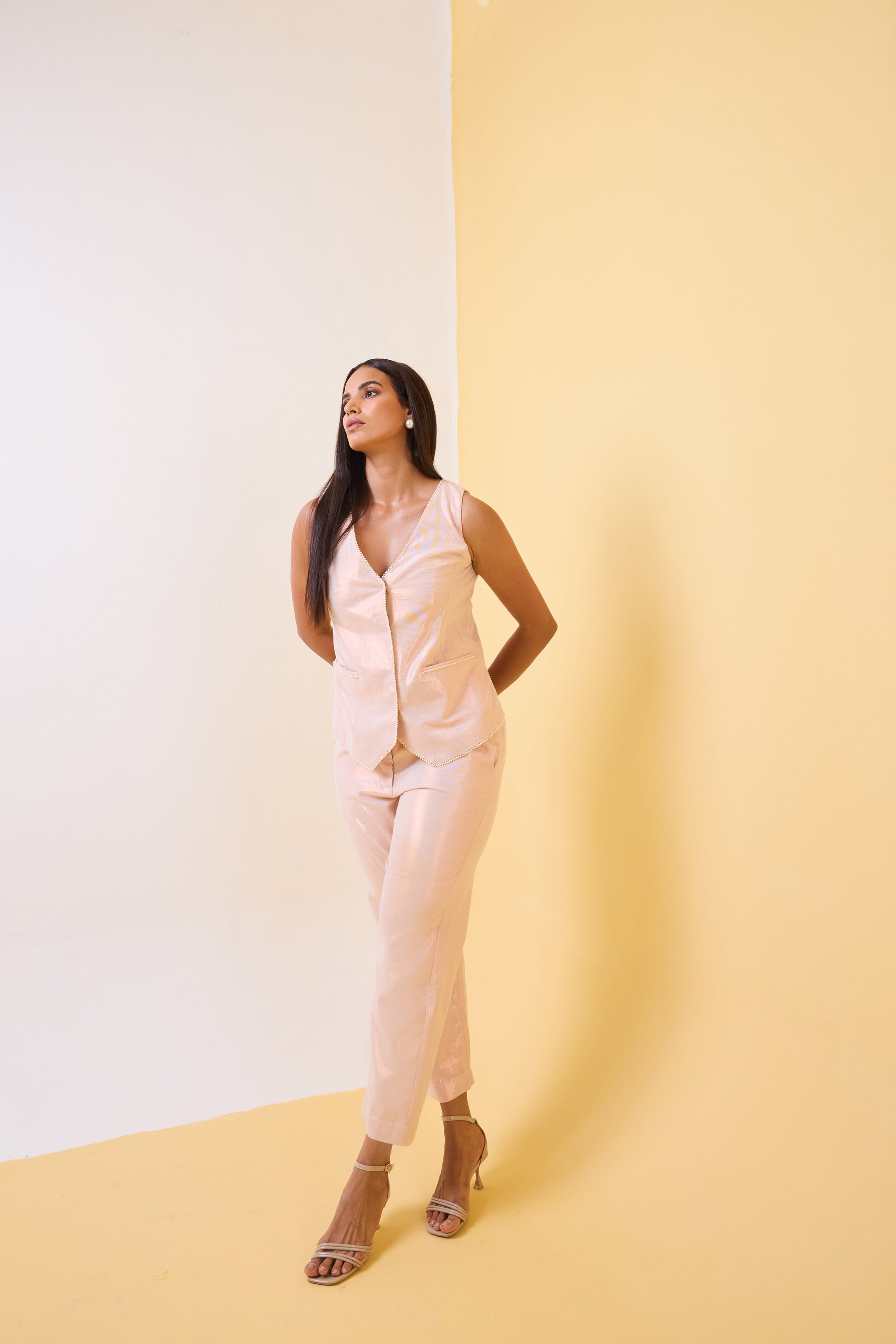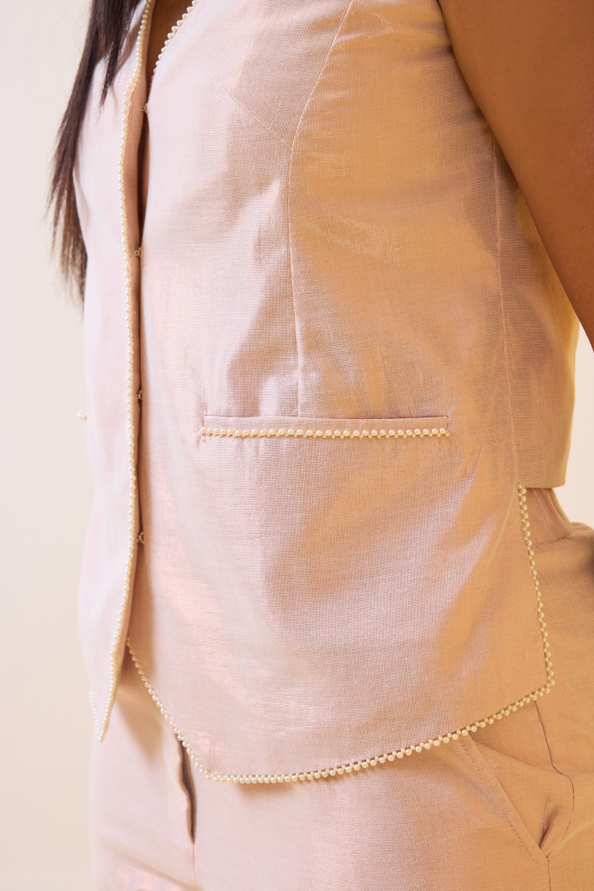 The Rose Gold Sparkle Waistcoat Set features a waistcoat with a V-neckline, functional welt pockets on the front, and an asymmetric back. The waistcoat is adorned with pearl beading details along the front neckline and shoulder joints, adding a touch of elegance. Paired with tapered pants that feature a front zipper, hook fastening, and a half-elasticated waistband for a comfortable fit, this co-ord set is both stylish and versatile.