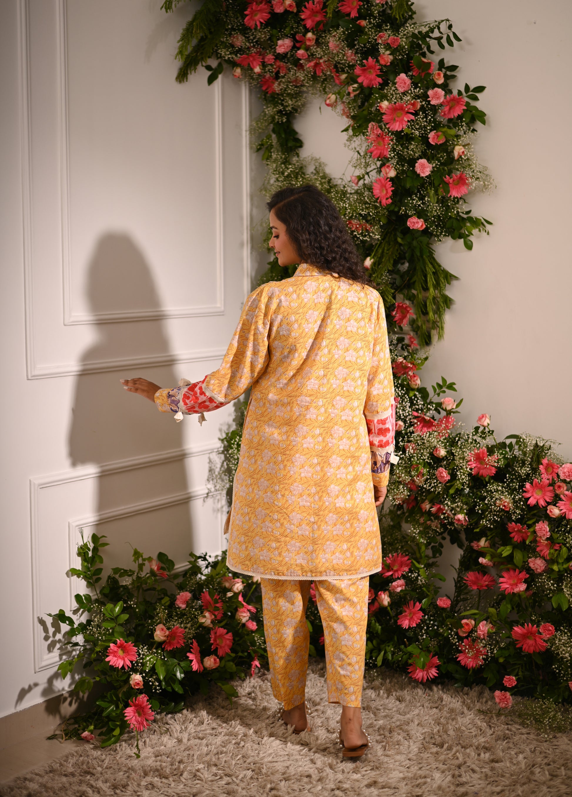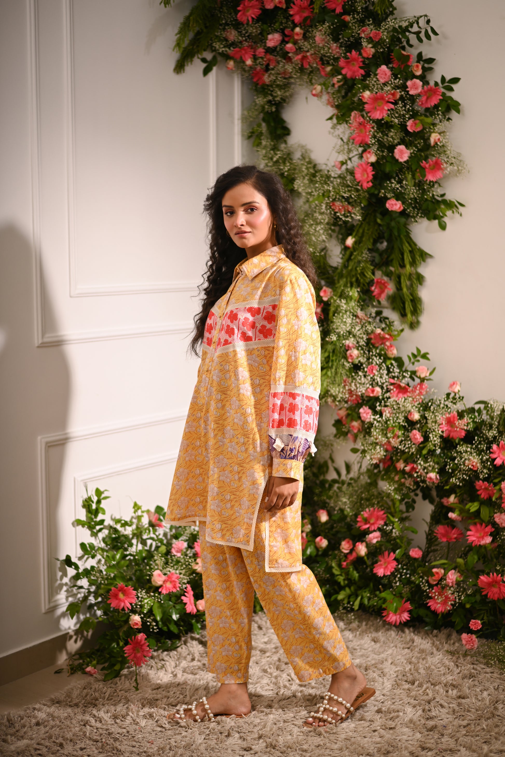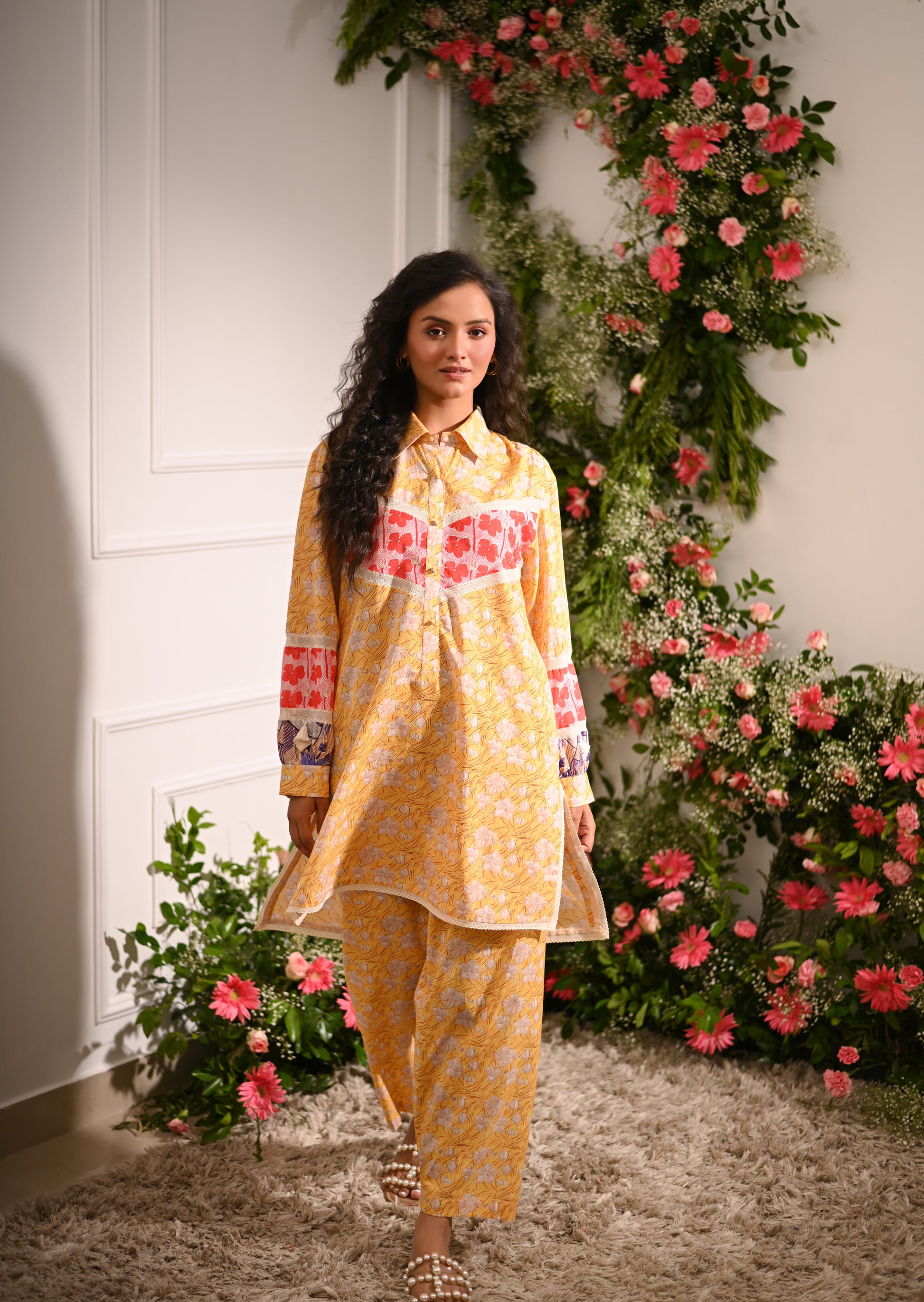 Rosette Co-ord Set: Our yellow and multicolour patchwork high-low collared kurta is designed to make a statement. Featuring a unique blend of printed patterns, this kurta is paired with tapered trousers for a chic, coordinated look.