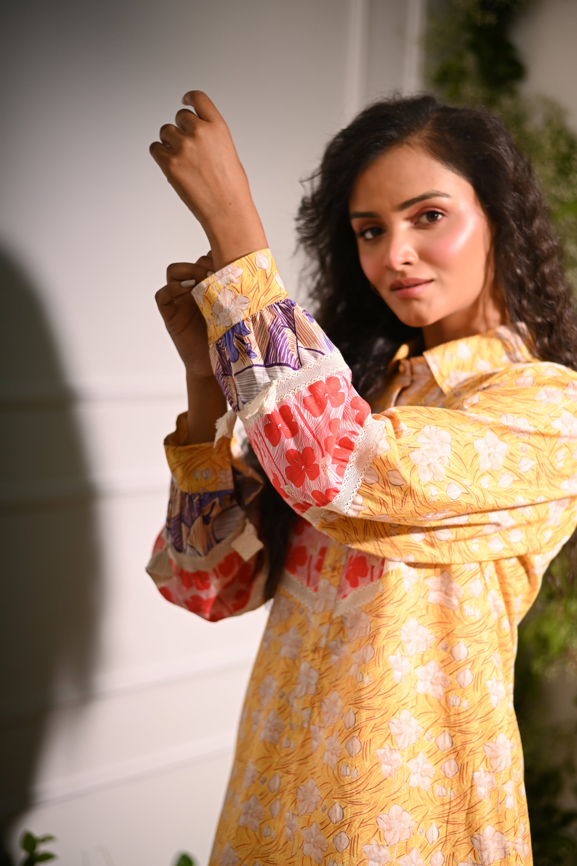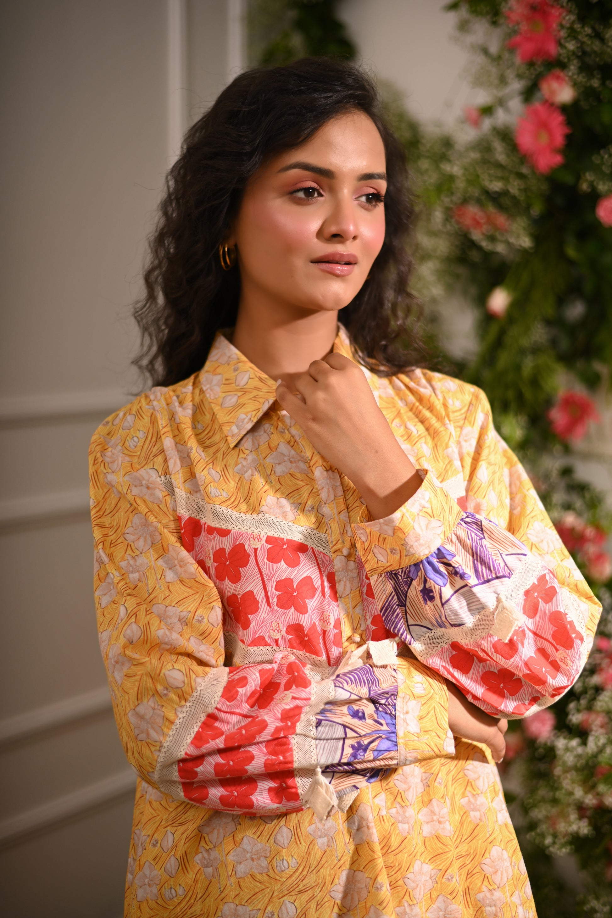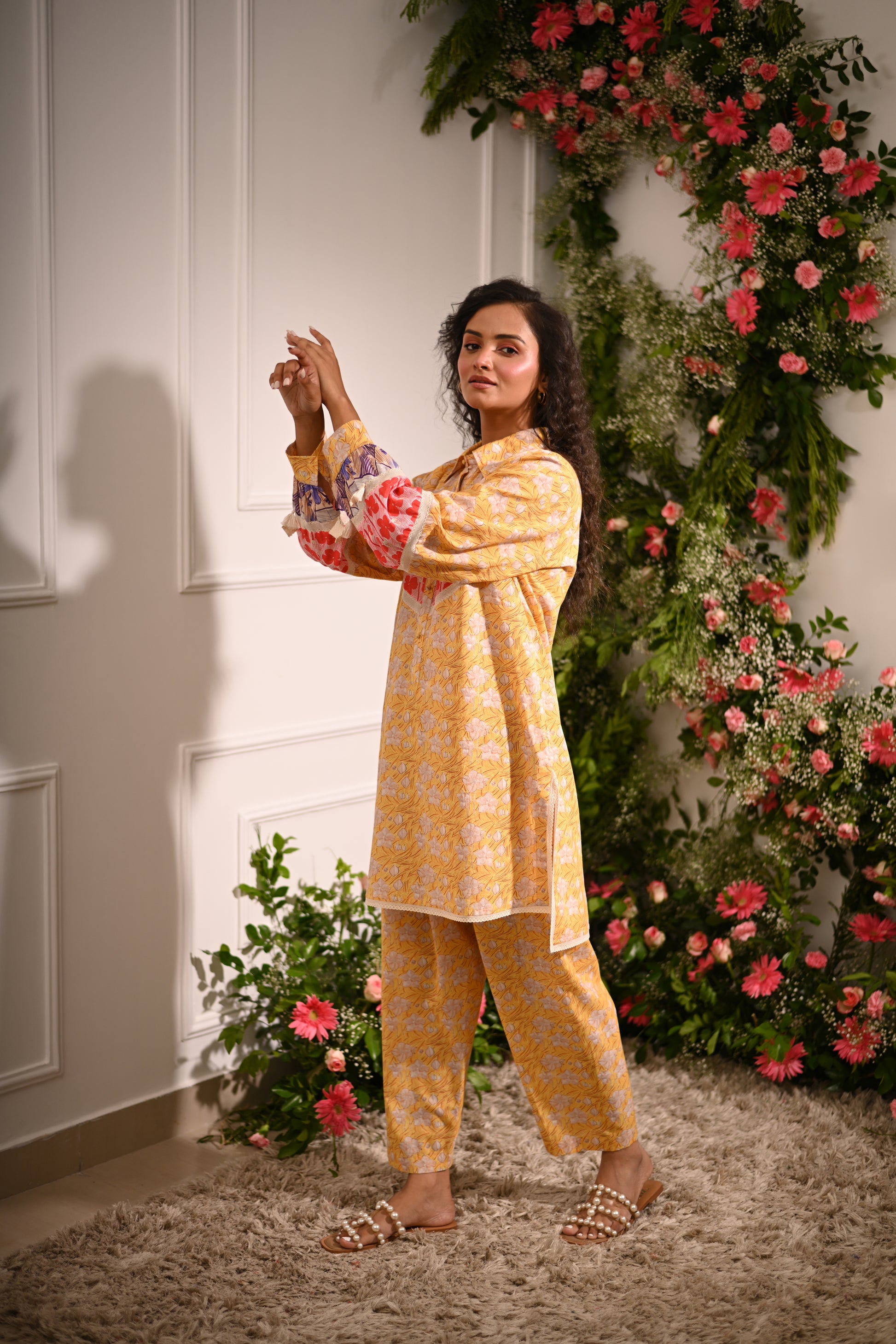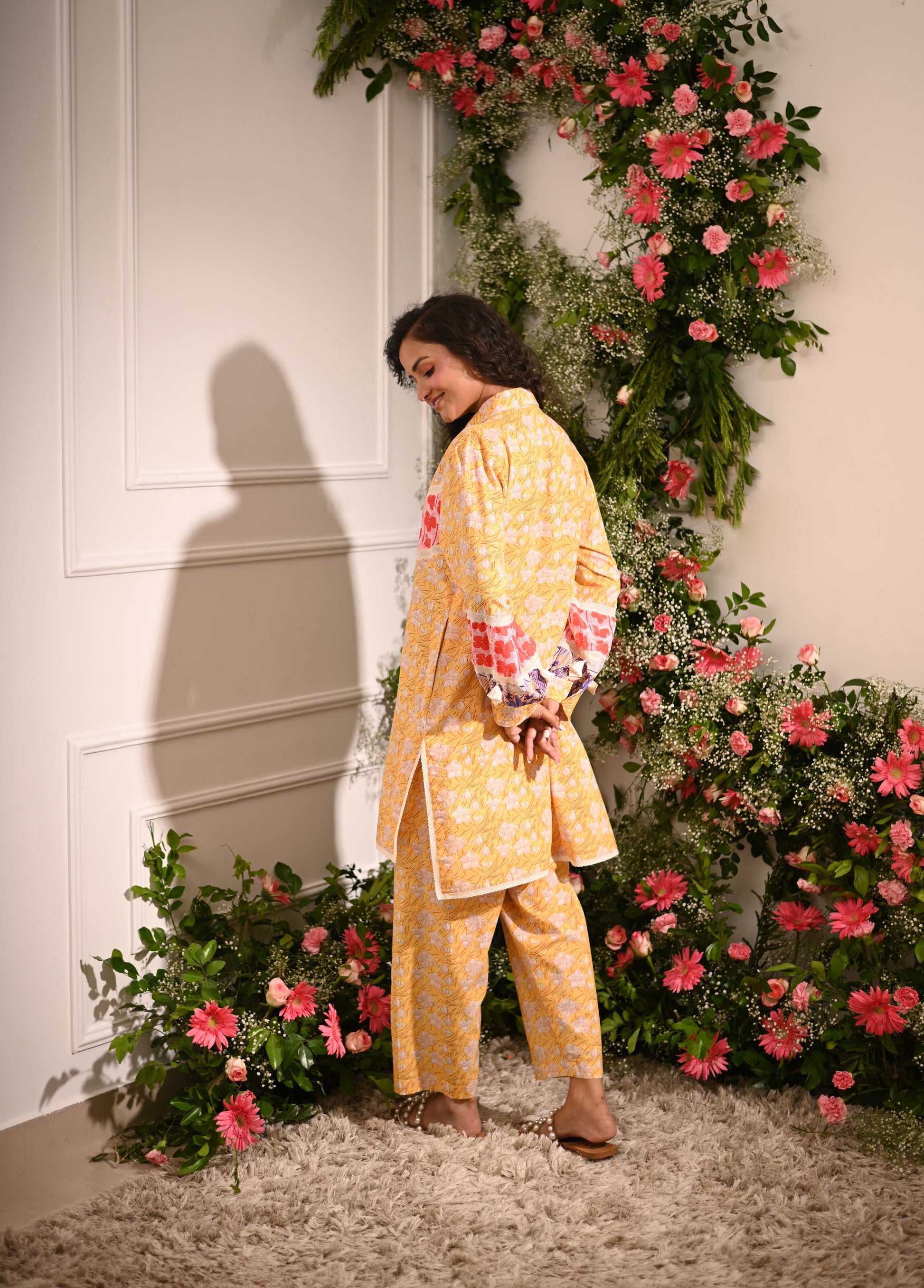 Rosette Co-ord Set: Our yellow and multicolour patchwork high-low collared kurta is designed to make a statement. Featuring a unique blend of printed patterns, this kurta is paired with tapered trousers for a chic, coordinated look.