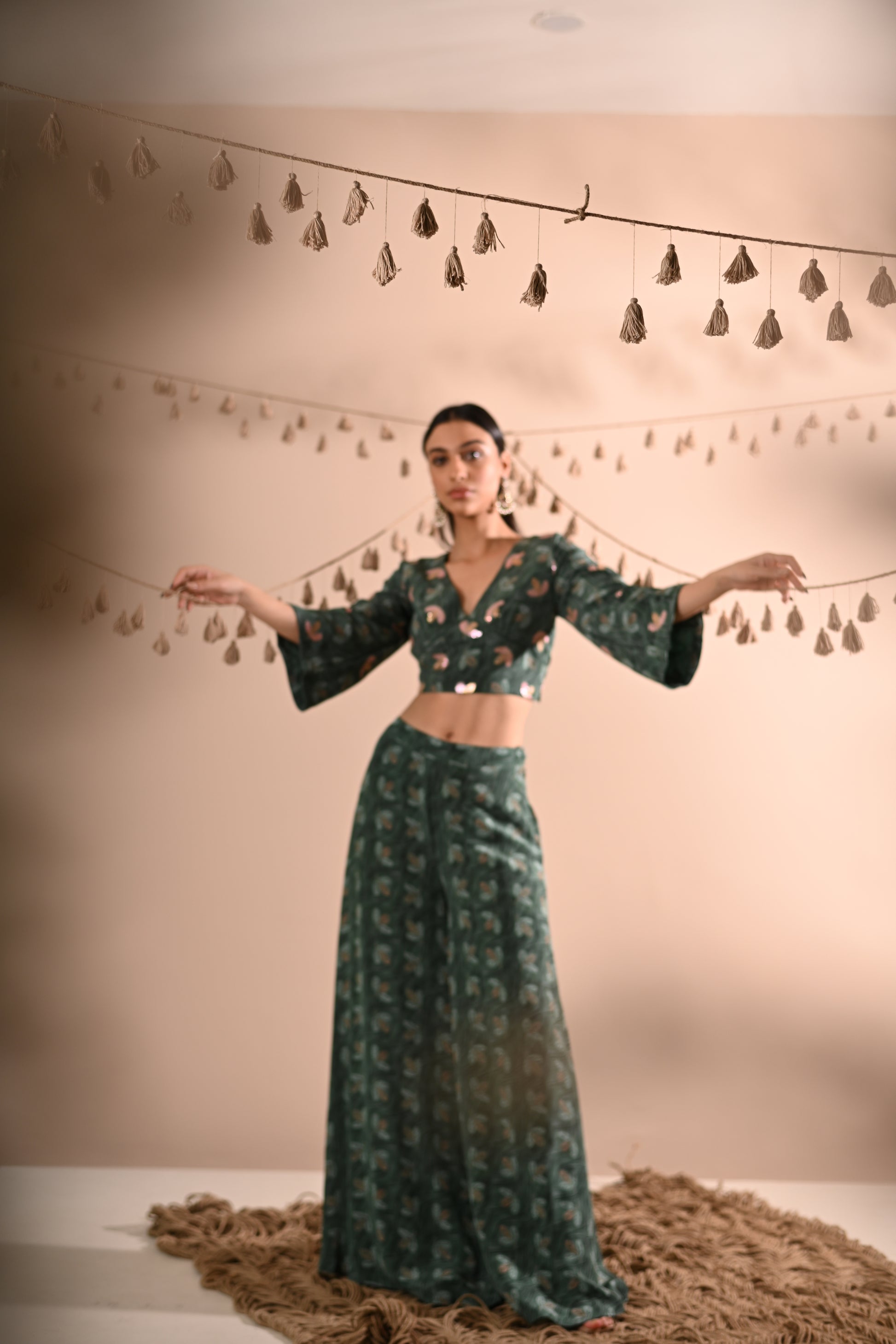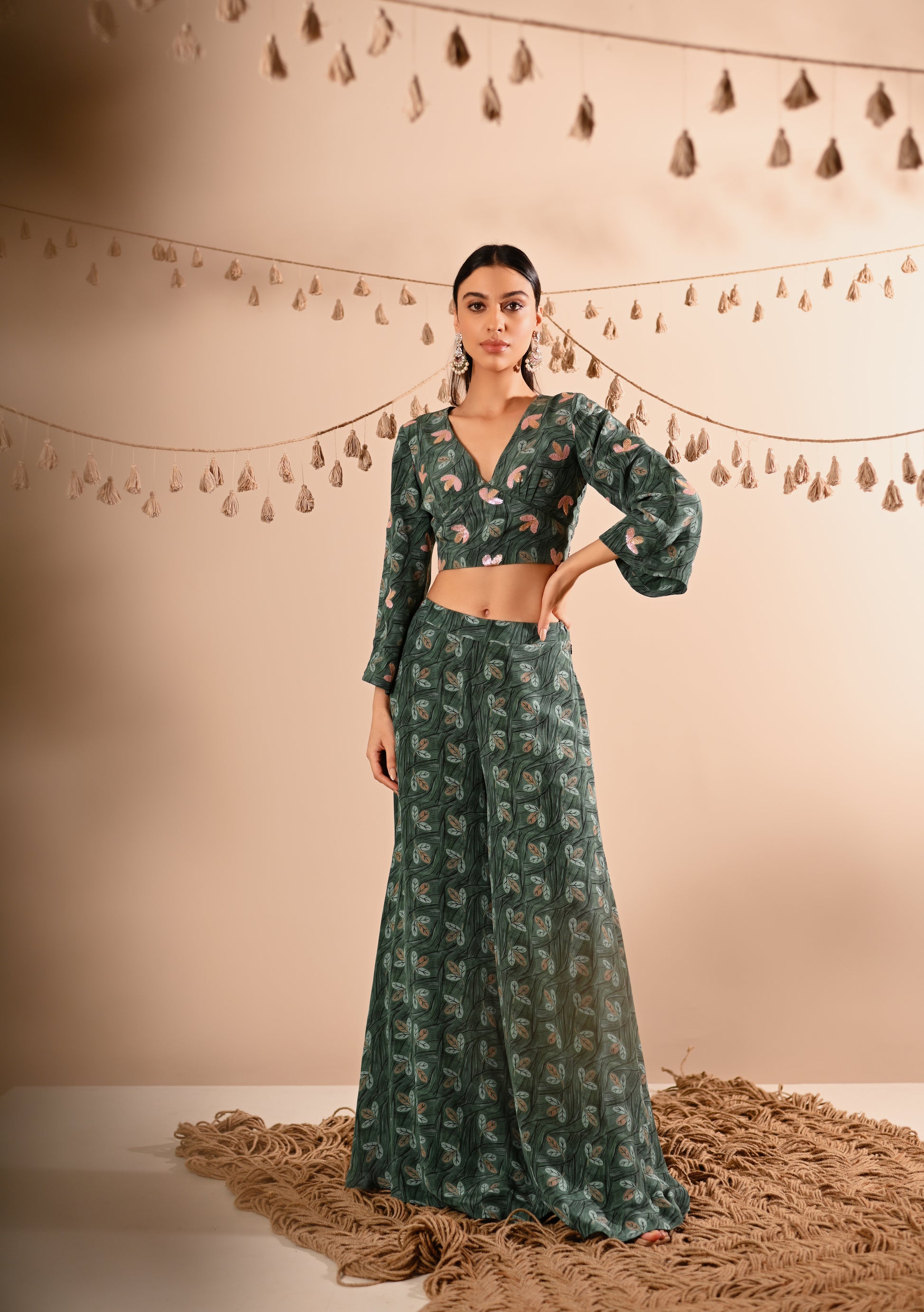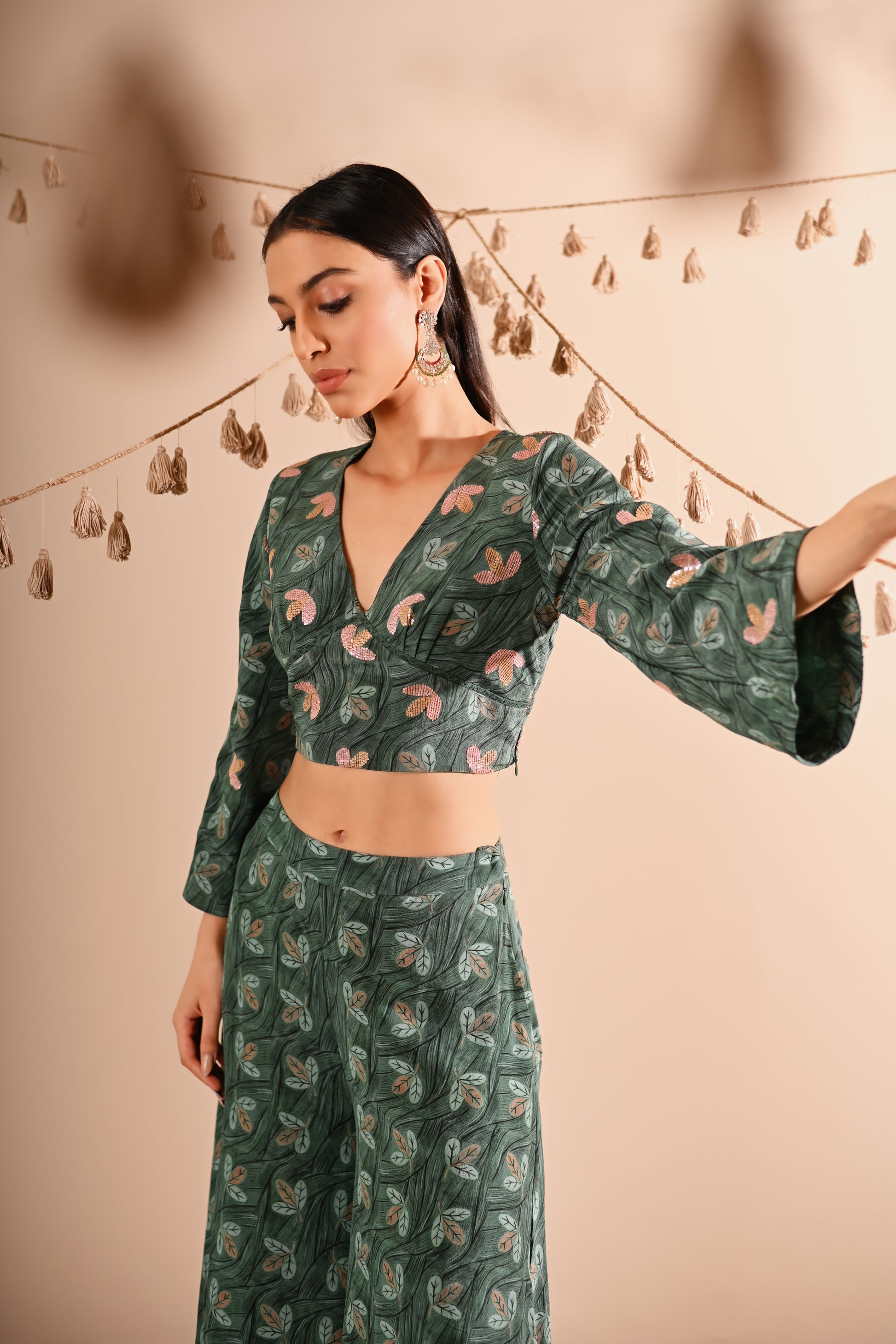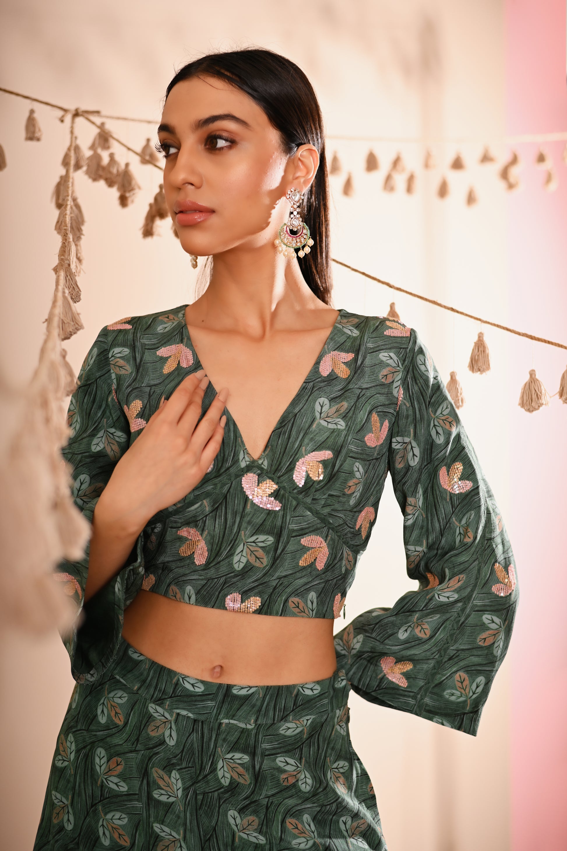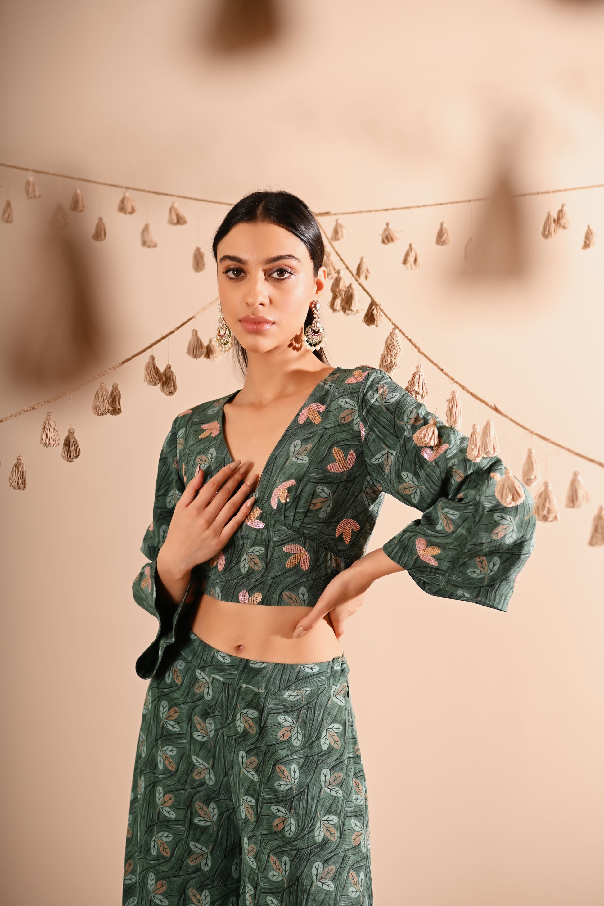 Our Wild Flower Co-ord Set, crafted with exquisite detailing, offers a stylish and elegant look. This set features a cropped V-neck top with bell sleeves, adorned with hand embroidery and lace details, and a side zipper for a perfect fit. It is paired with flared palazzo pants that feature a side zip and a half-back elastic waistband for added comfort. The rich forest green base colour with multi-coloured accents makes this ensemble both vibrant and eye-catching.