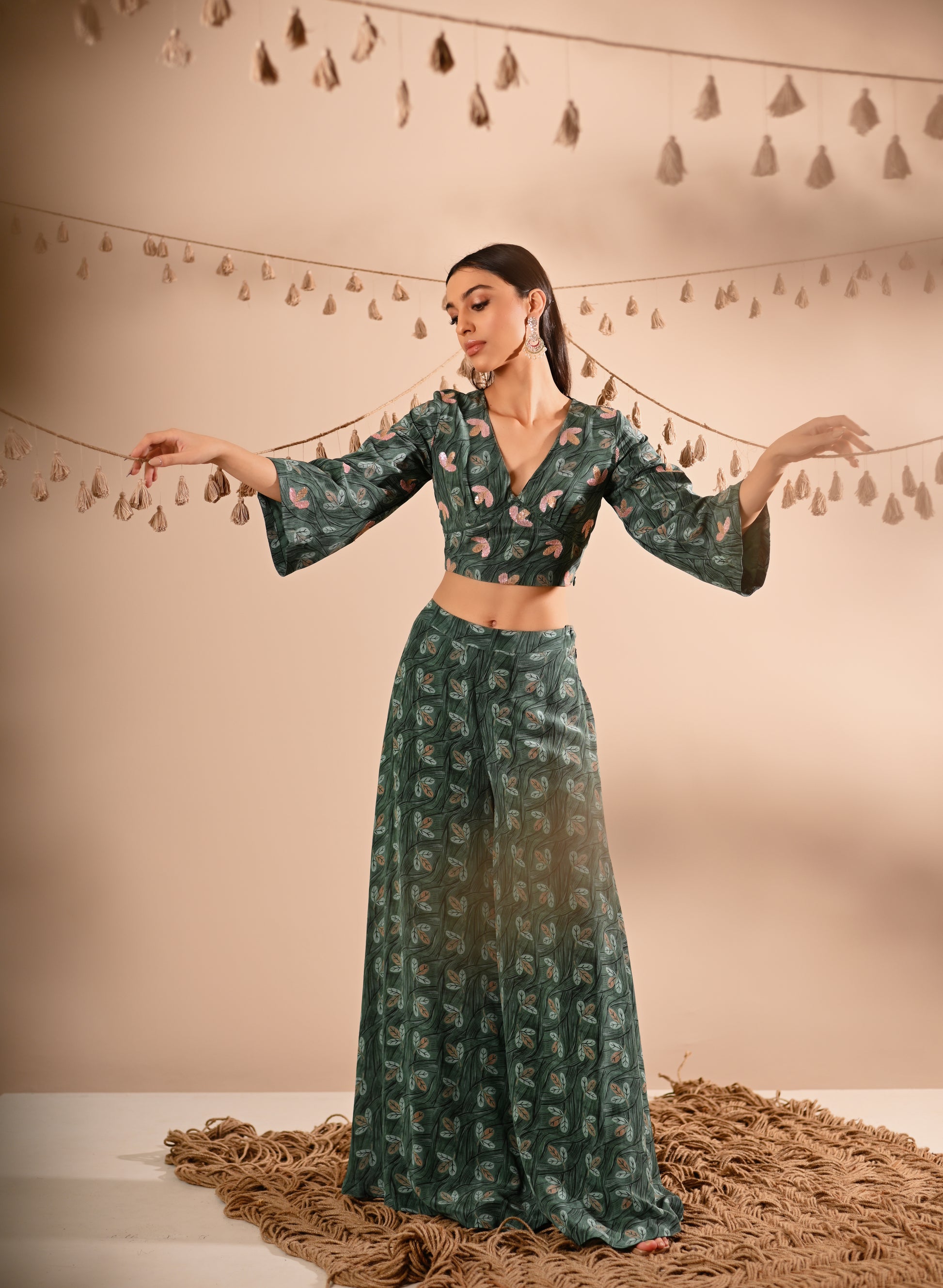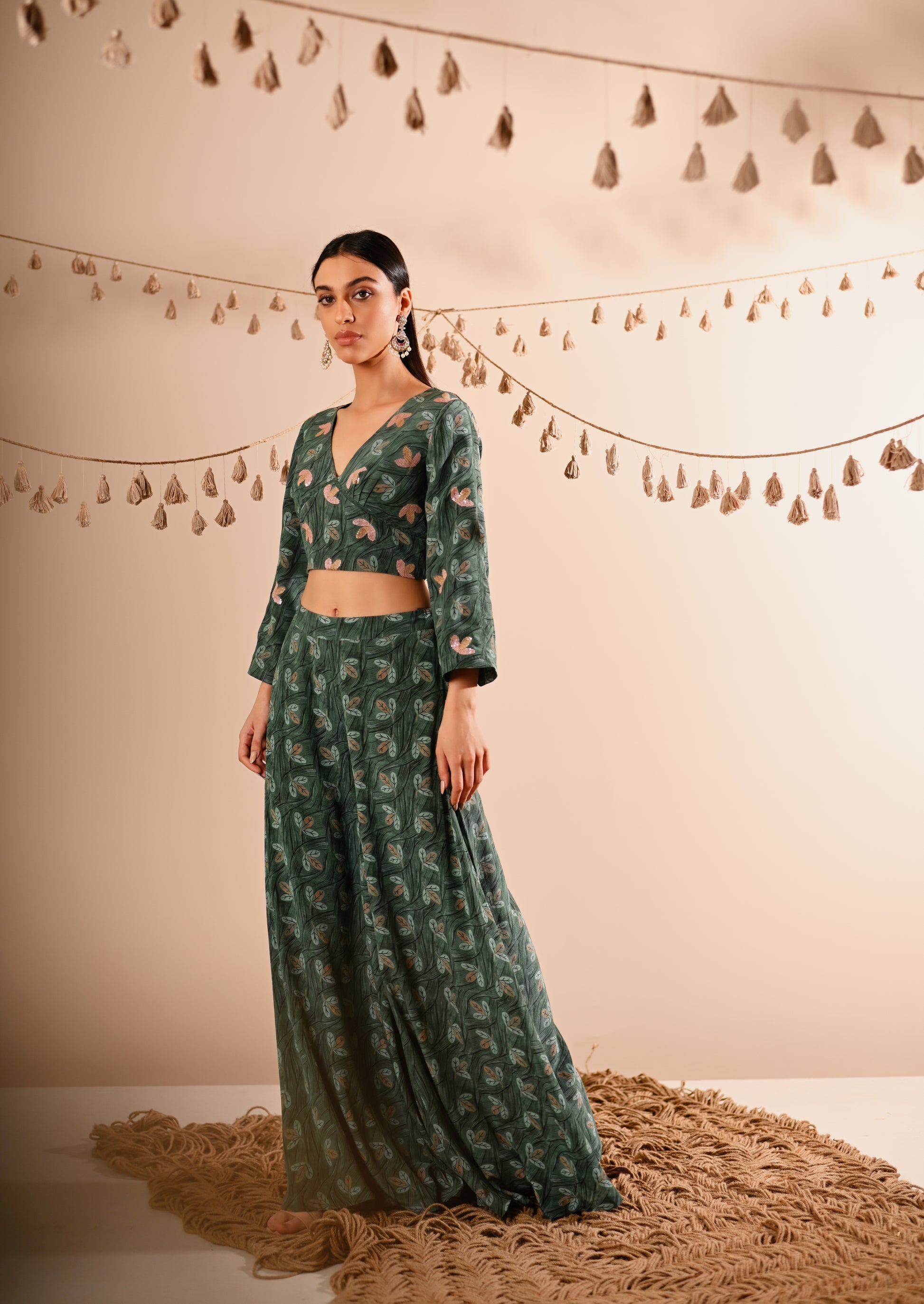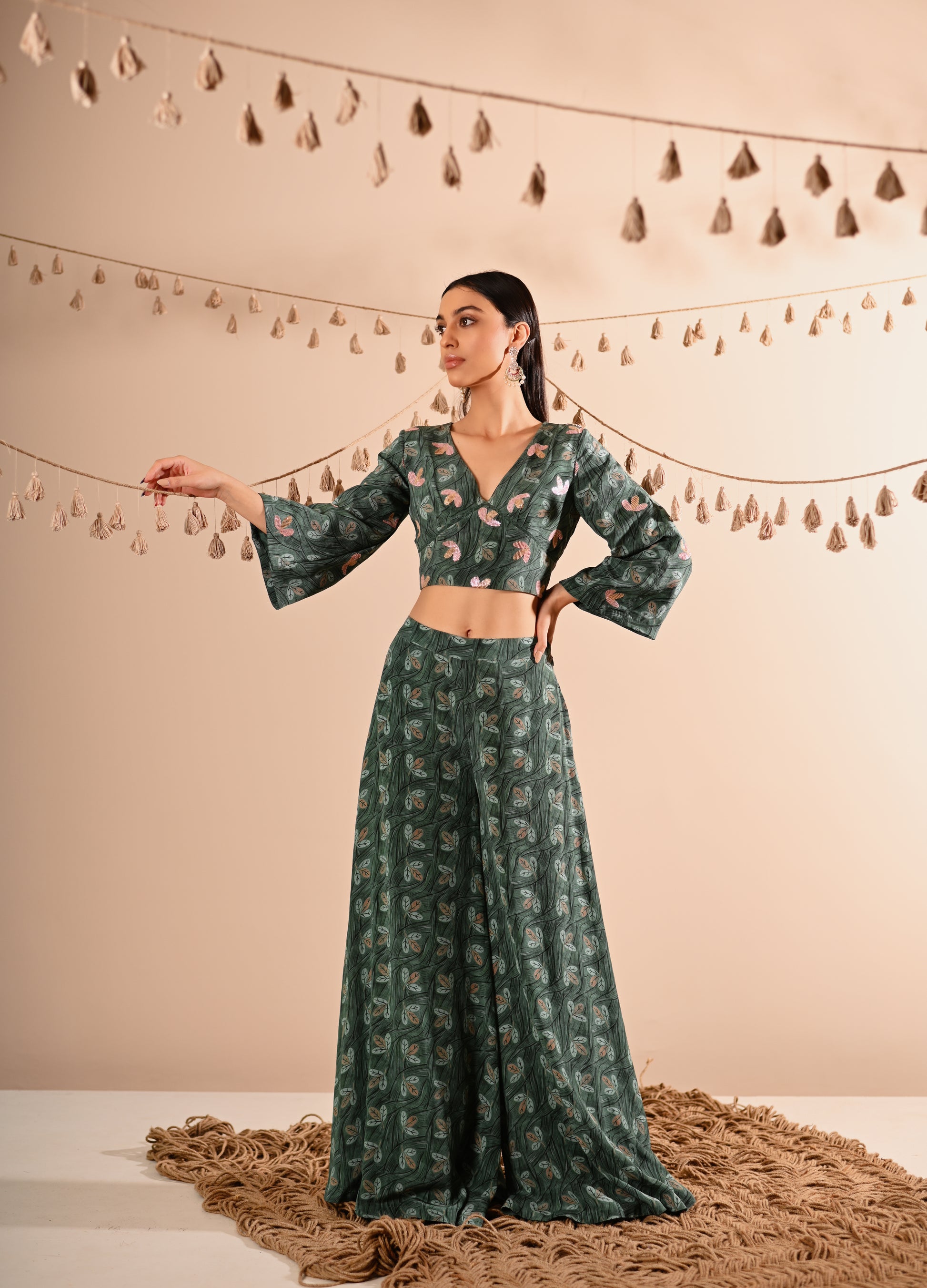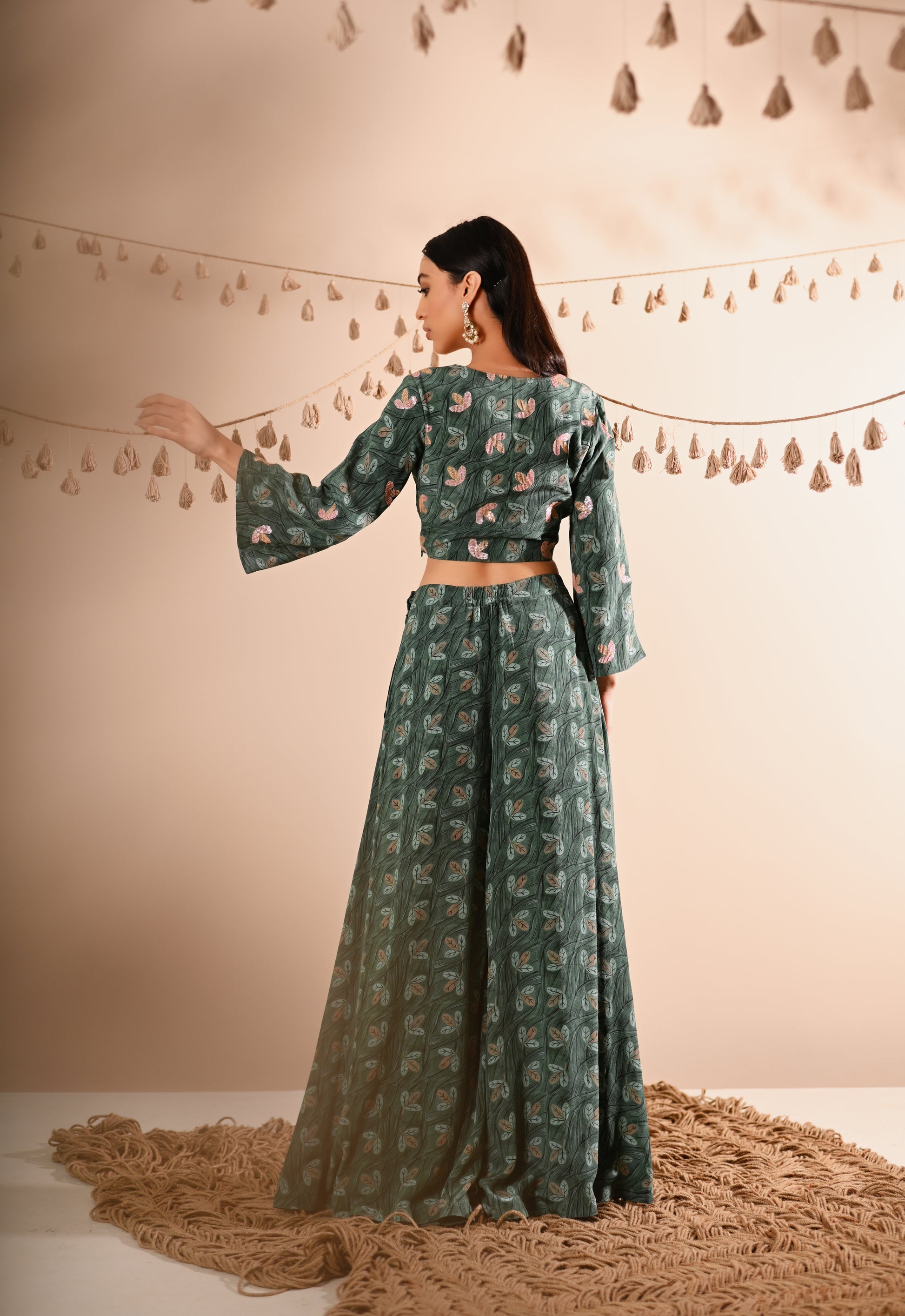Our Wild Flower Co-ord Set, crafted with exquisite detailing, offers a stylish and elegant look. This set features a cropped V-neck top with bell sleeves, adorned with hand embroidery and lace details, and a side zipper for a perfect fit. It is paired with flared palazzo pants that feature a side zip and a half-back elastic waistband for added comfort. The rich forest green base colour with multi-coloured accents makes this ensemble both vibrant and eye-catching.