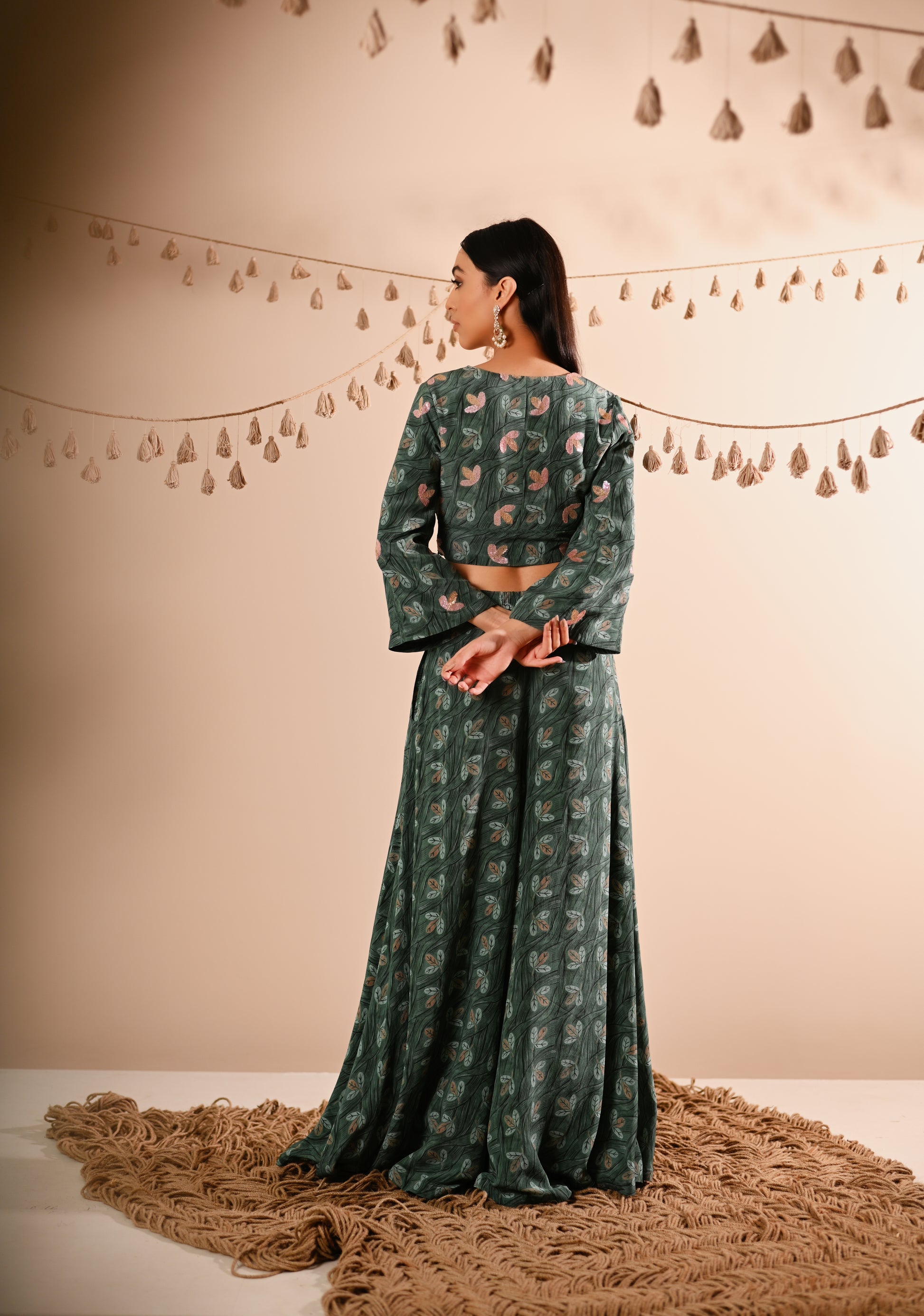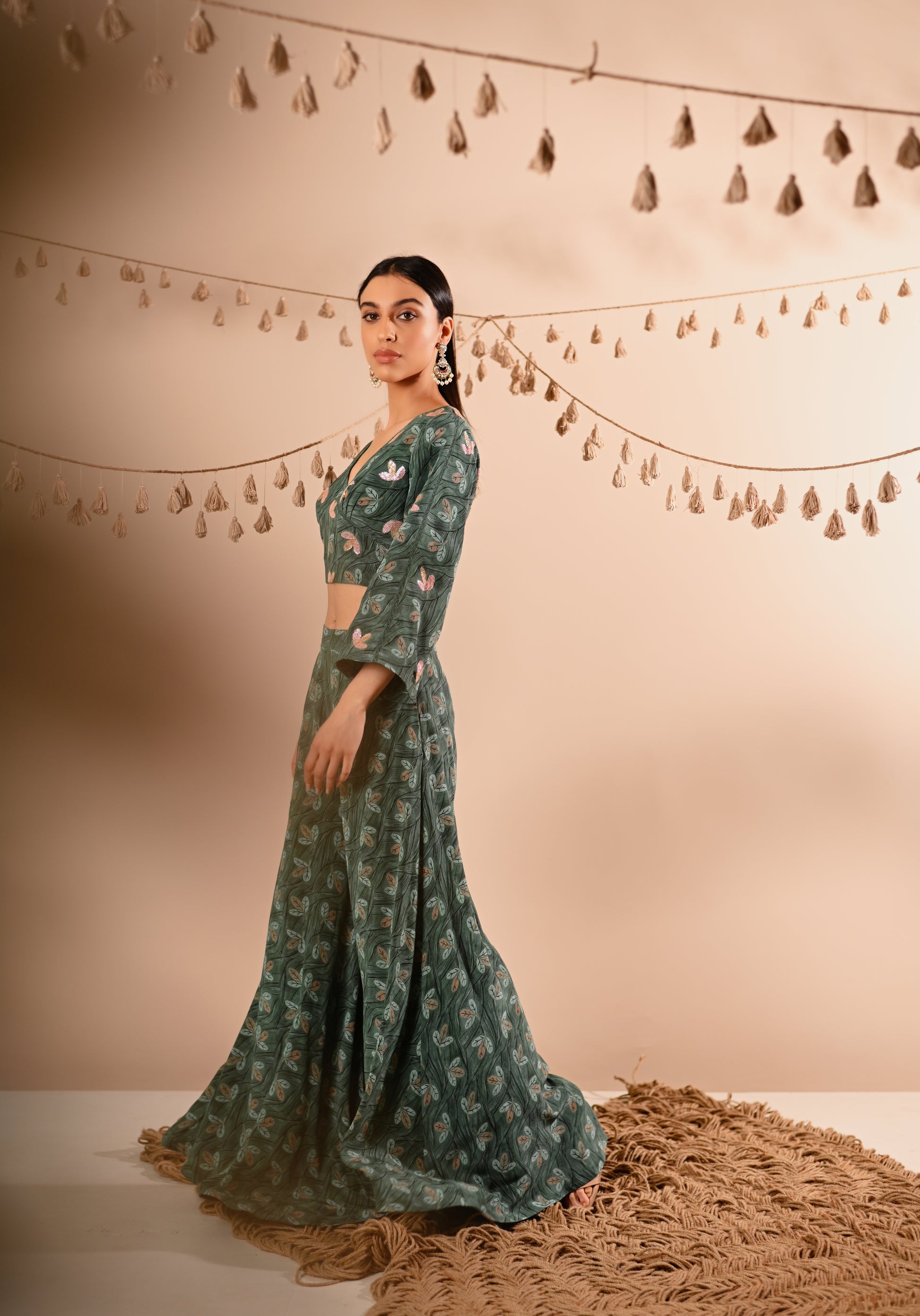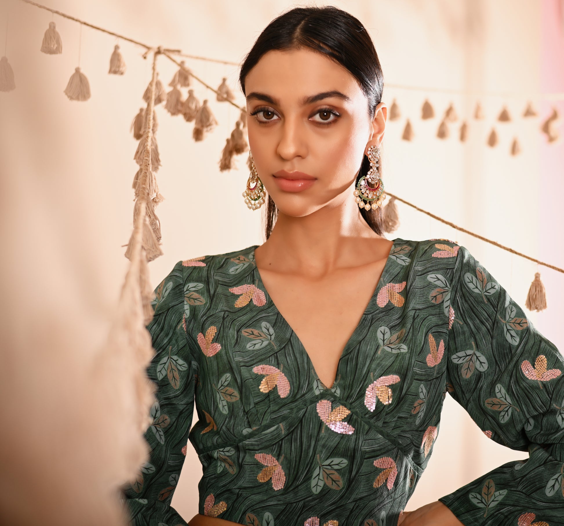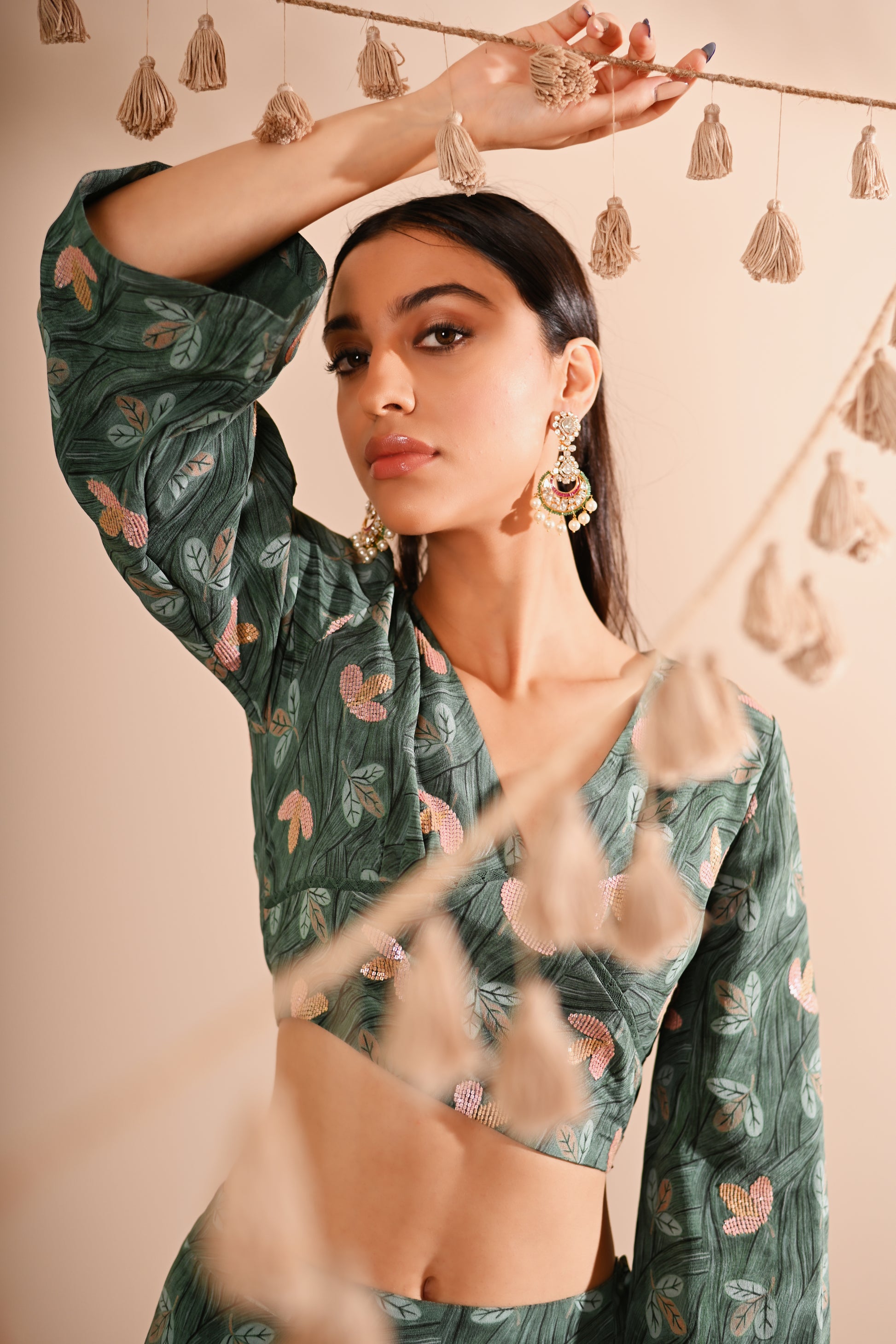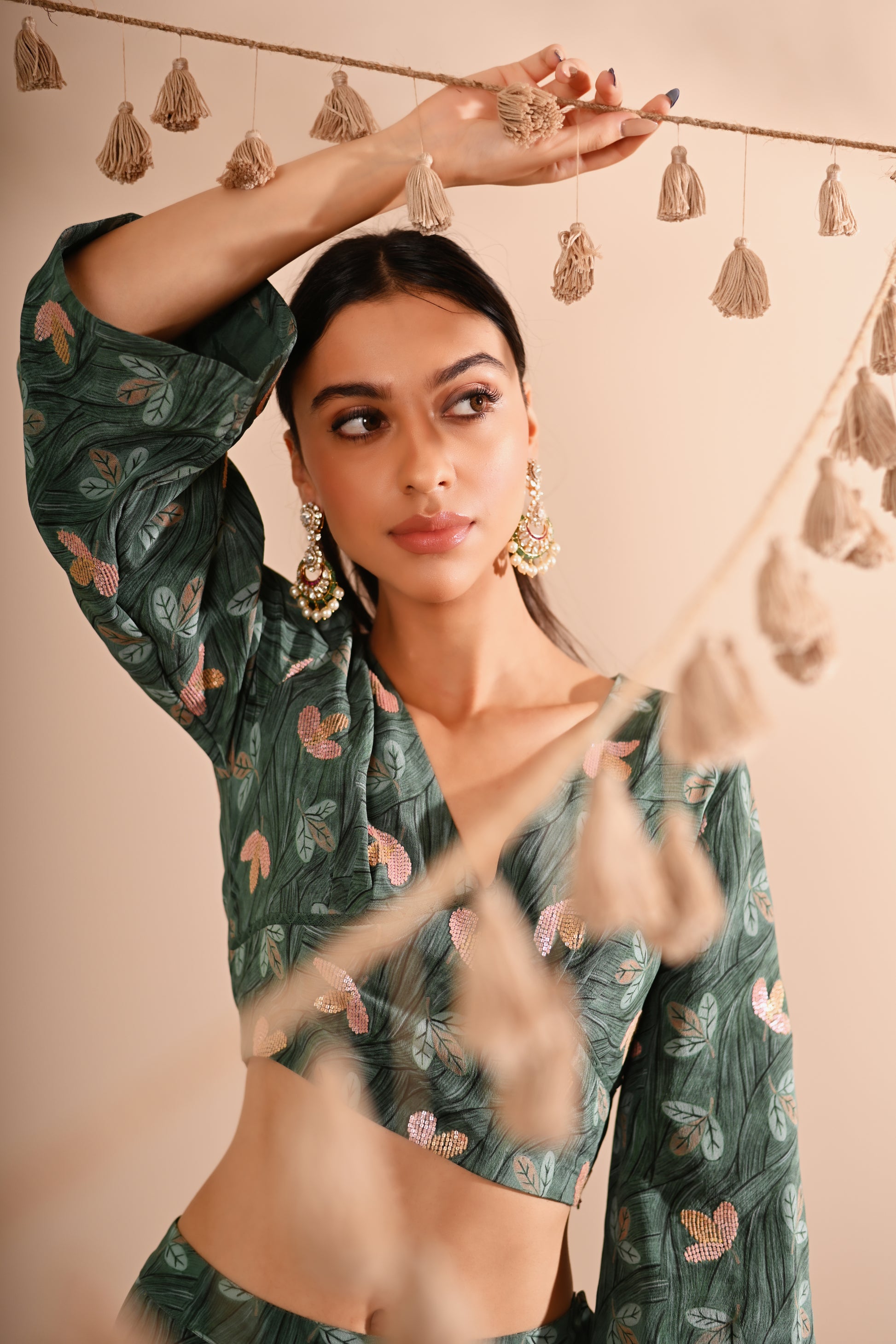 Our Wild Flower Co-ord Set, crafted with exquisite detailing, offers a stylish and elegant look. This set features a cropped V-neck top with bell sleeves, adorned with hand embroidery and lace details, and a side zipper for a perfect fit. It is paired with flared palazzo pants that feature a side zip and a half-back elastic waistband for added comfort. The rich forest green base colour with multi-coloured accents makes this ensemble both vibrant and eye-catching.