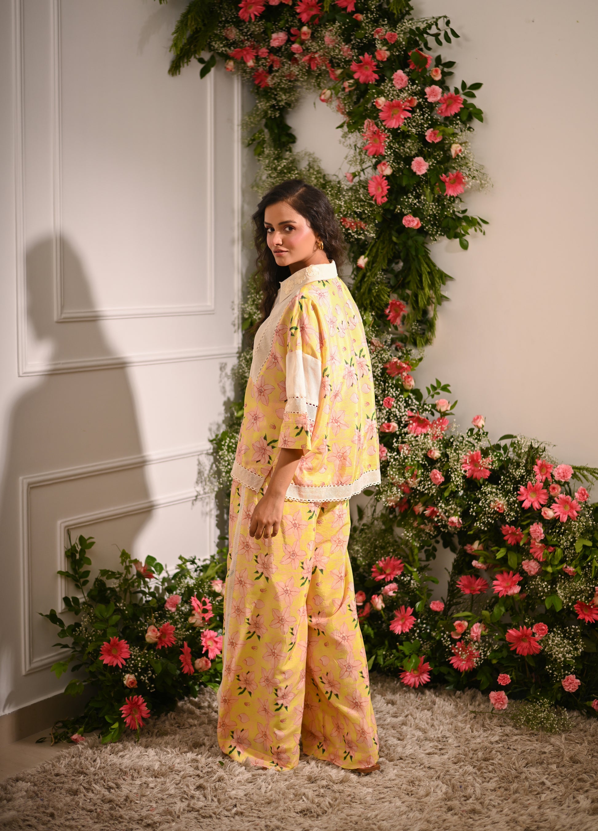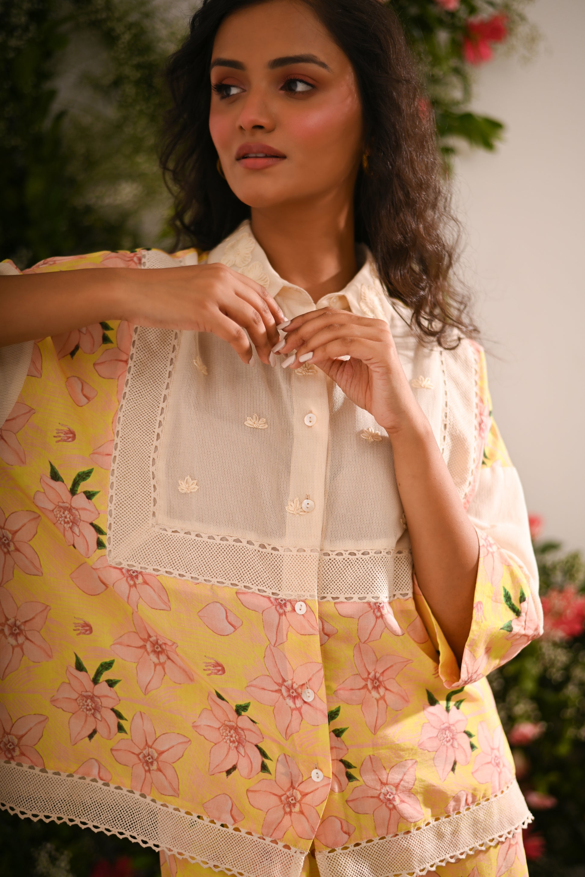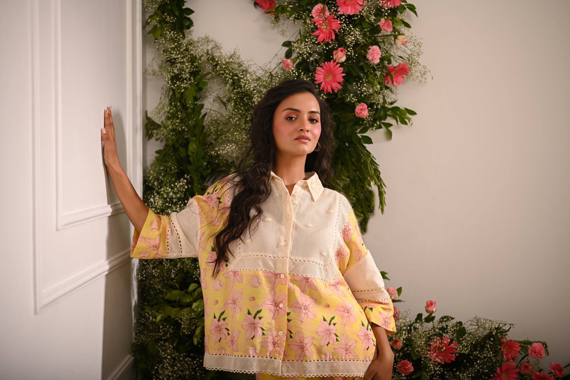Our Winter Bloom Co-ord Set, crafted with exquisite detailing, offers a stylish and cosy look. This set features a printed patchwork embroidered button-up cropped shirt paired with pyjama-style trousers, complete with a fully elastic waistband. The full sleeves and elegant butter yellow and off-white colour combination add a touch of sophistication.