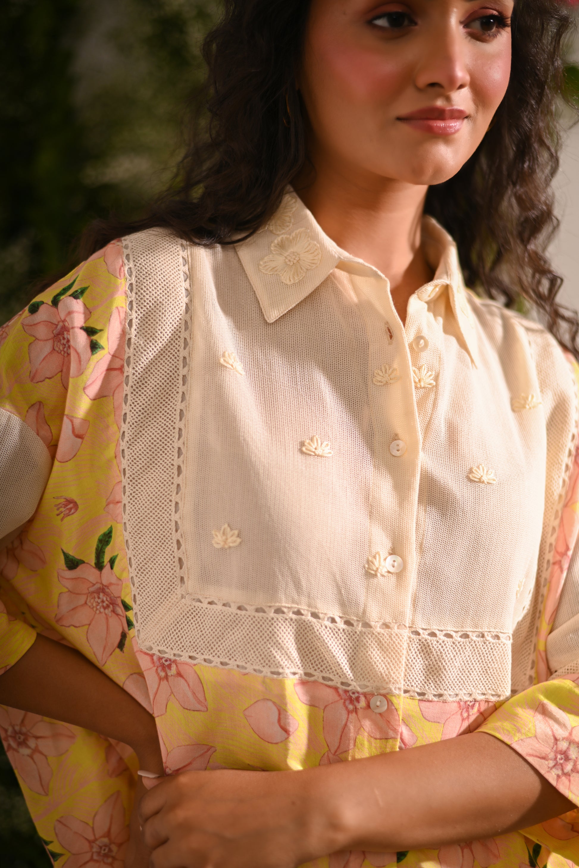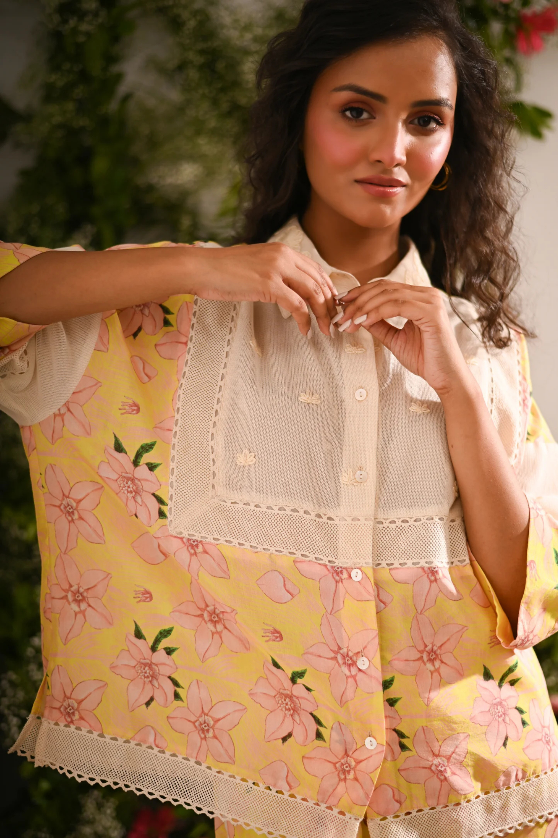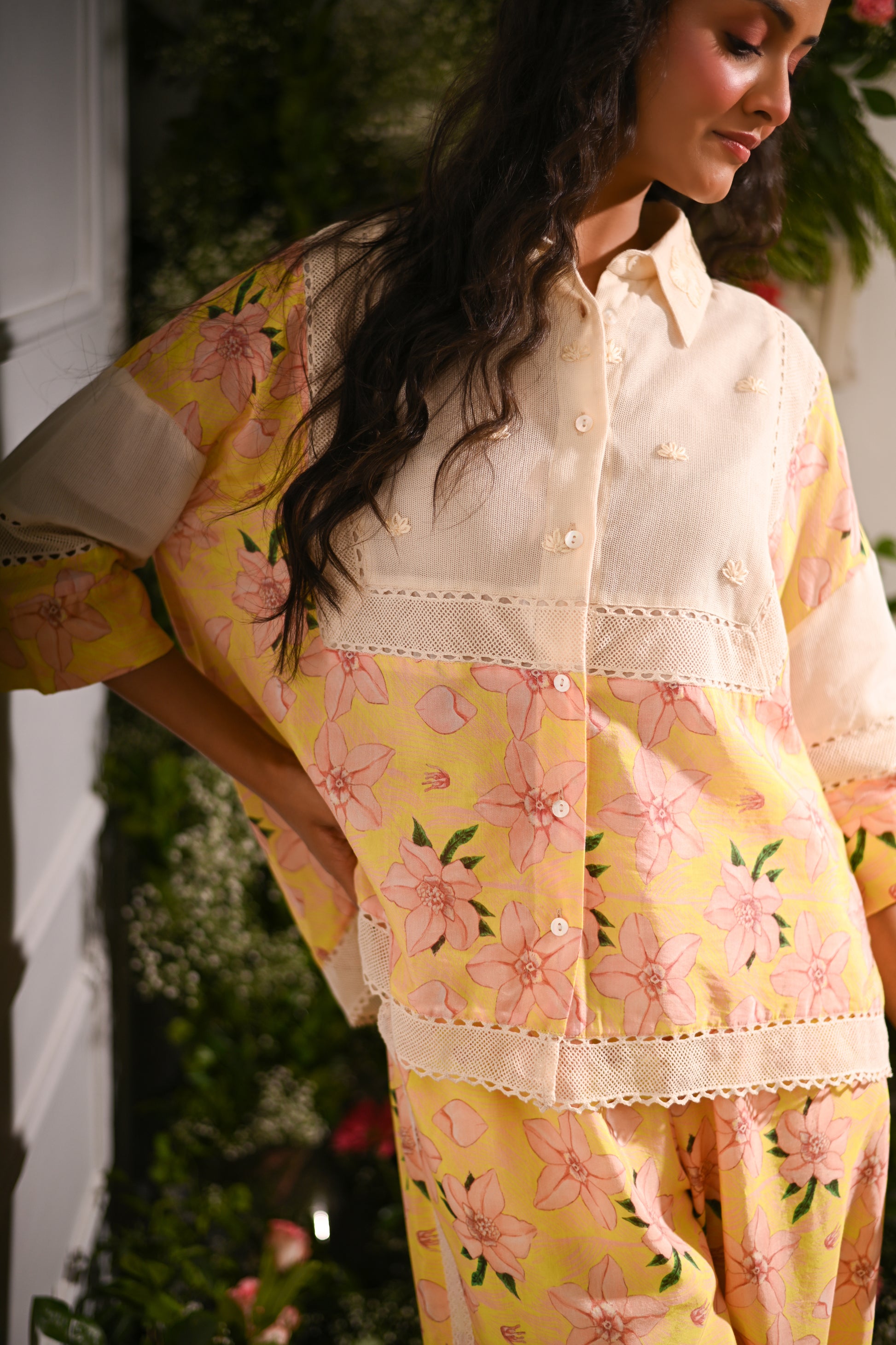 Our Winter Bloom Co-ord Set, crafted with exquisite detailing, offers a stylish and cosy look. This set features a printed patchwork embroidered button-up cropped shirt paired with pyjama-style trousers, complete with a fully elastic waistband. The full sleeves and elegant butter yellow and off-white colour combination add a touch of sophistication.