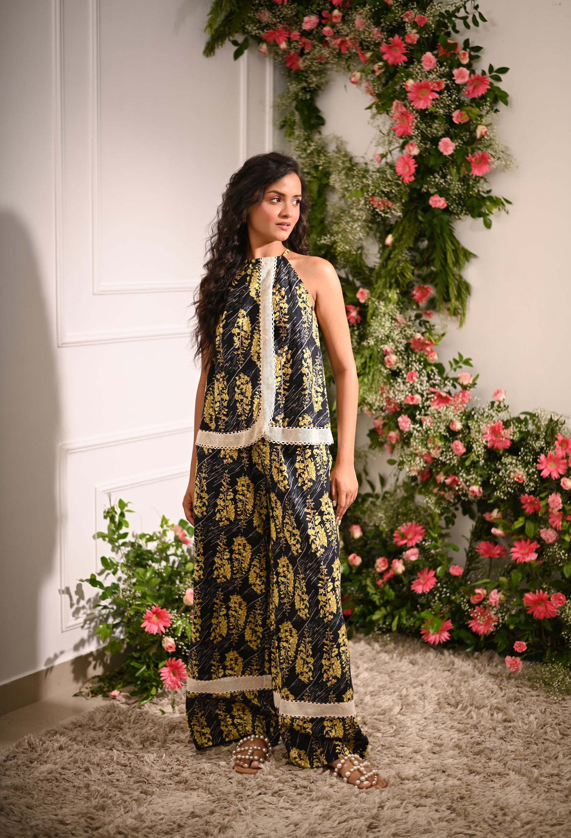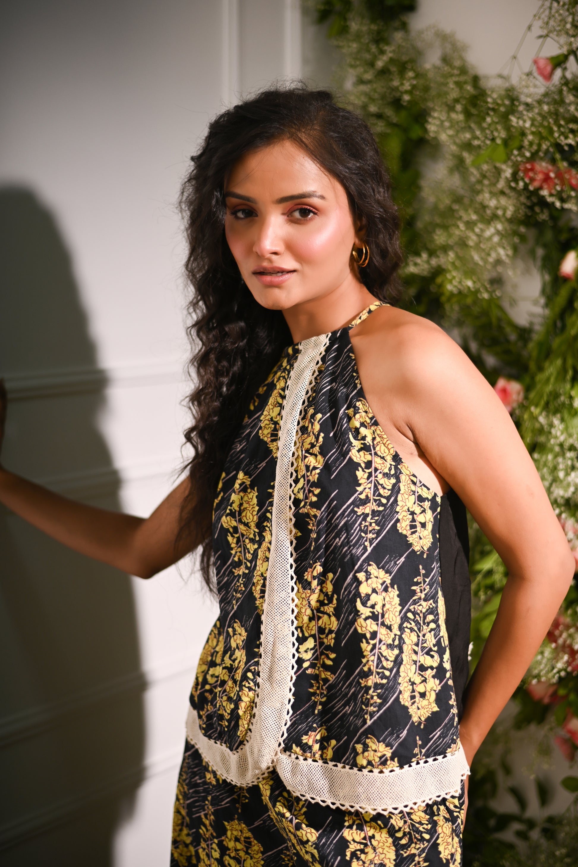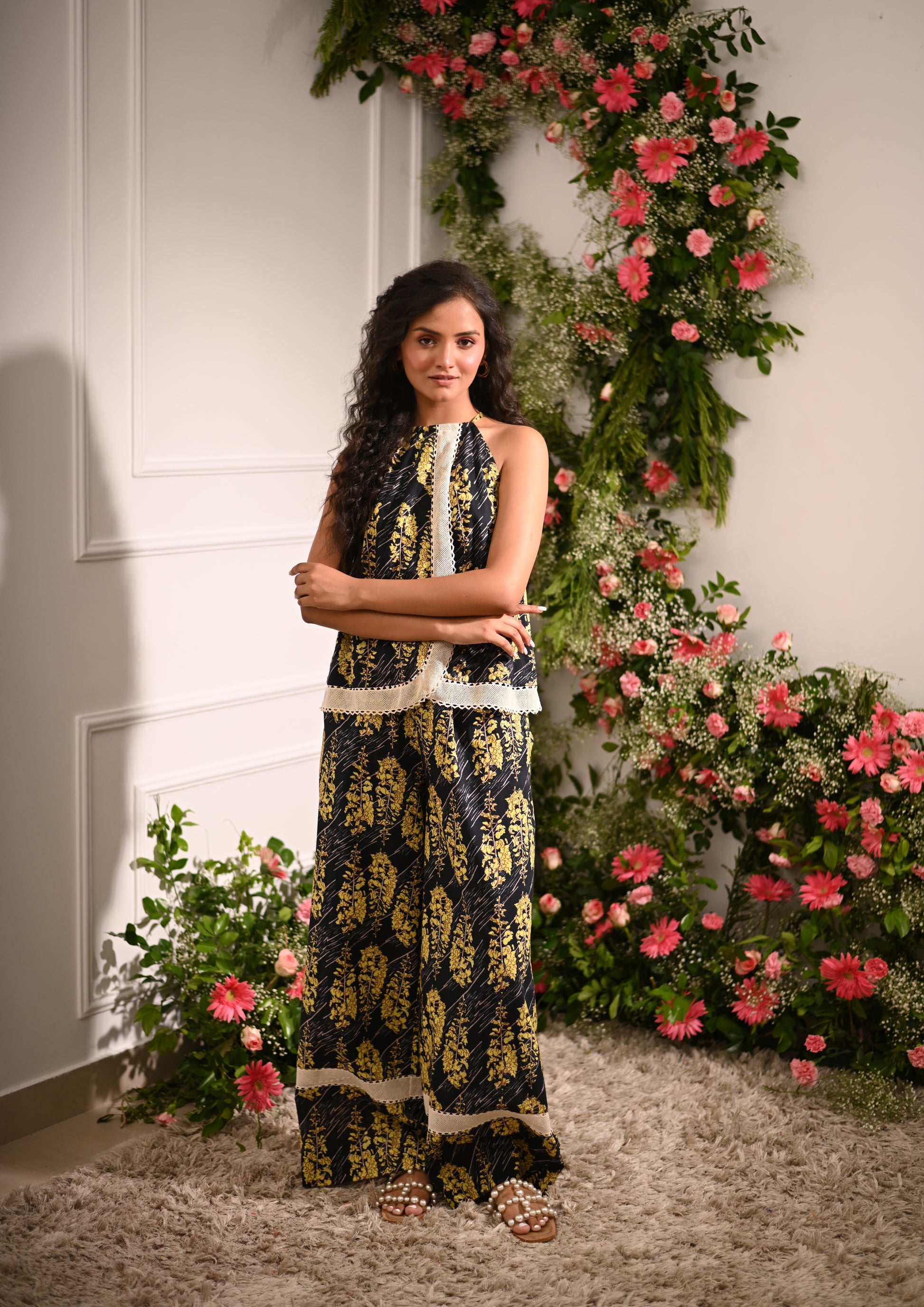 Our Wisteria Co-ord Set, crafted with exquisite detailing, offers a chic and modern look. This set features a printed halter top with lace detailing, paired with pyjama-style trousers featuring a fully elasticated waistband. The sleeveless top and bold black and yellow colour combination create a vibrant ensemble.
