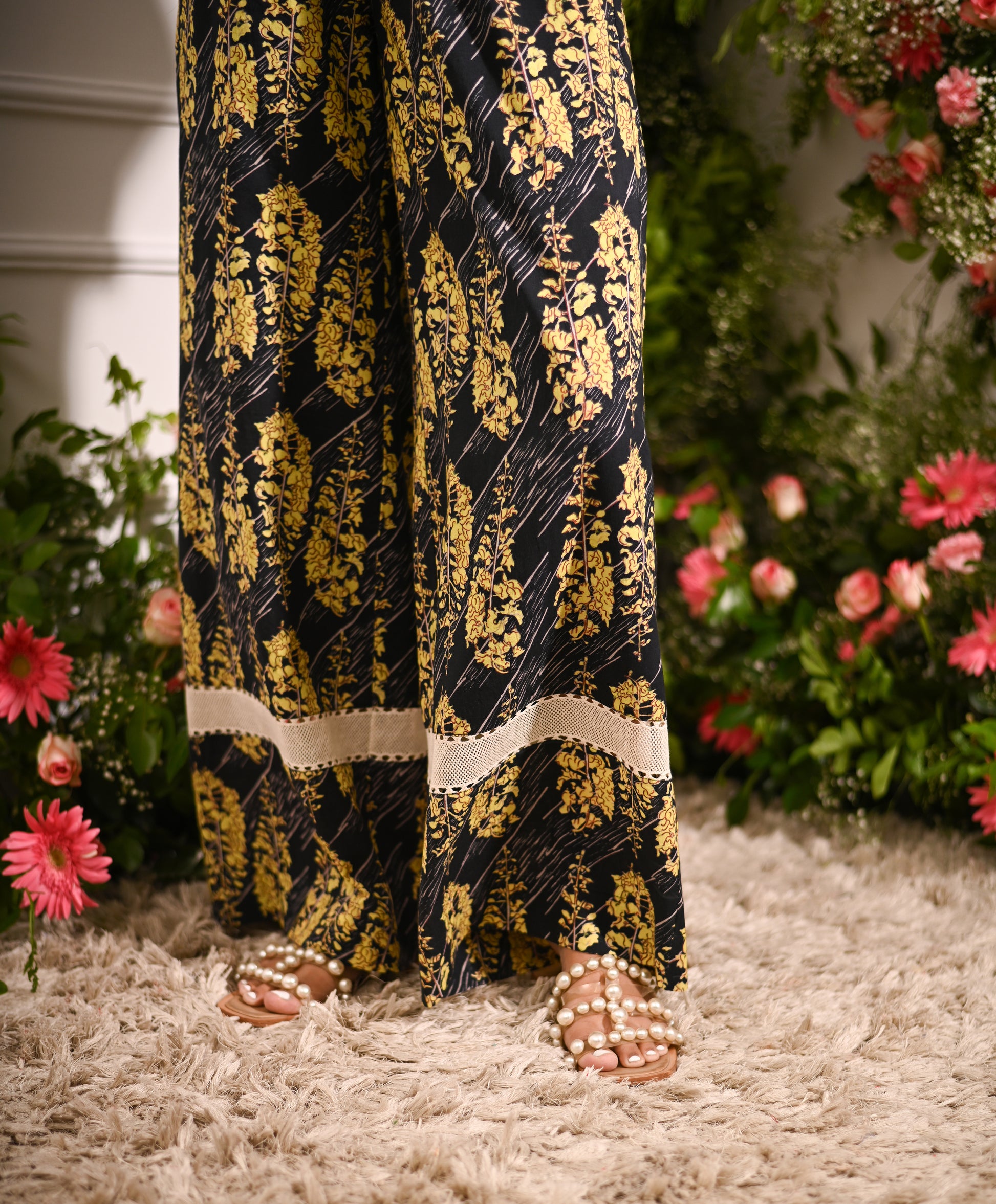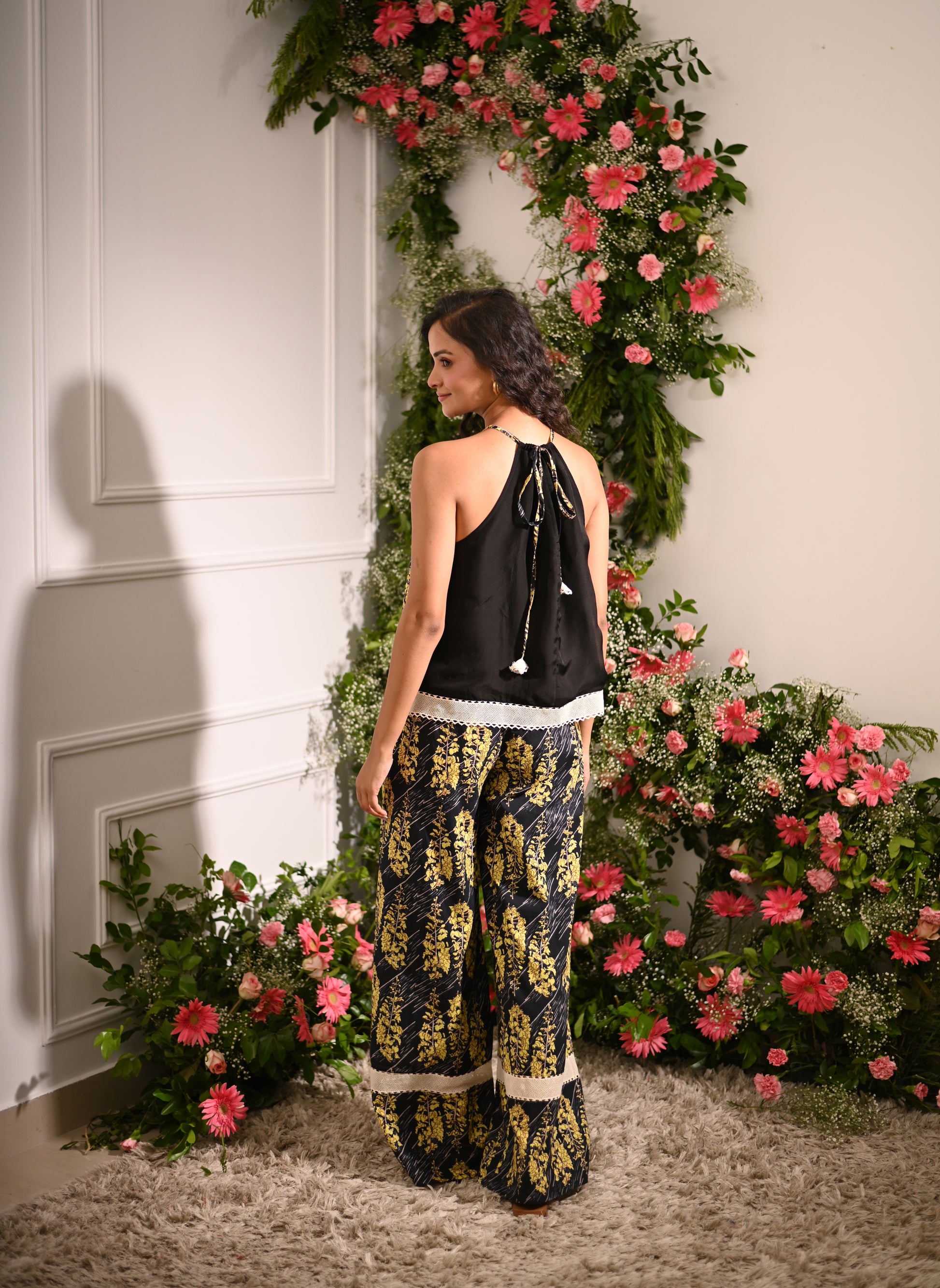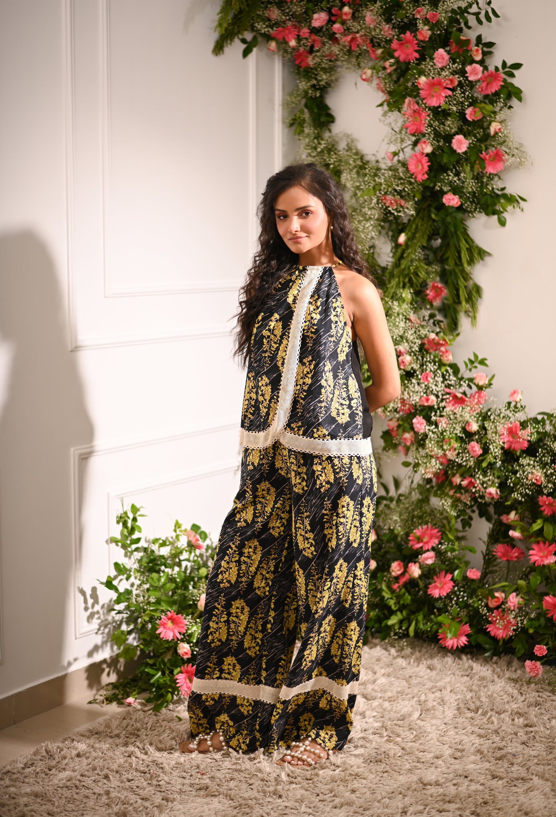Our Wisteria Co-ord Set, crafted with exquisite detailing, offers a chic and modern look. This set features a printed halter top with lace detailing, paired with pyjama-style trousers featuring a fully elasticated waistband. The sleeveless top and bold black and yellow colour combination create a vibrant ensemble.